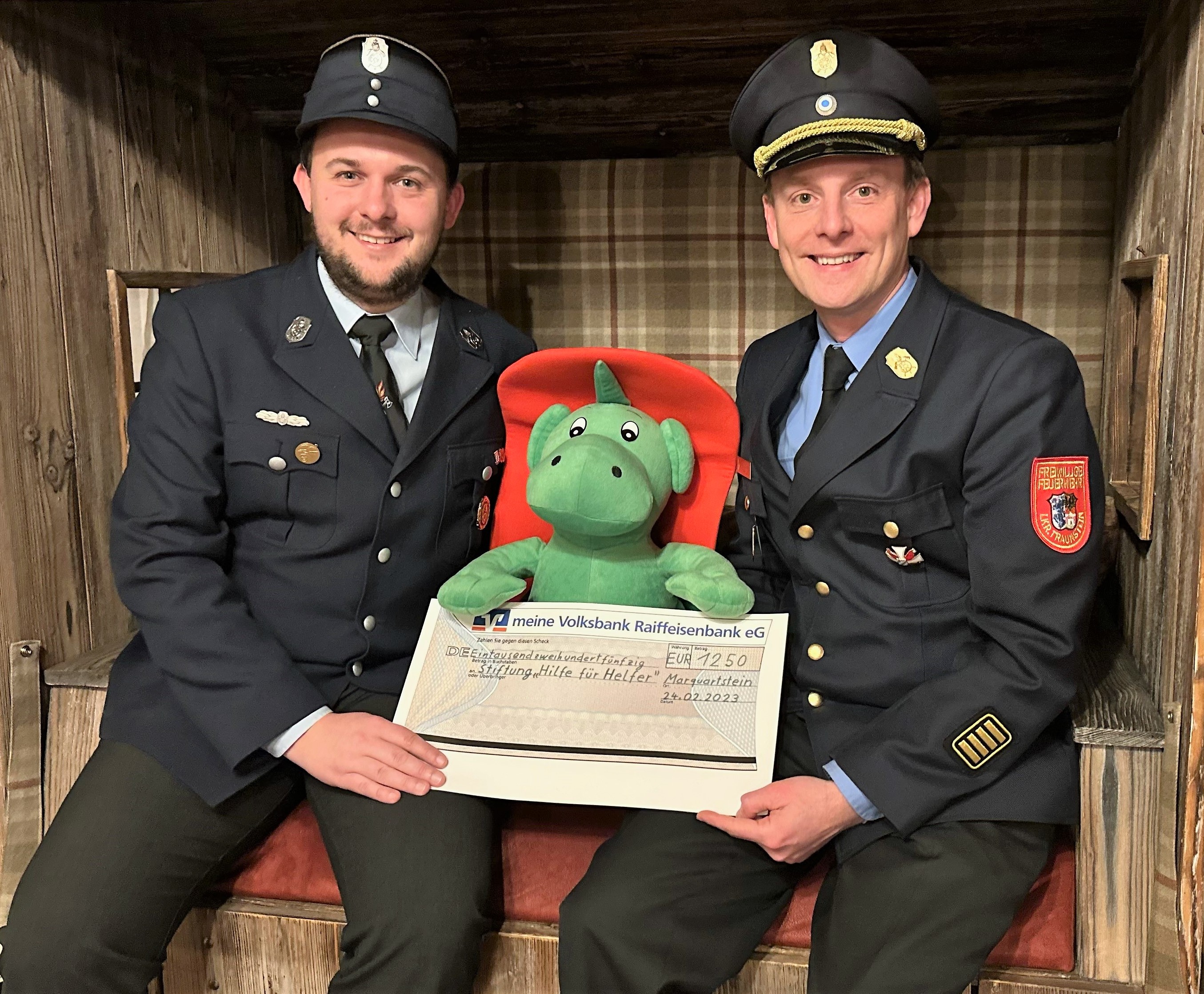Neben dem bewussten Verzicht auf Ehrengaben an die Gastvereine kamen noch die Einnahmen aus der Kollekte im Festgottesdienst hinzu. Somit konnte der Vorstand Simon Aigner im Rahmen der Jahreshauptversammlung der Feuerwehr Marquartstein eine Spende in Höhe von 1.250 Euro an den Traunsteiner Kreisbrandrat und stellvertretenden Vorsitzenden des Bezirksfeuerwehrverbandes Oberbayern, Christof Grundner, übergeben.