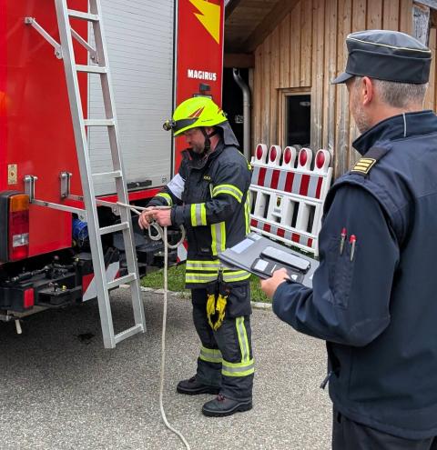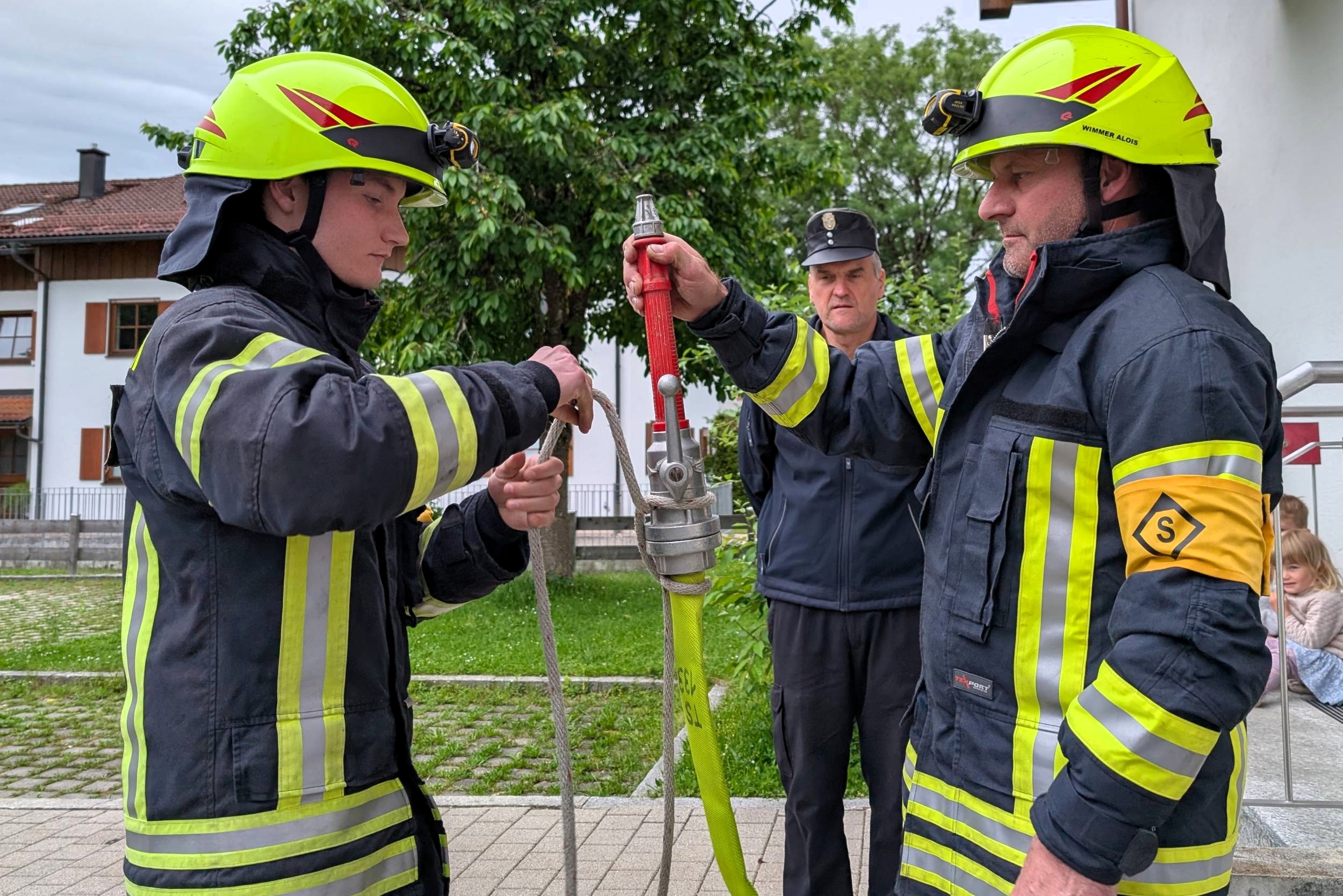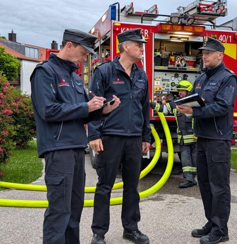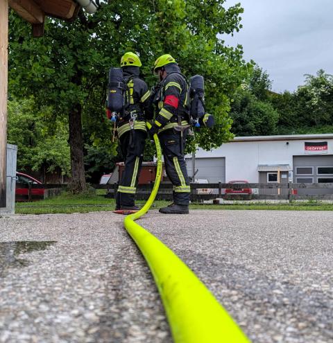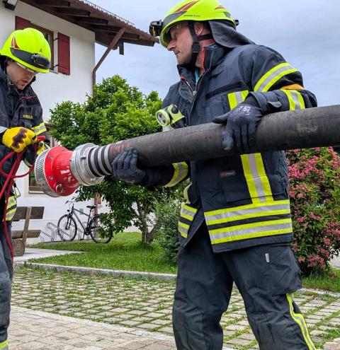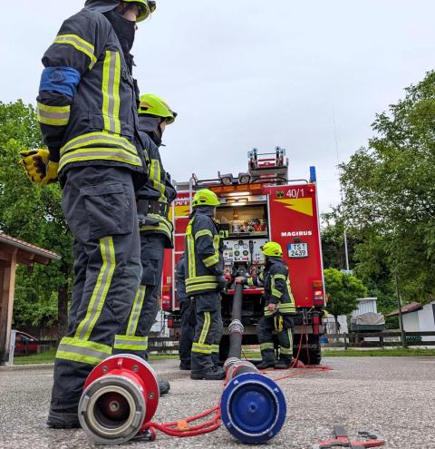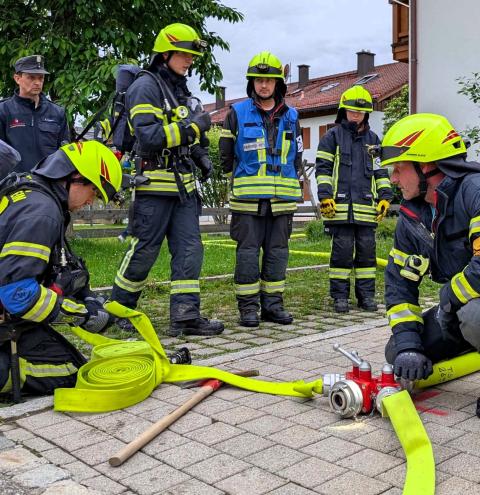 „Zimmerbrand – keine Menschenleben in Gefahr“, so begann der Befehl des Gruppenführers Tobias Heigermoser an die achtköpfige Mannschaft im Hauptteil der Prüfung. Innerhalb weniger Minuten musste eine Wasserversorgung vom Hydranten zum Fahrzeug erstellt und ein sogenannter Innenangriff zur Brandbekämpfung durch einen Atemschutztrupp durchgeführt werden. Ein weiterer Trupp machte sich unterdessen als „Sicherungstrupp einsatzbereit. Darüber hinaus wurde der Befehl für ein „zweites Rohr“ gegeben, der die Flammen – dargestellt von Eimern - von außen bekämpfte“.