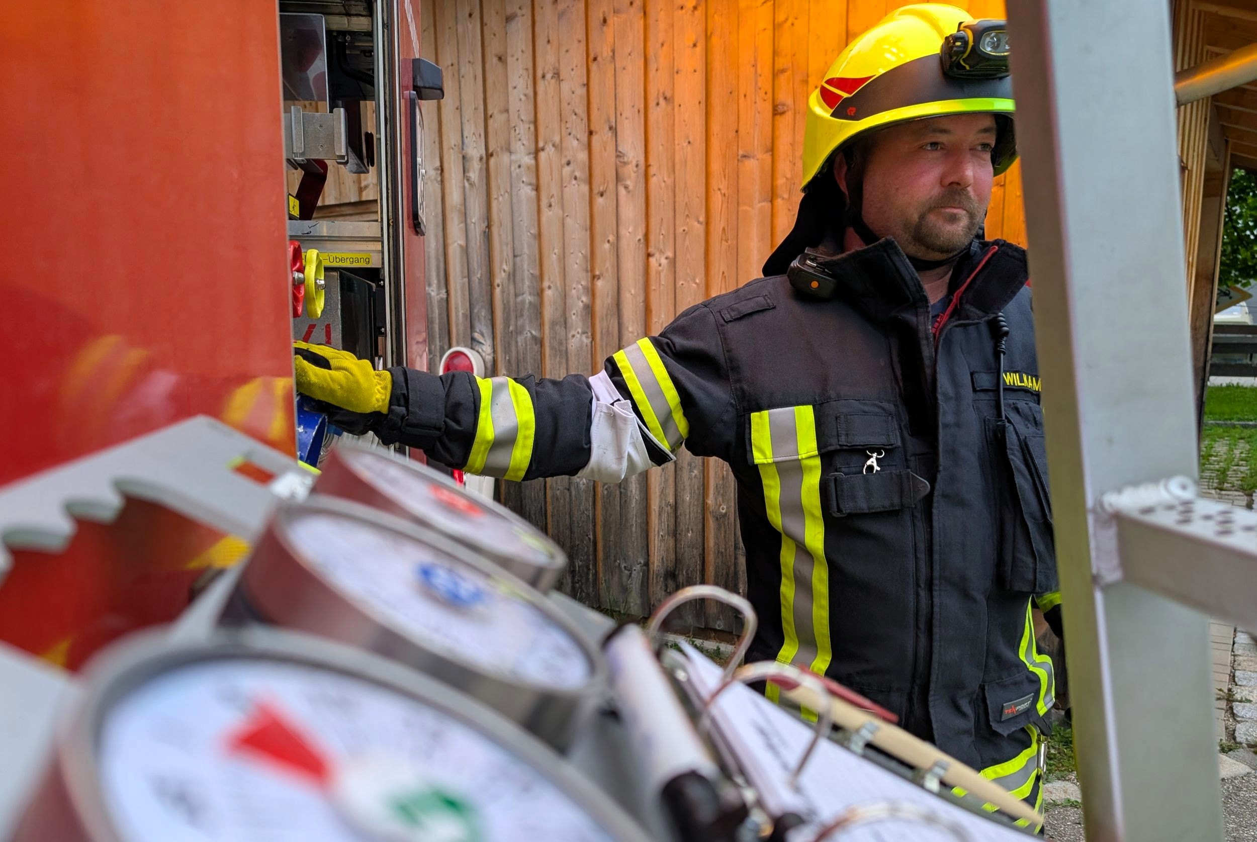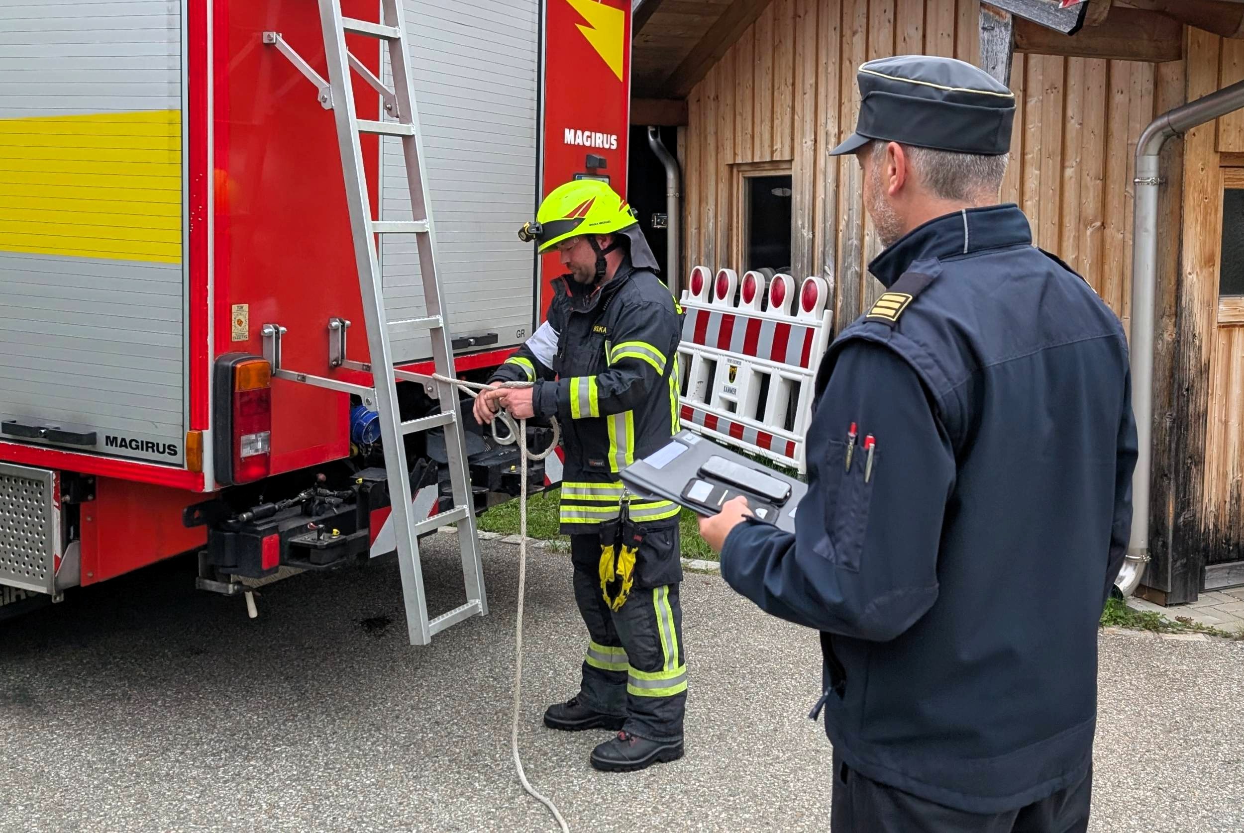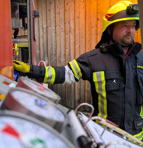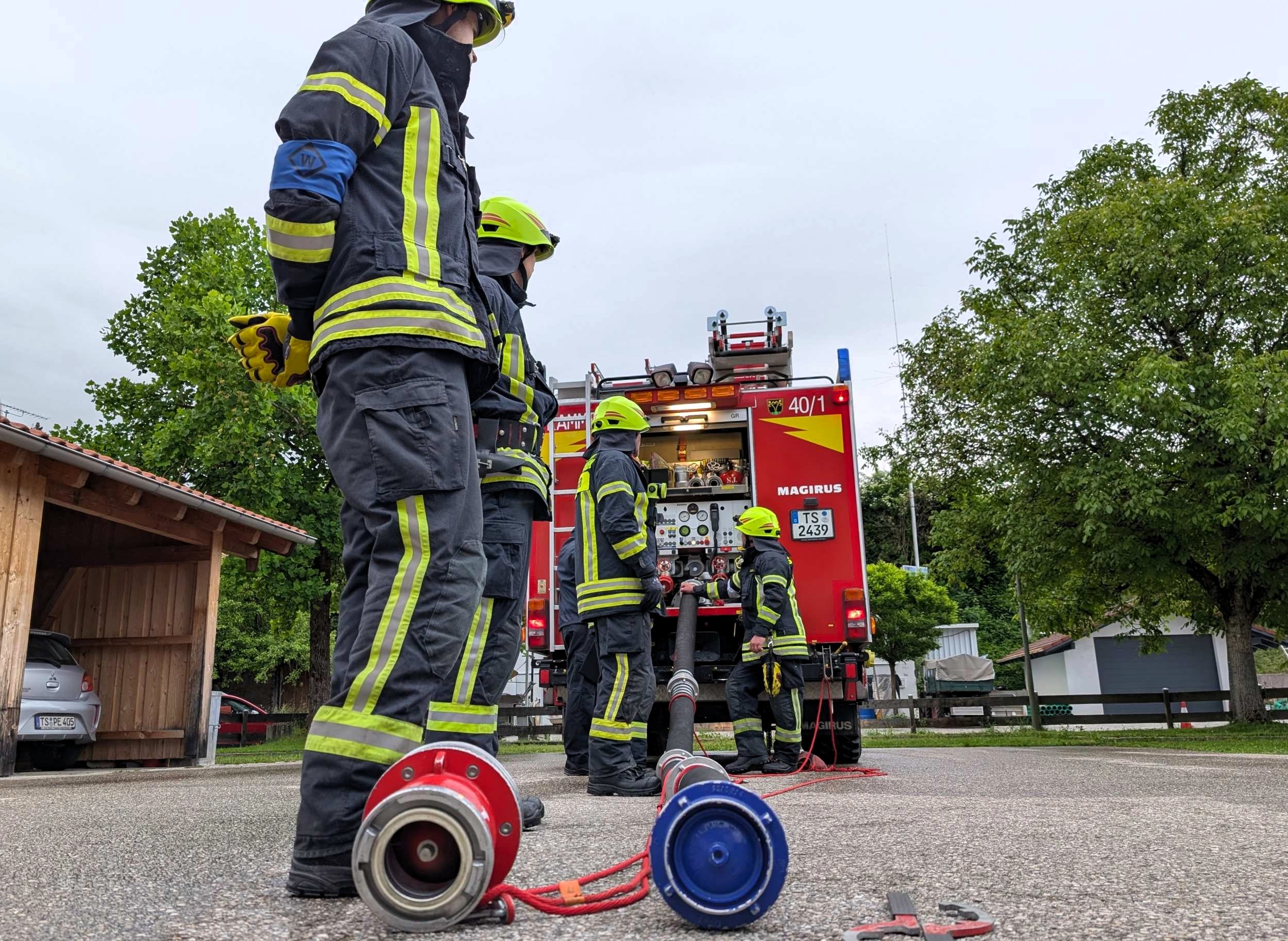 „Zimmerbrand – keine Menschenleben in Gefahr“, so begann der Befehl des Gruppenführers Tobias Heigermoser an die achtköpfige Mannschaft im Hauptteil der Prüfung. Innerhalb weniger Minuten musste eine Wasserversorgung vom Hydranten zum Fahrzeug erstellt und ein sogenannter Innenangriff zur Brandbekämpfung durch einen Atemschutztrupp durchgeführt werden. Ein weiterer Trupp machte sich unterdessen als „Sicherungstrupp einsatzbereit. Darüber hinaus wurde der Befehl für ein „zweites Rohr“ gegeben, der die Flammen – dargestellt von Eimern - von außen bekämpfte“.
