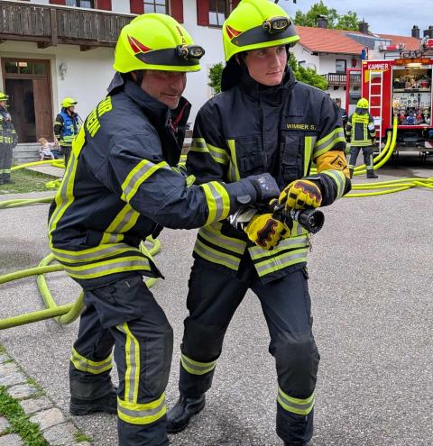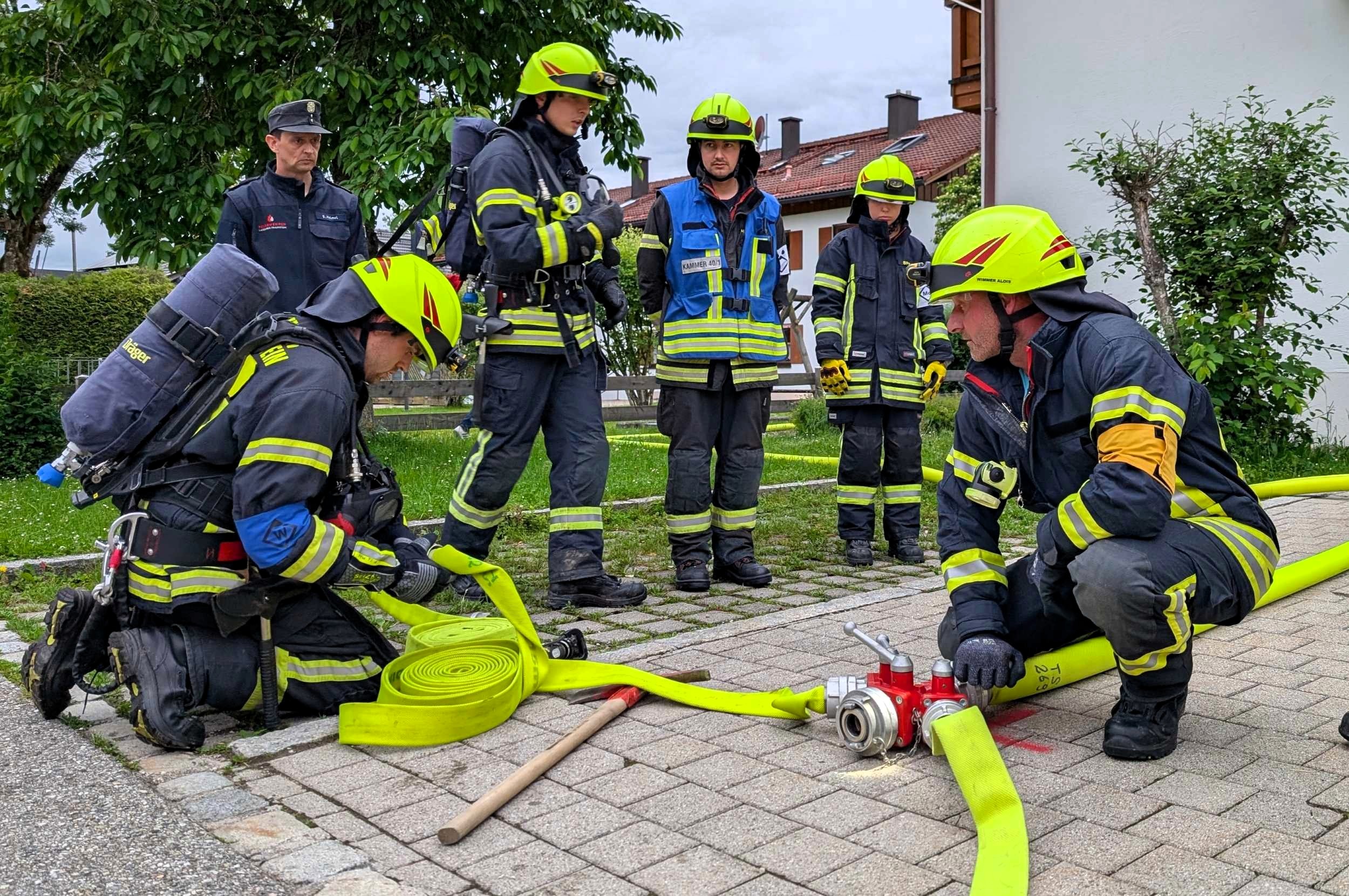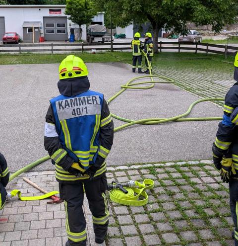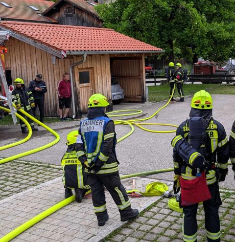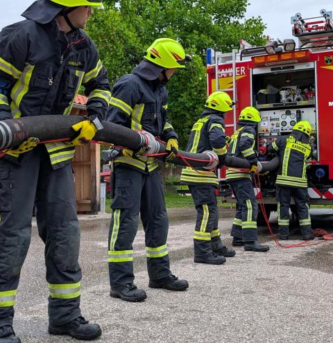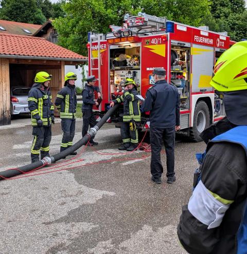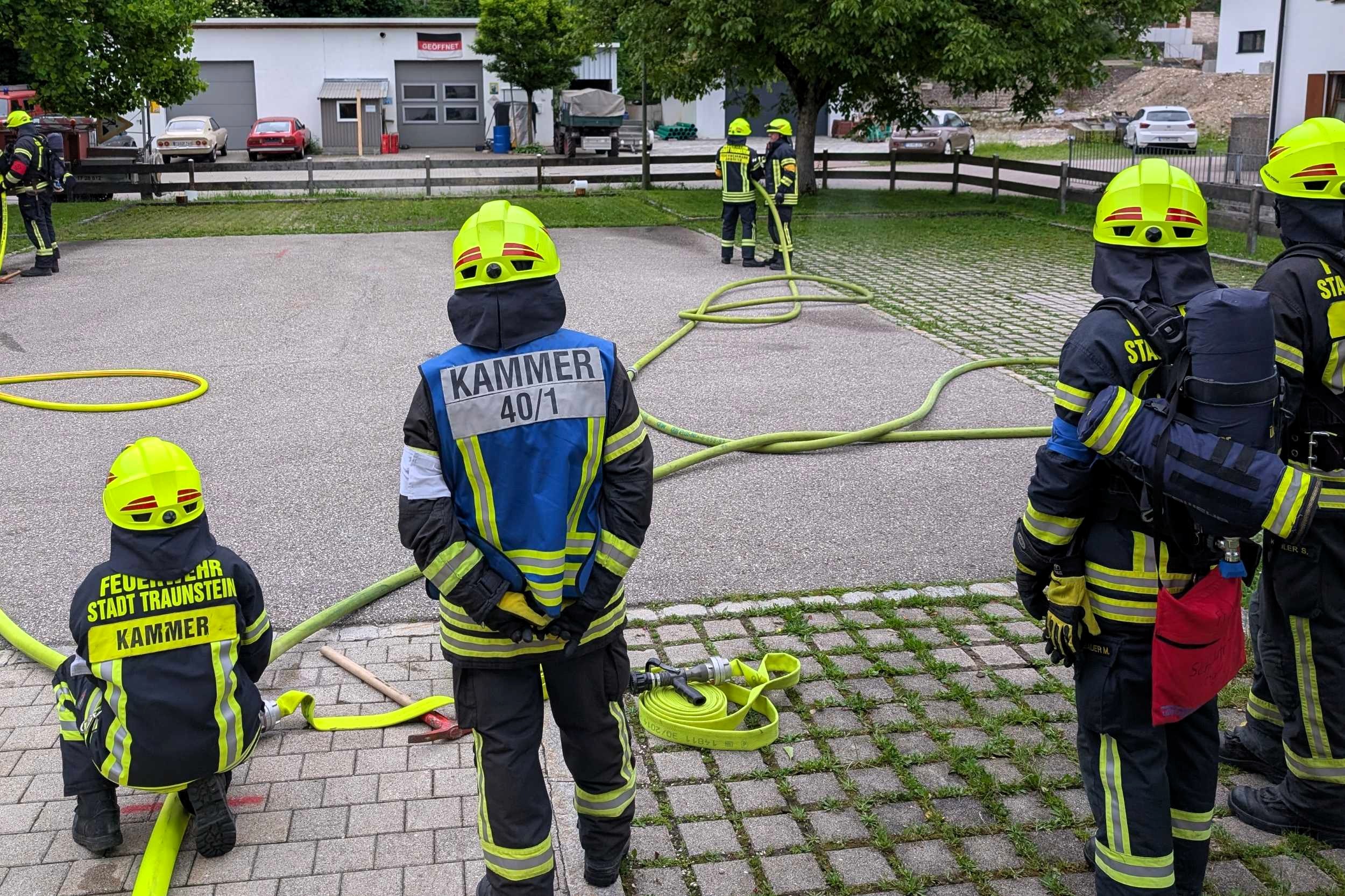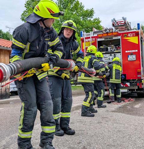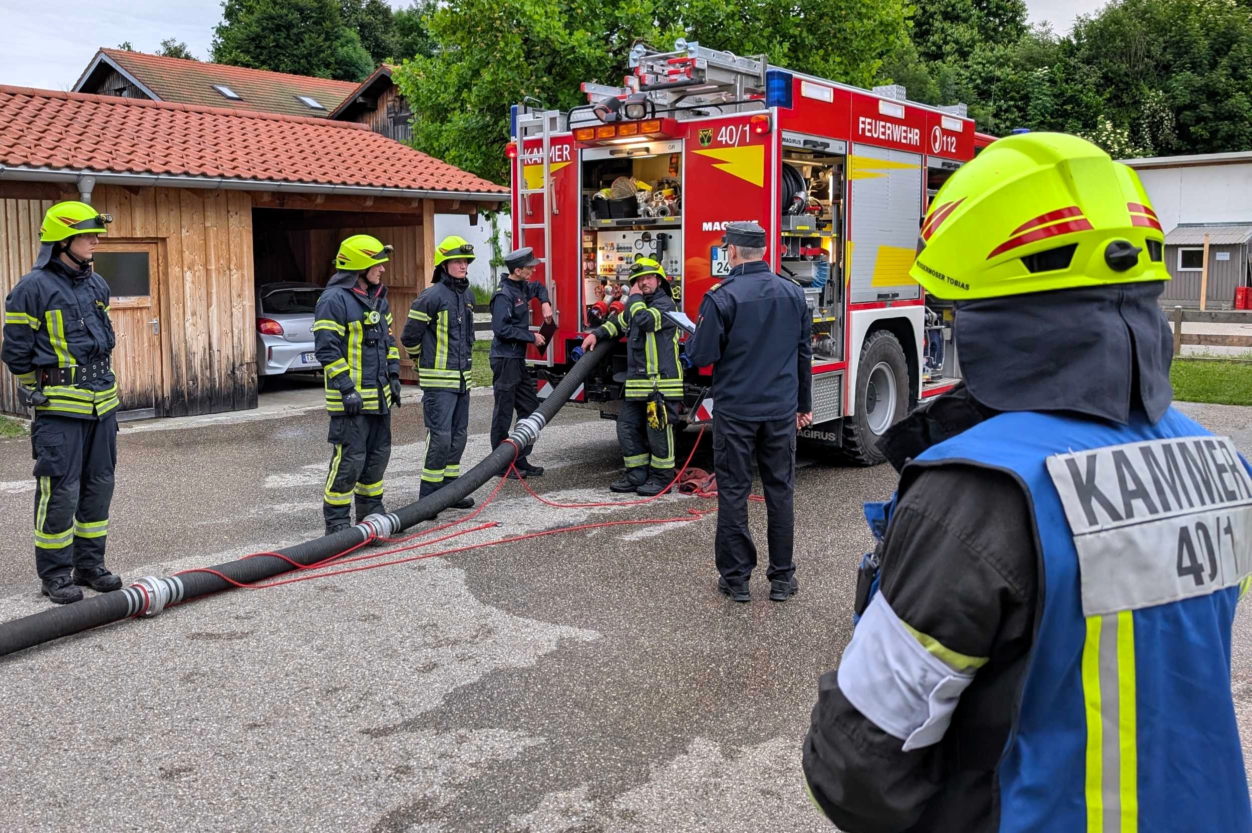 Traunstein, Kammer. Die Aktiven der Feuerwehr hatten bei der Manöverkritik durch die Schiedsrichter des Kreisfeuerwehrverbandes Traunstein allen Grund zur Freude. „Wir gratulieren zur hervorragend bestandenen Leistungsprüfung“, so das Abschlussfazit von Kreisbrandinspektor Martin Schupfner unmittelbar im Anschluss an die mehrteilige Prüfung des Leistungsabzeichens „Die Gruppe im Löscheinsatz“. Als Kernaufgabe mussten die Floriansjünger einen kompletten Löschaufbau samt Atemschutzeinsatz vorzeigen und einen angenommenen Zimmerbrand löschen.