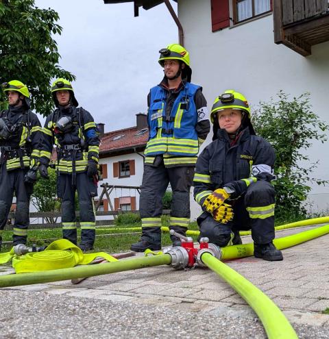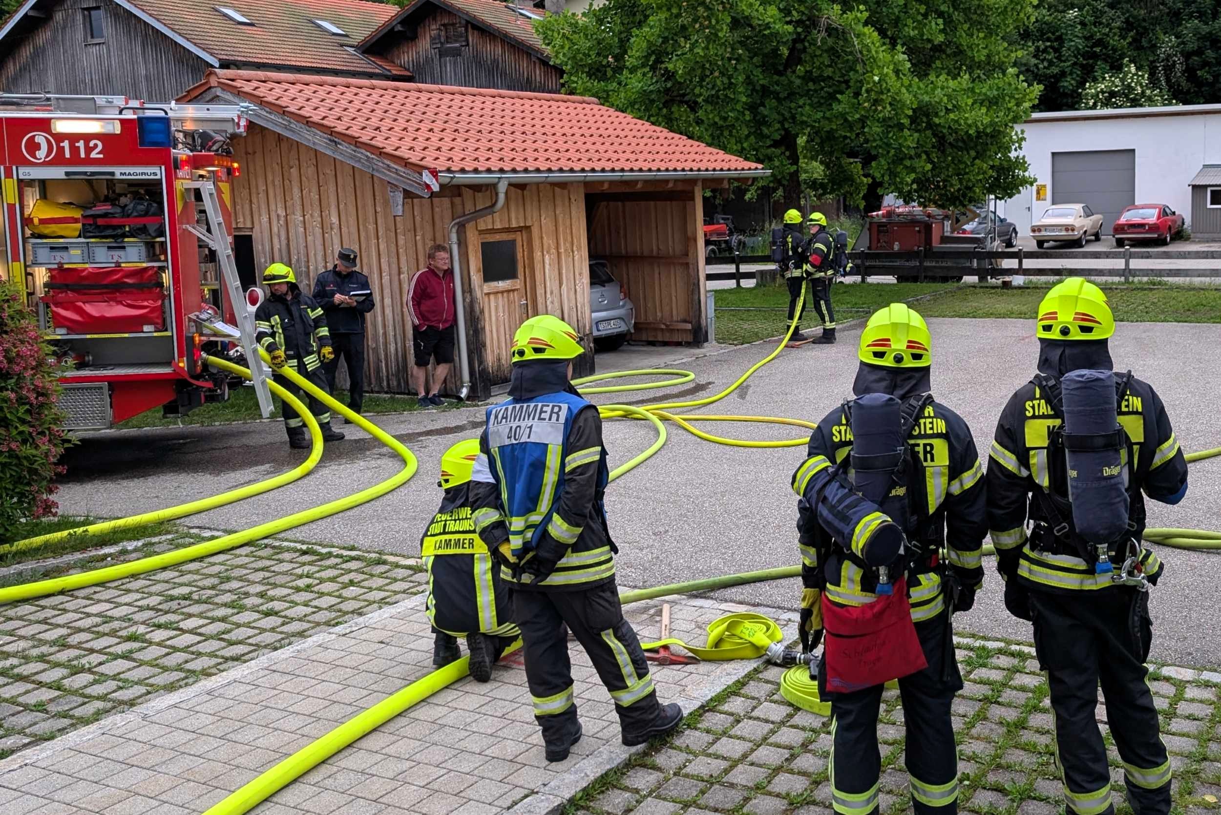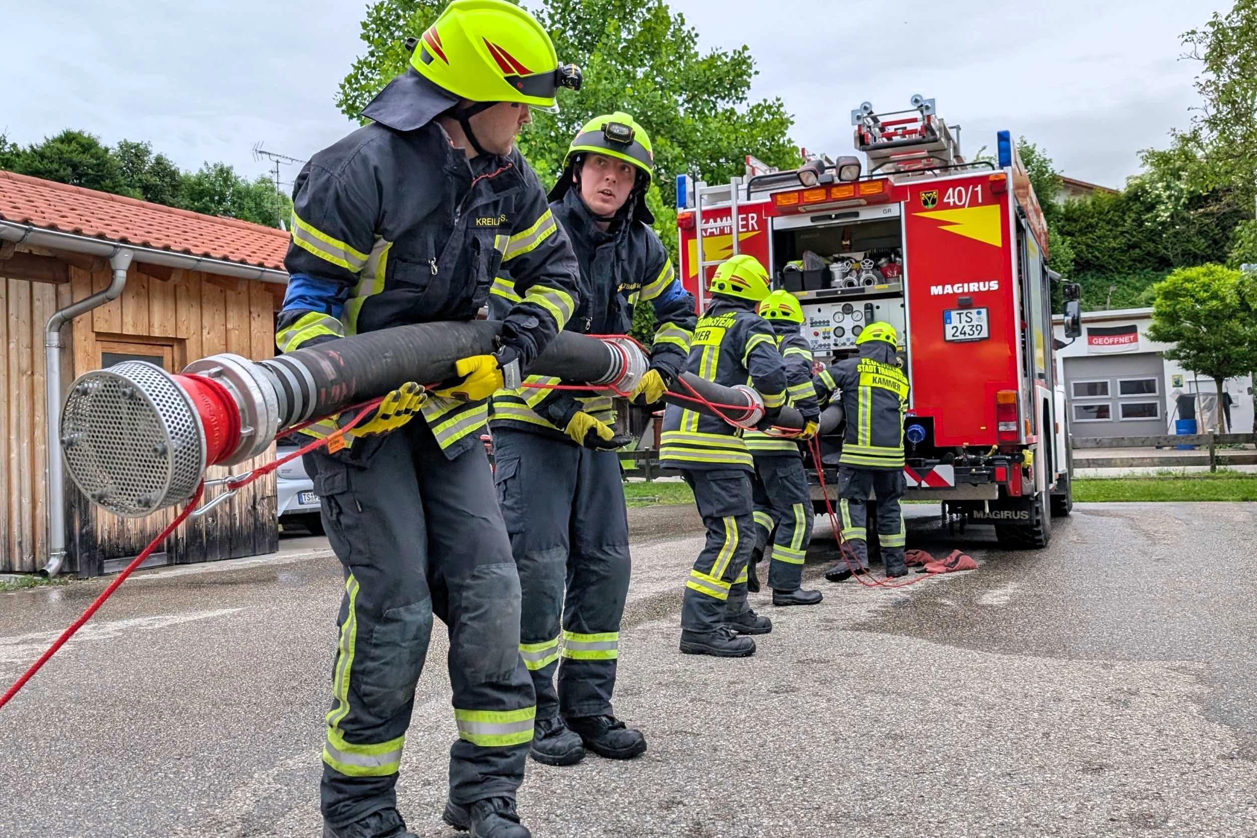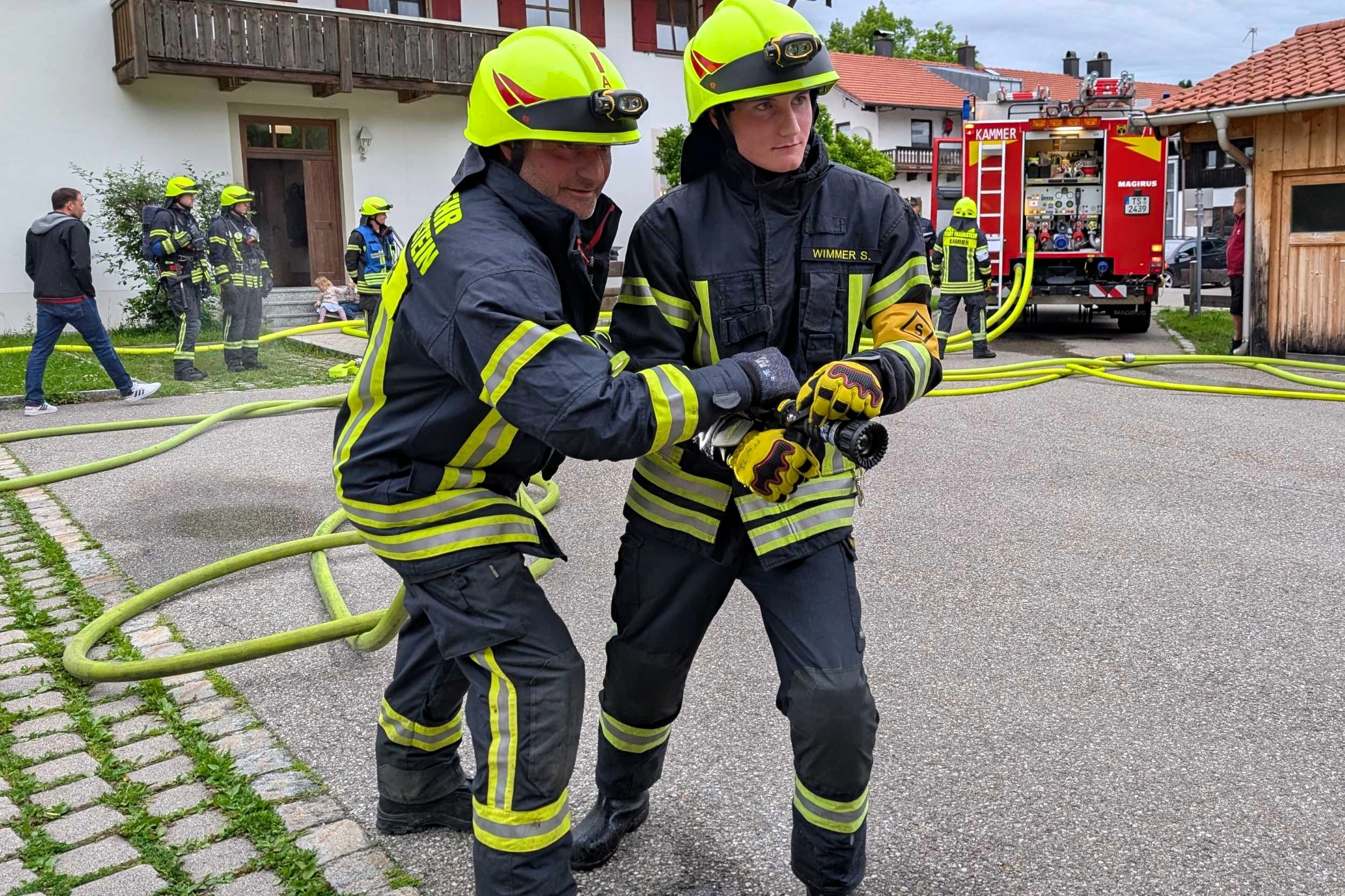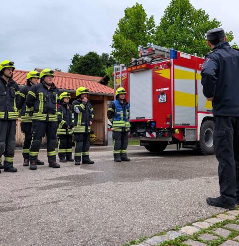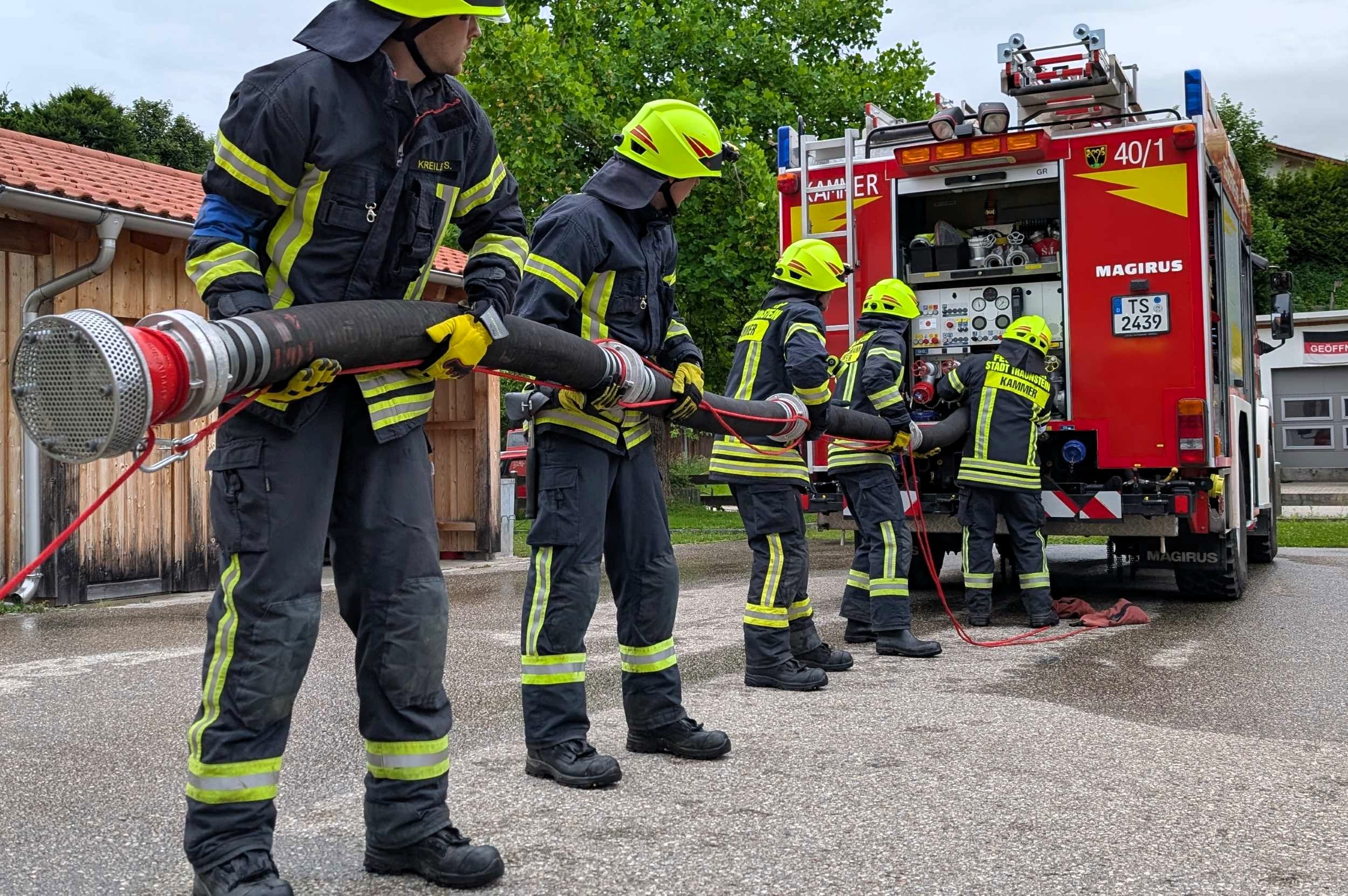 Traunstein, Kammer. Die Aktiven der Feuerwehr hatten bei der Manöverkritik durch die Schiedsrichter des Kreisfeuerwehrverbandes Traunstein allen Grund zur Freude. „Wir gratulieren zur hervorragend bestandenen Leistungsprüfung“, so das Abschlussfazit von Kreisbrandinspektor Martin Schupfner unmittelbar im Anschluss an die mehrteilige Prüfung des Leistungsabzeichens „Die Gruppe im Löscheinsatz“. Als Kernaufgabe mussten die Floriansjünger einen kompletten Löschaufbau samt Atemschutzeinsatz vorzeigen und einen angenommenen Zimmerbrand löschen.