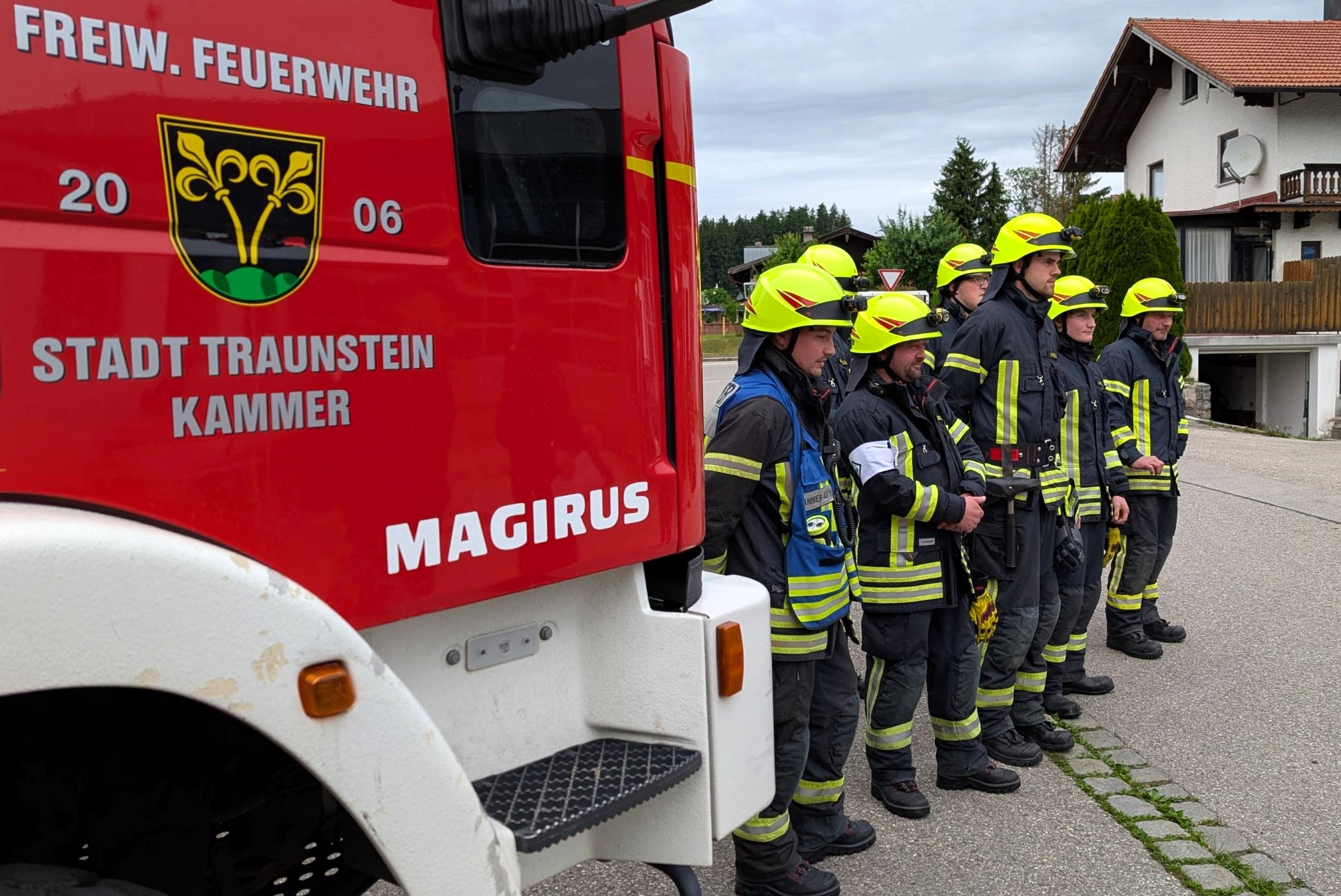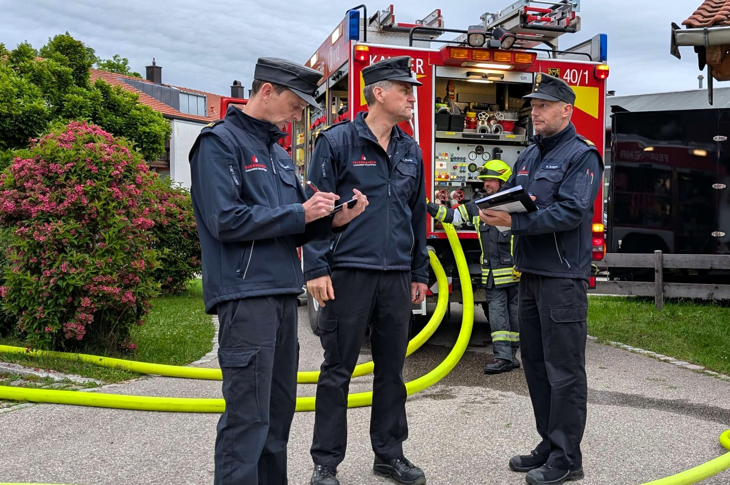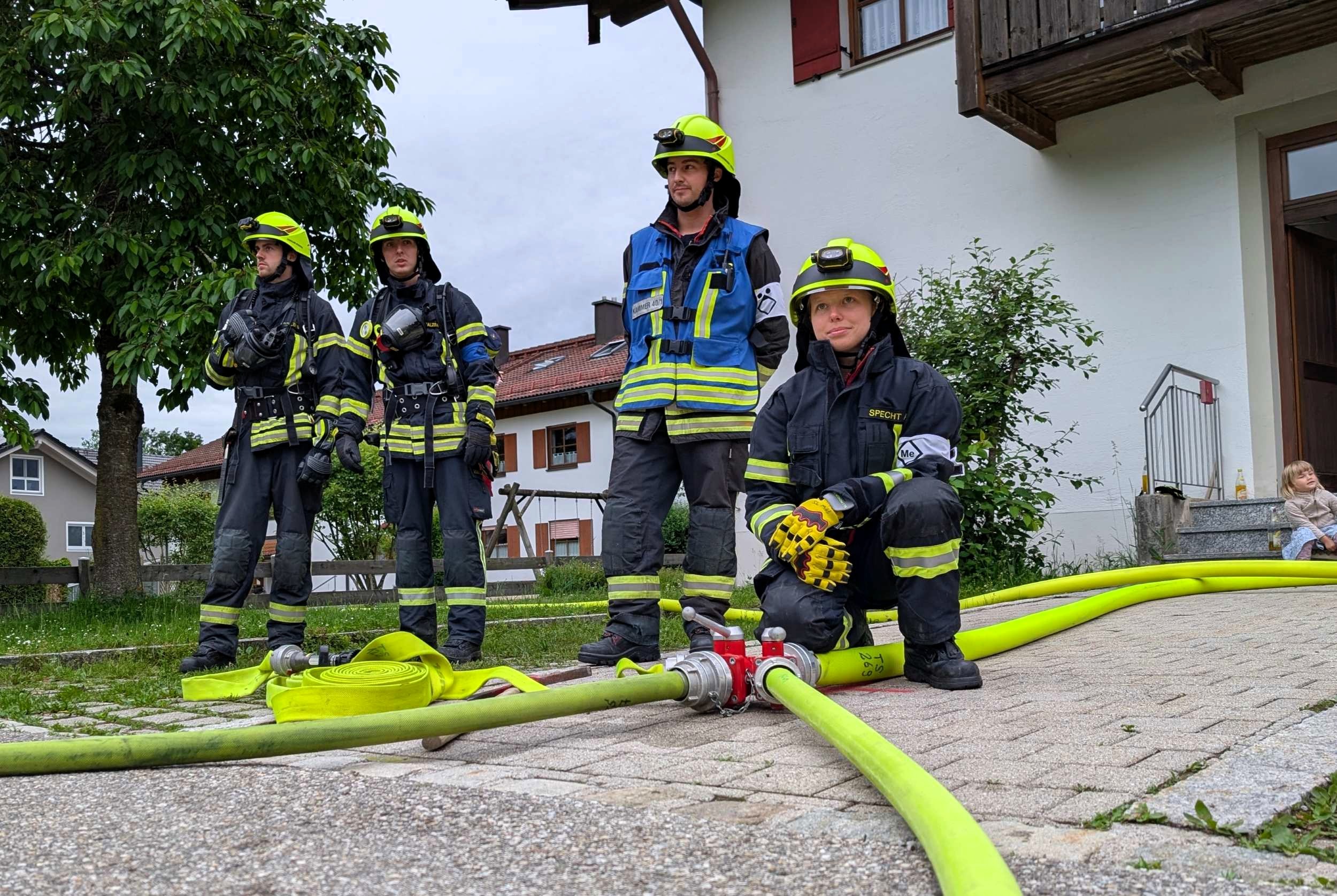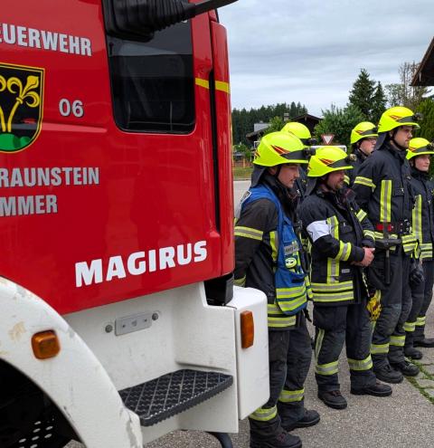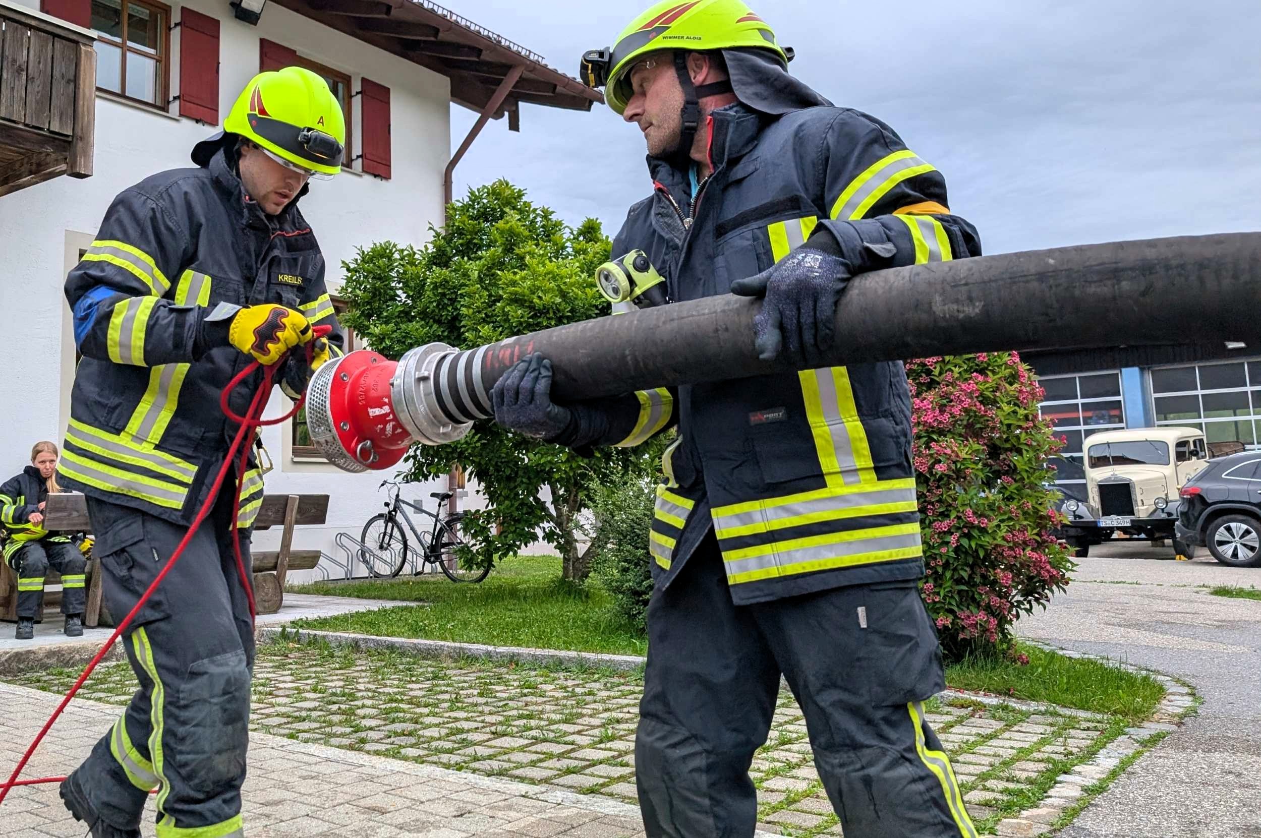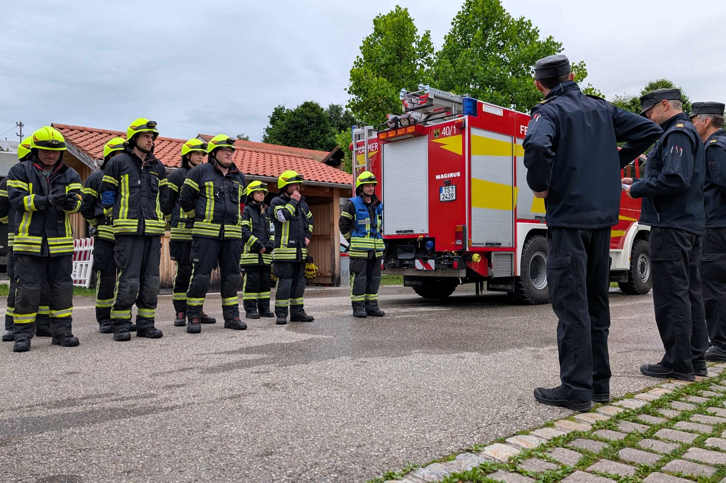 Traunstein, Kammer. Die Aktiven der Feuerwehr hatten bei der Manöverkritik durch die Schiedsrichter des Kreisfeuerwehrverbandes Traunstein allen Grund zur Freude. „Wir gratulieren zur hervorragend bestandenen Leistungsprüfung“, so das Abschlussfazit von Kreisbrandinspektor Martin Schupfner unmittelbar im Anschluss an die mehrteilige Prüfung des Leistungsabzeichens „Die Gruppe im Löscheinsatz“. Als Kernaufgabe mussten die Floriansjünger einen kompletten Löschaufbau samt Atemschutzeinsatz vorzeigen und einen angenommenen Zimmerbrand löschen.