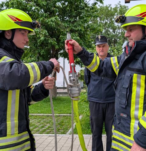 Während die Mannschaft in Reih und Glied an der angefertigten Leitung stand, überwachten die Schiedsrichter exakt die Zeit sowie die Zeiger an den Manometern der Pumpe. Als der erlösende Auftrag „Abbauen“ ausgesprochen wurde stand fest, die Prüfung war bestanden. Zum Abschluss erfolgte durch die beiden Kreisbrandmeister Stefan Helmel und Albert Rieder sowie Kreisbrandinspektor Martin Schupfner noch ein kurzes Feedback, ehe die Prüflinge ihre Abzeichen in Form von Plaketten für die Uniform entgegennehmen durften.