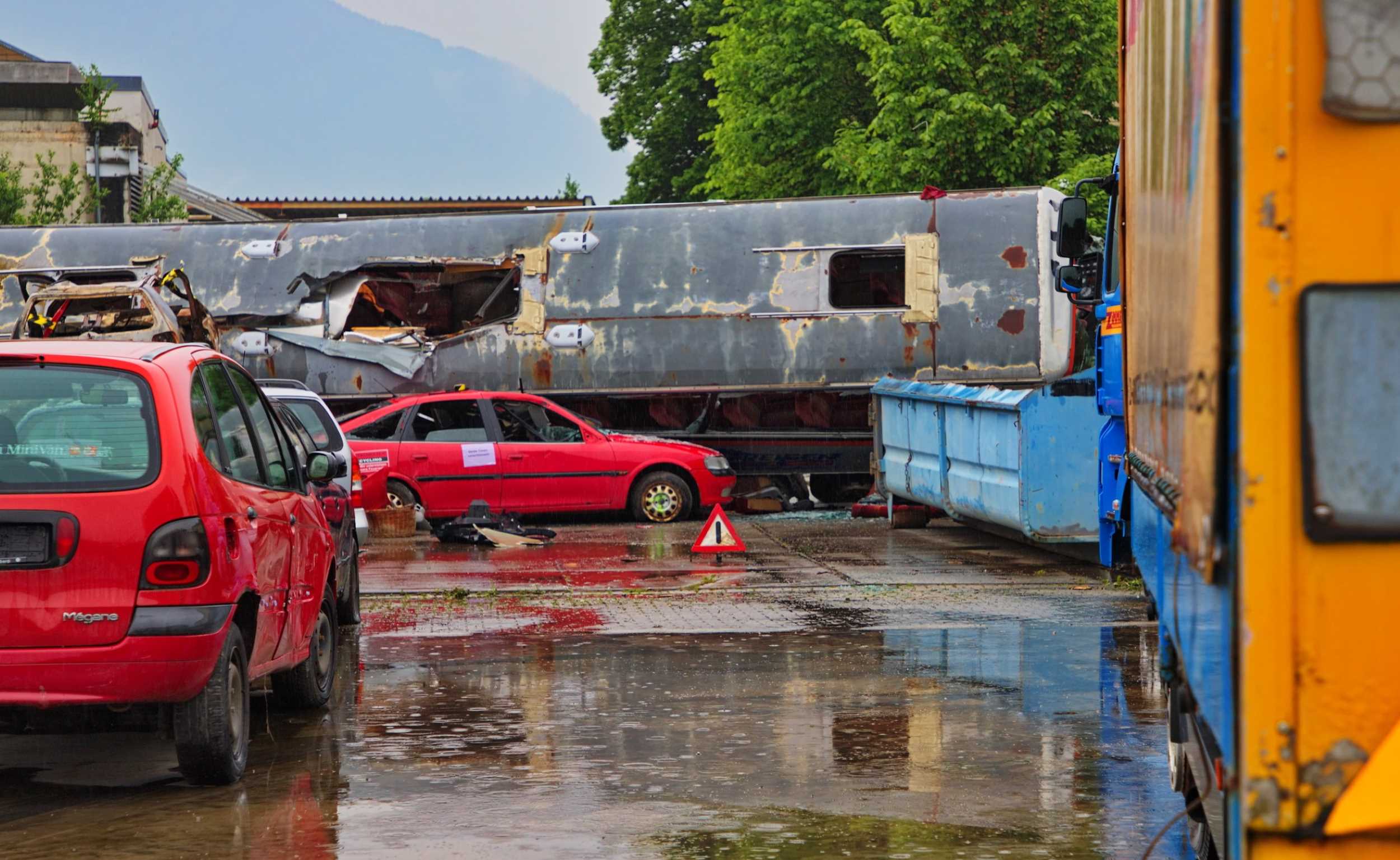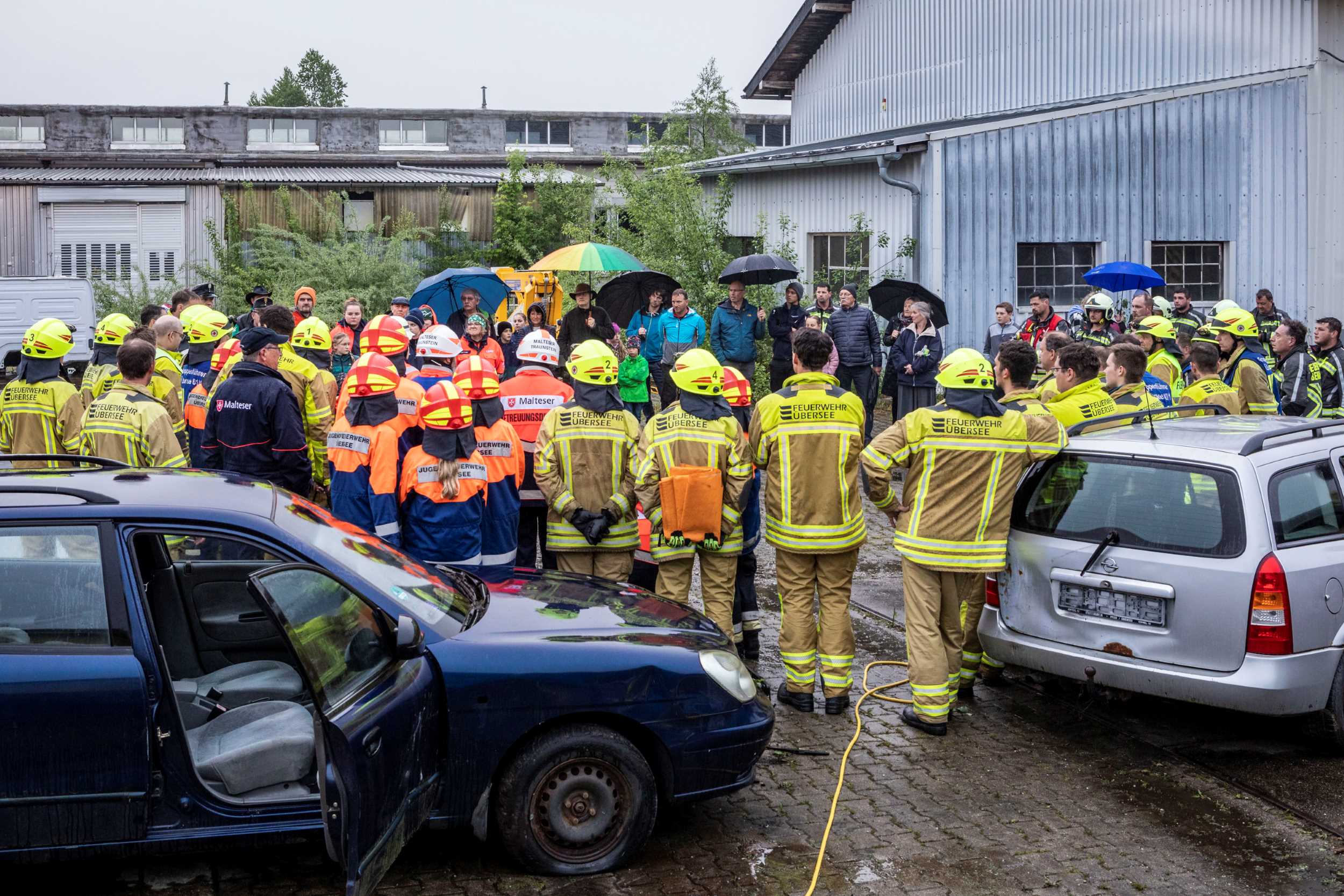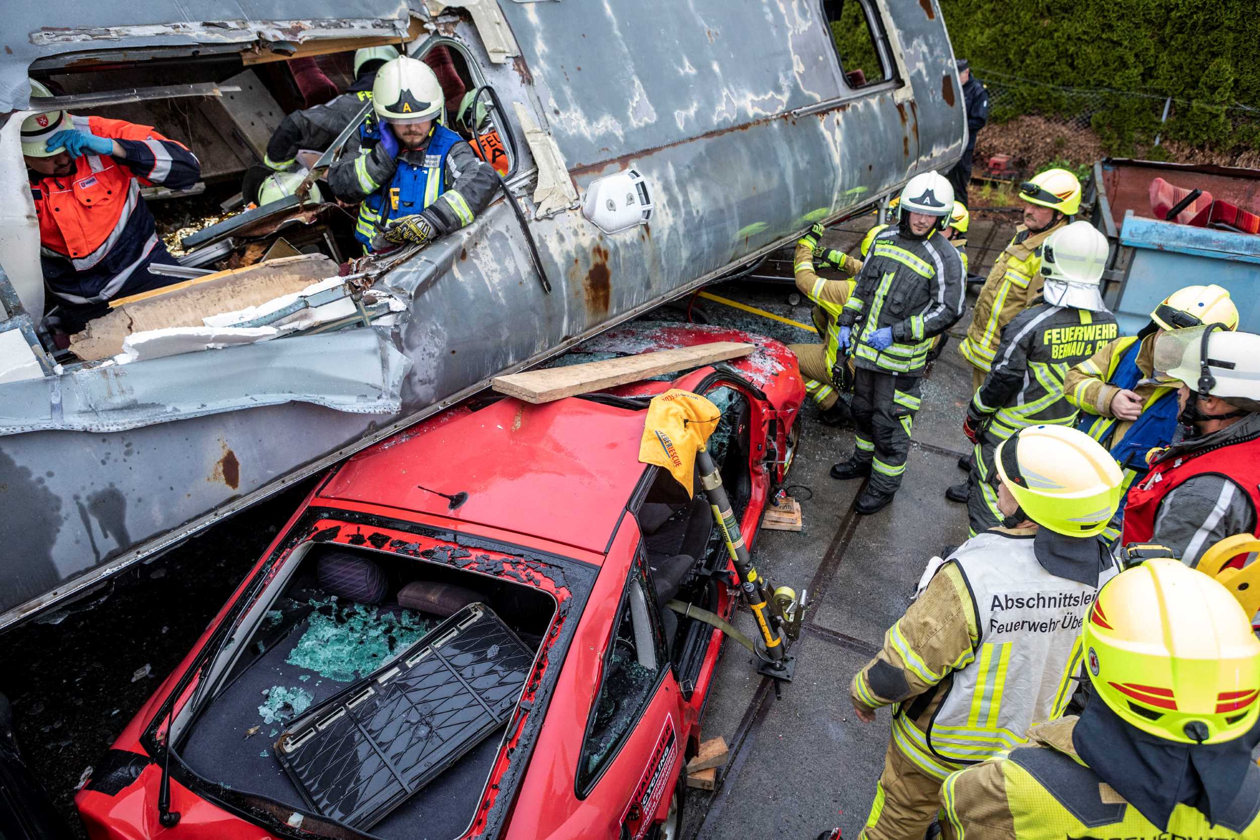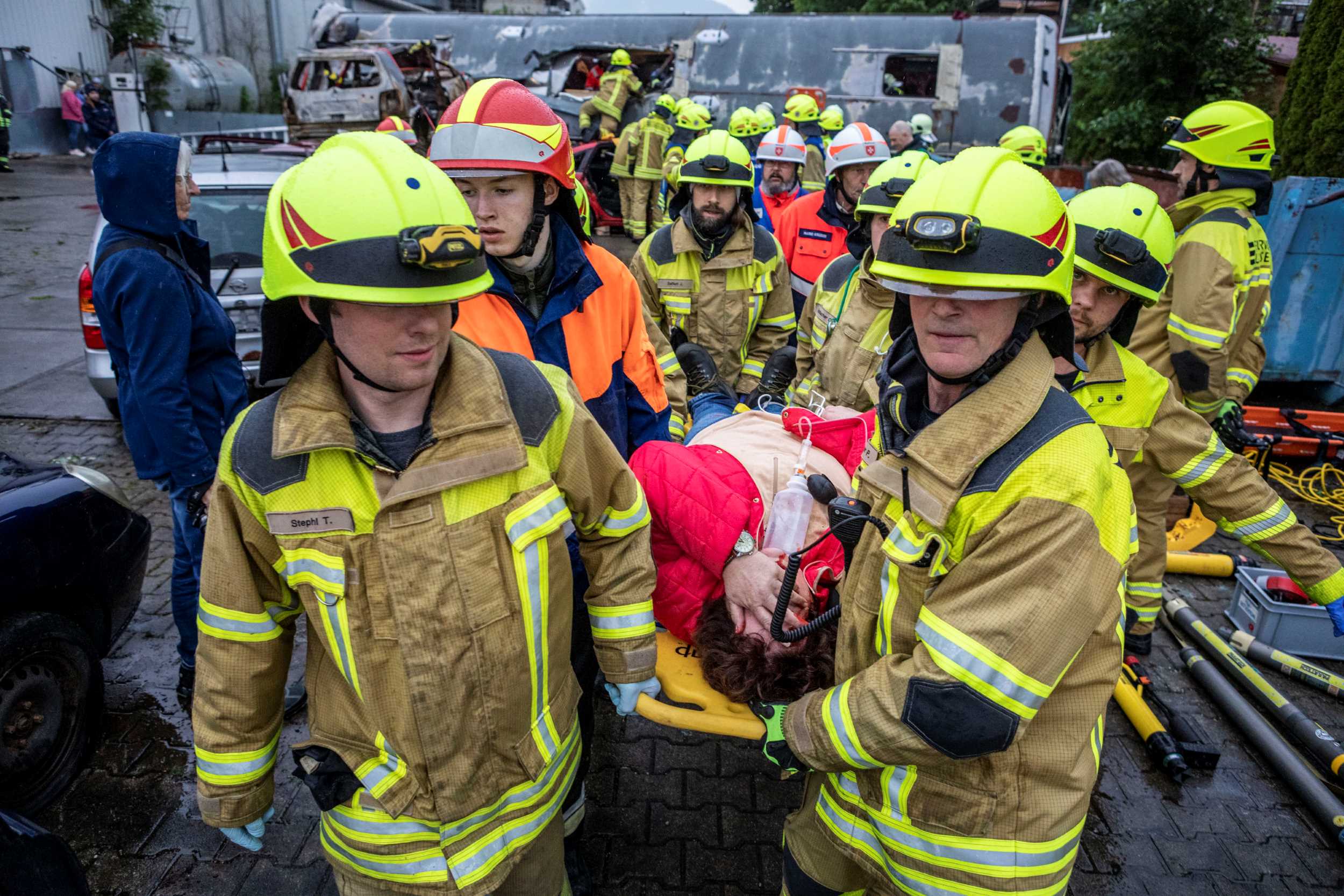 Die größte Herausforderung für die Floriansjünger war eine aufwendige Rettung von zwei Schwerverletzten aus dem Bus sowie einer jungen Frau, die unter dem Bus in ihrem Auto eingeklemmt war. Immer wieder mussten die Helfer die Fahrzeuge unterbauen, abstützen und absichern, damit sie gefahrenfrei arbeiten konnten. Außerdem wurden vorhandene Zugänge erweitert und Hindernisse aus dem geplanten Rettungsweg entfernt. Nach etwa einer Stunde ist es gelungen, die letzten drei Personen erfolgreich zu retten. Damit waren sämtliche Ziele erreicht und das Übungsende konnte „eingeläutet“ werden.