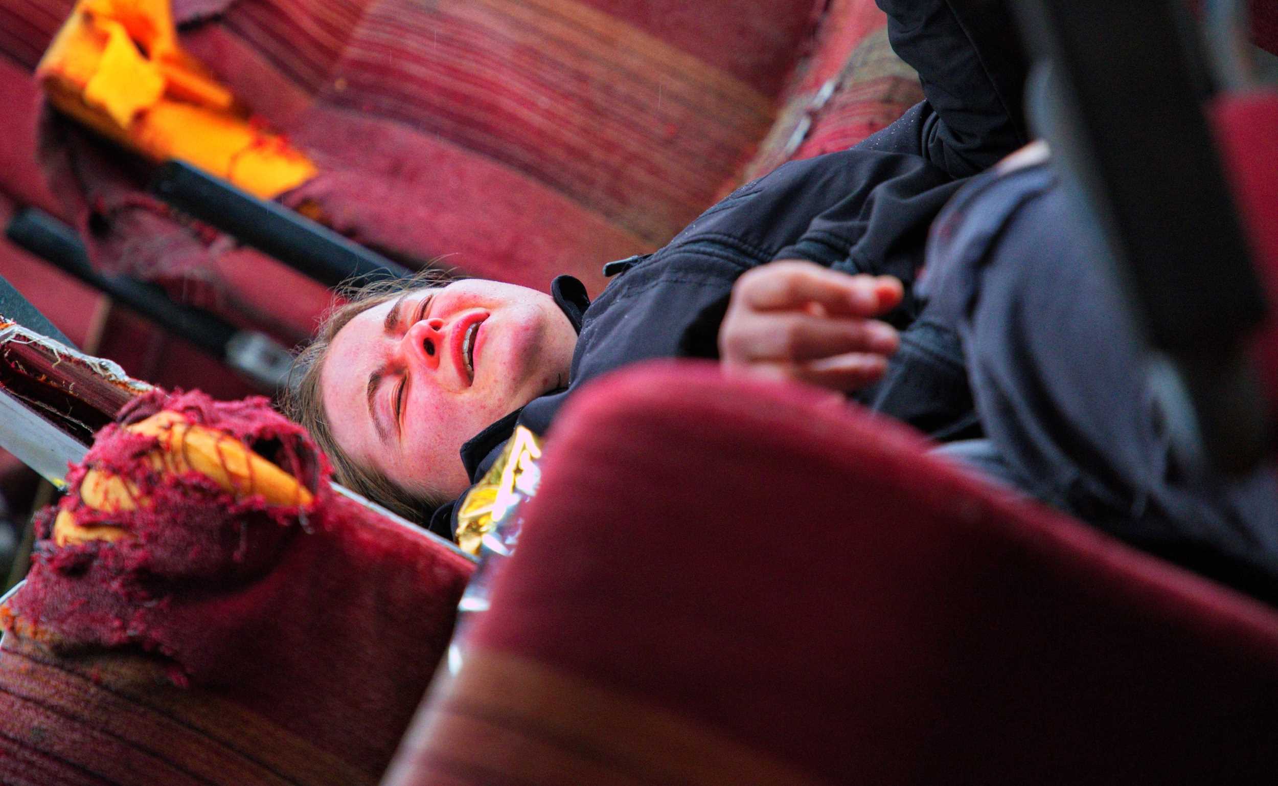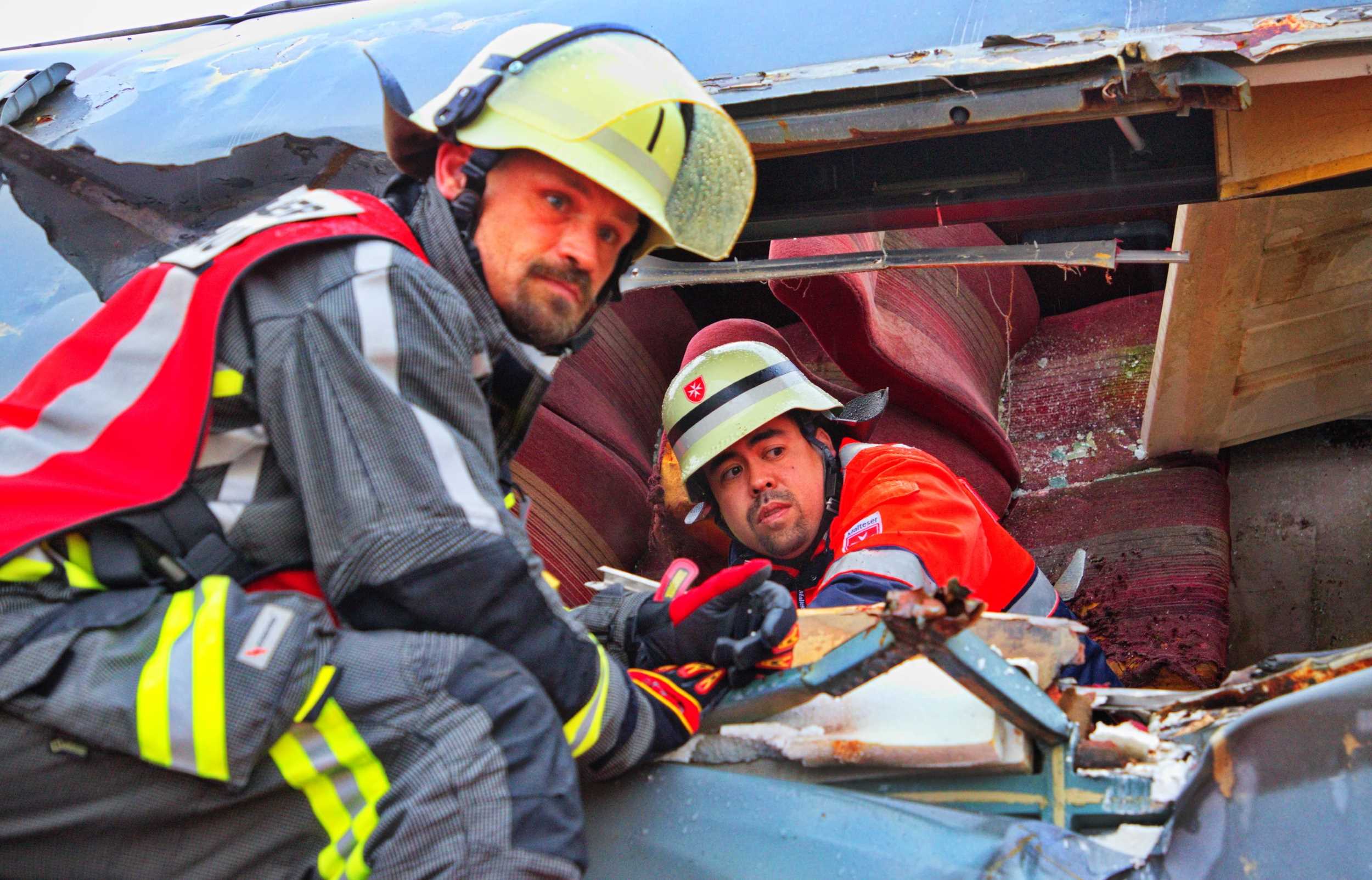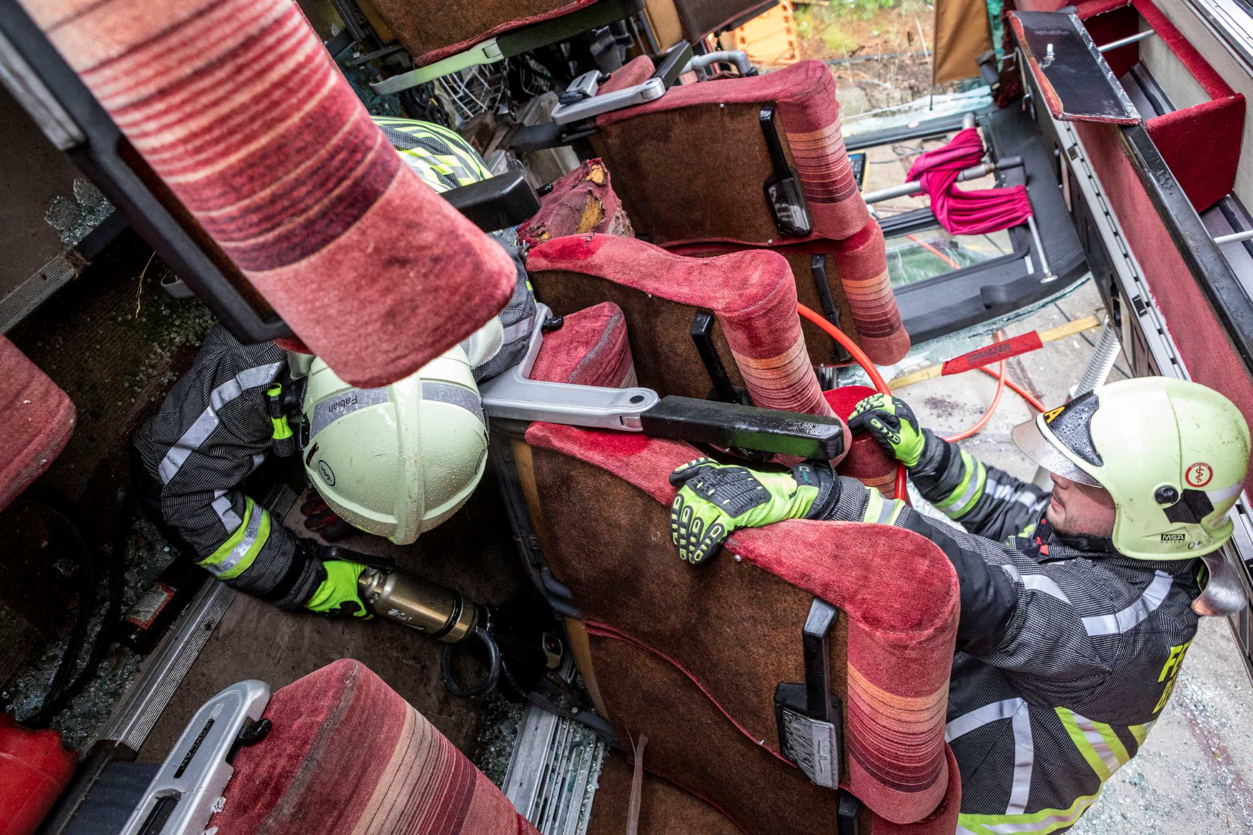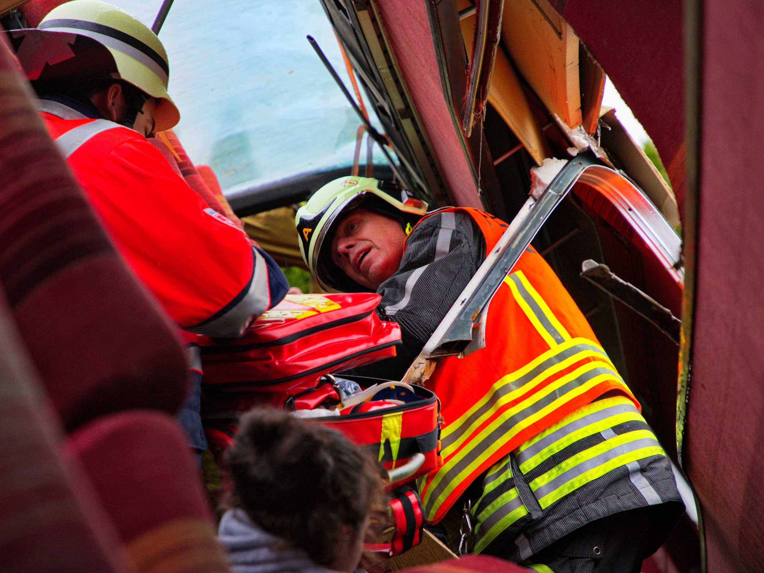 Schreckensszenario Busunfall mit eingeklemmten Personen