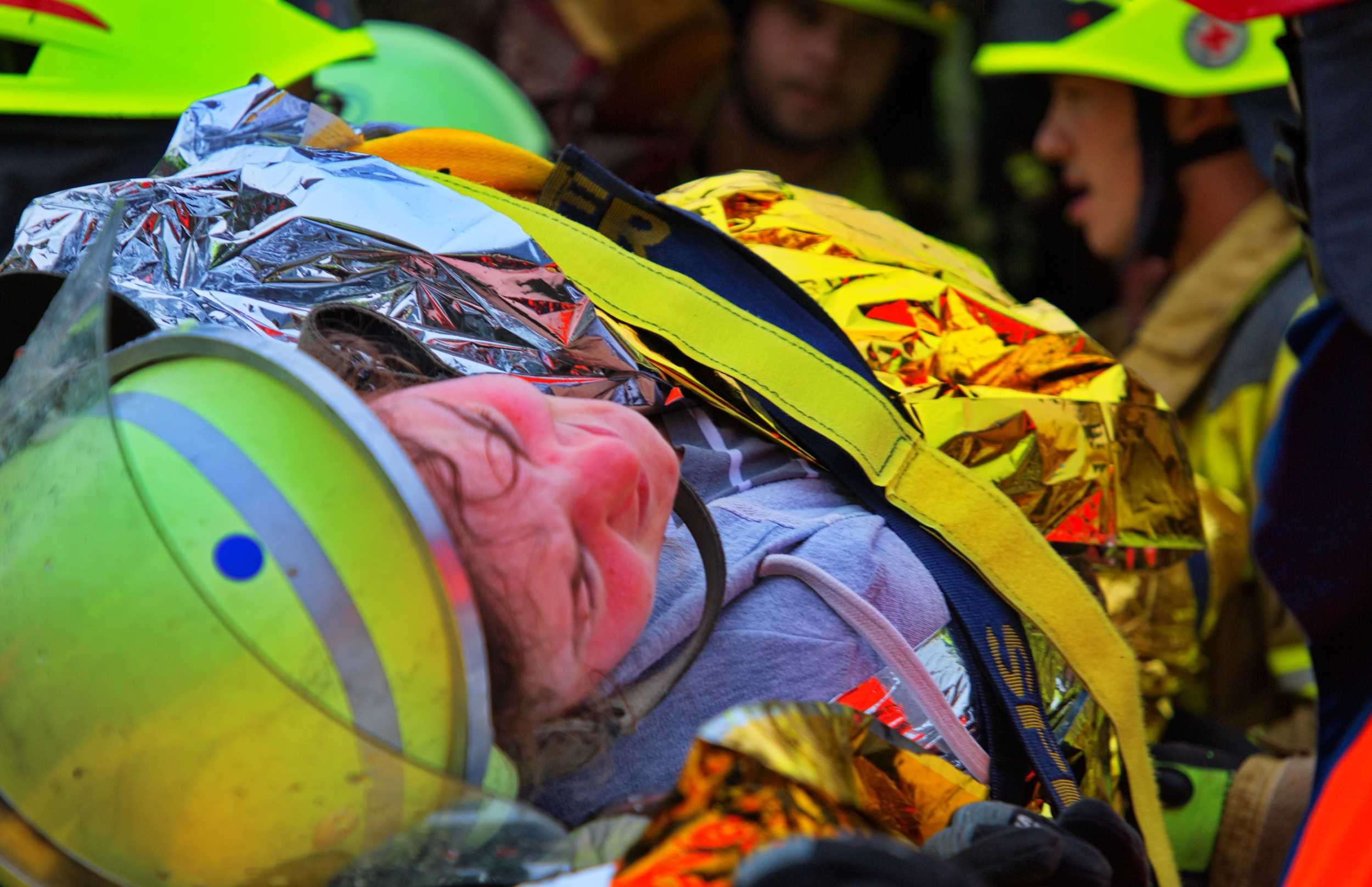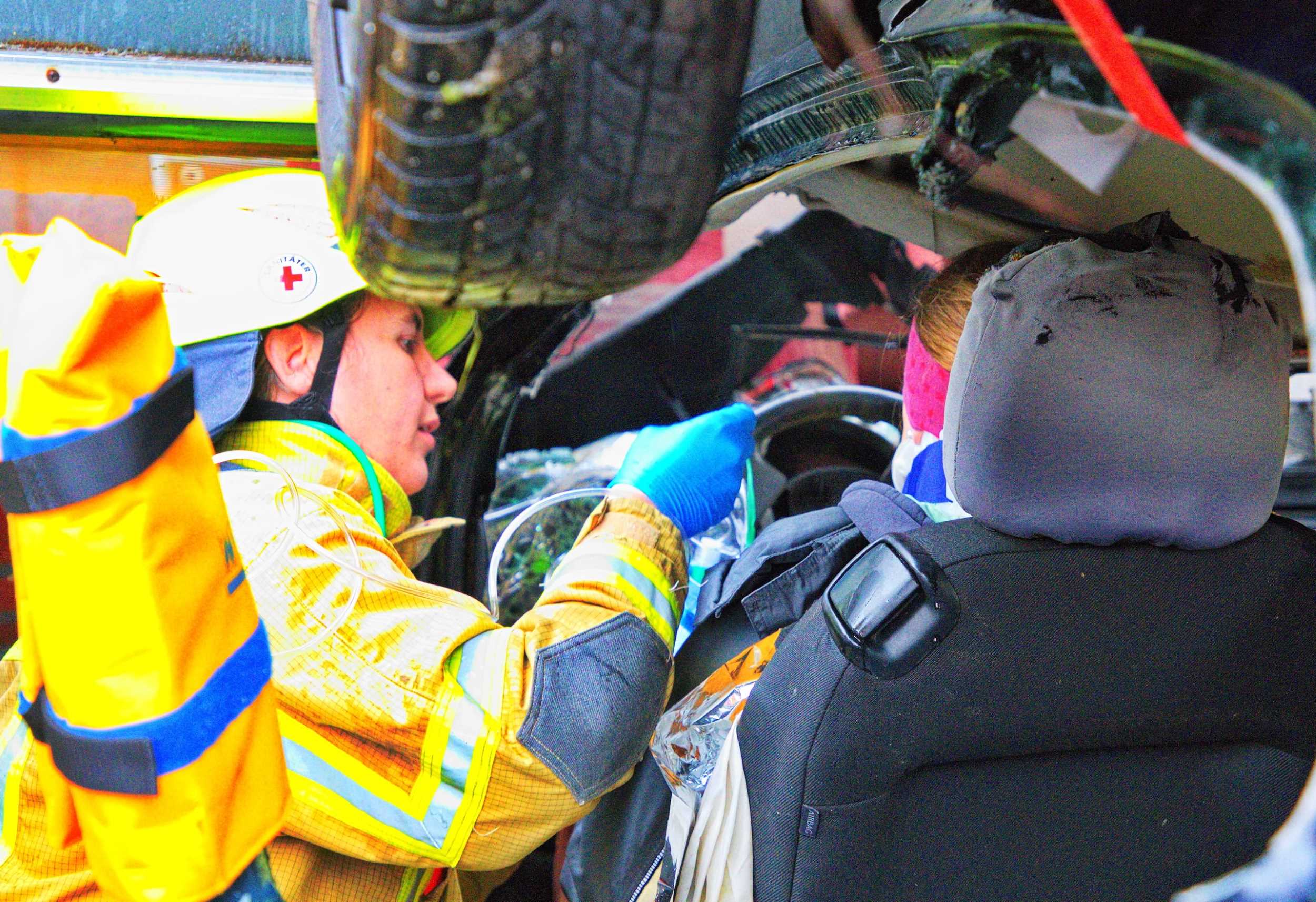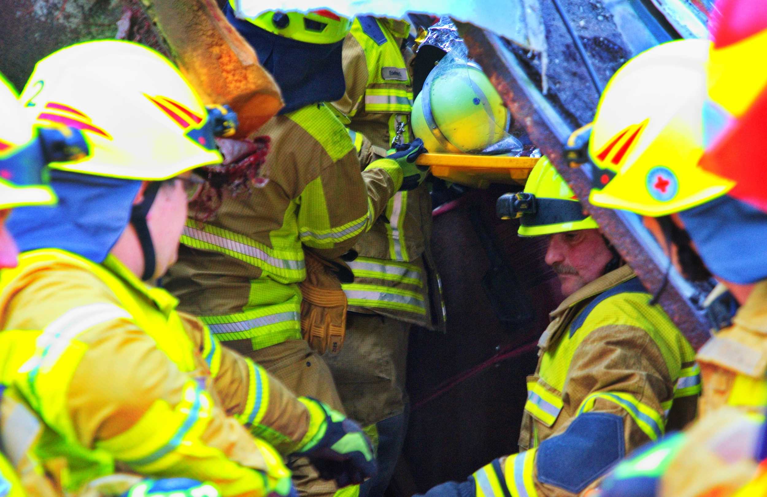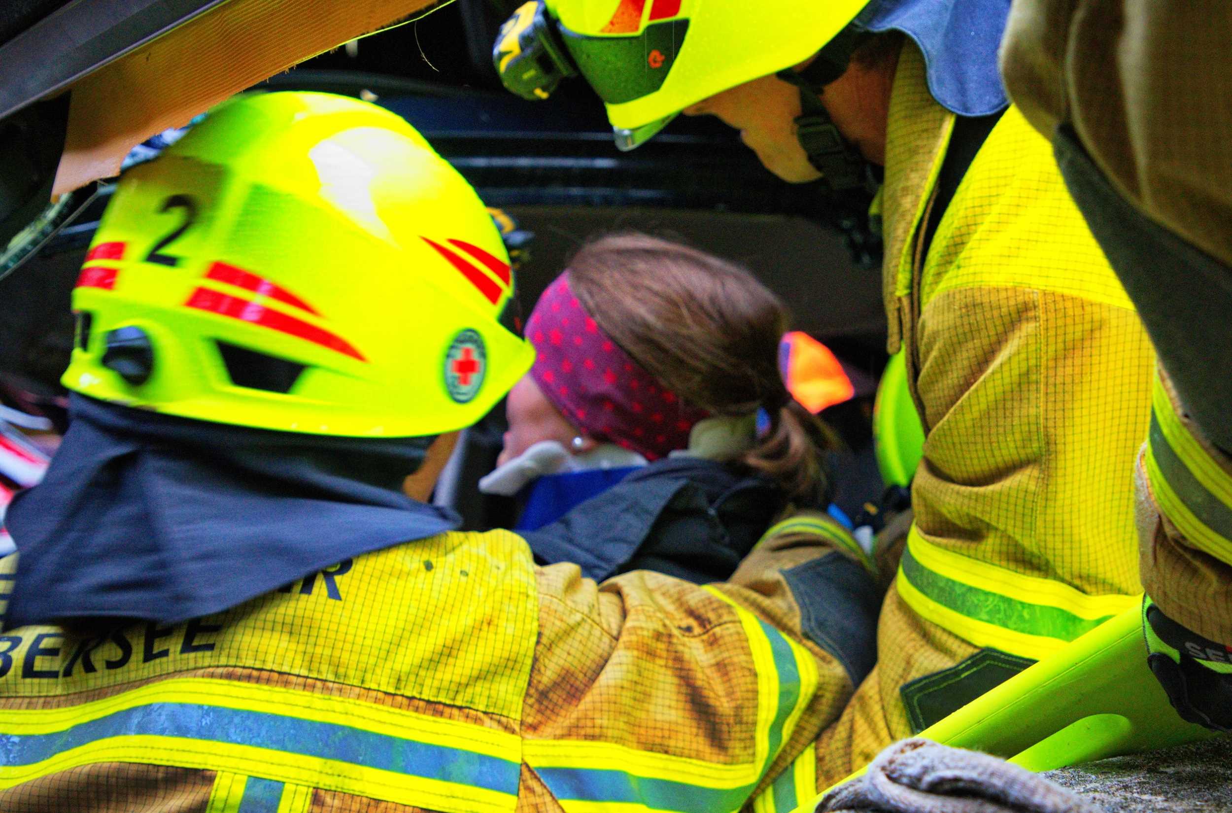 Zeitgleich wurde die Unfallstelle in zwei Abschnitte aufgeteilt und die Aufgaben an die anrückenden Helfer vergeben. Innerhalb kurzer Zeit waren die Unfalldarsteller medizinisch erstversorgt und die Feuerwehrkräfte konnten mit Spreizern, Rettungsscheren und Rettungszylindern ihre Arbeit aufnehmen. Bereits nach einer Viertelstunde waren die ersten Verletzten aus ihrer misslichen Lage befreit und konnten zur Weiterversorgung an die Sanitäter übergeben werden. Während der gesamten Rettungsaktion wurden die Patienten durch einen Feuerwehrarzt sowie mehrere Sanitäter betreut.