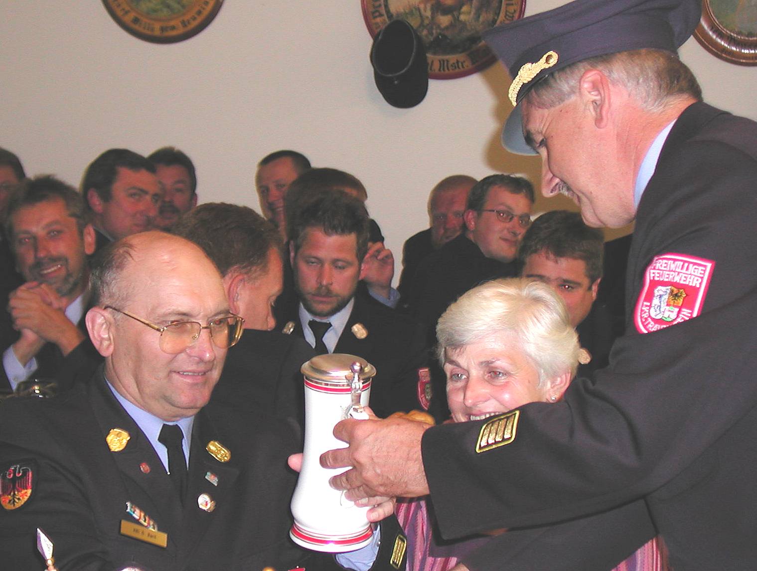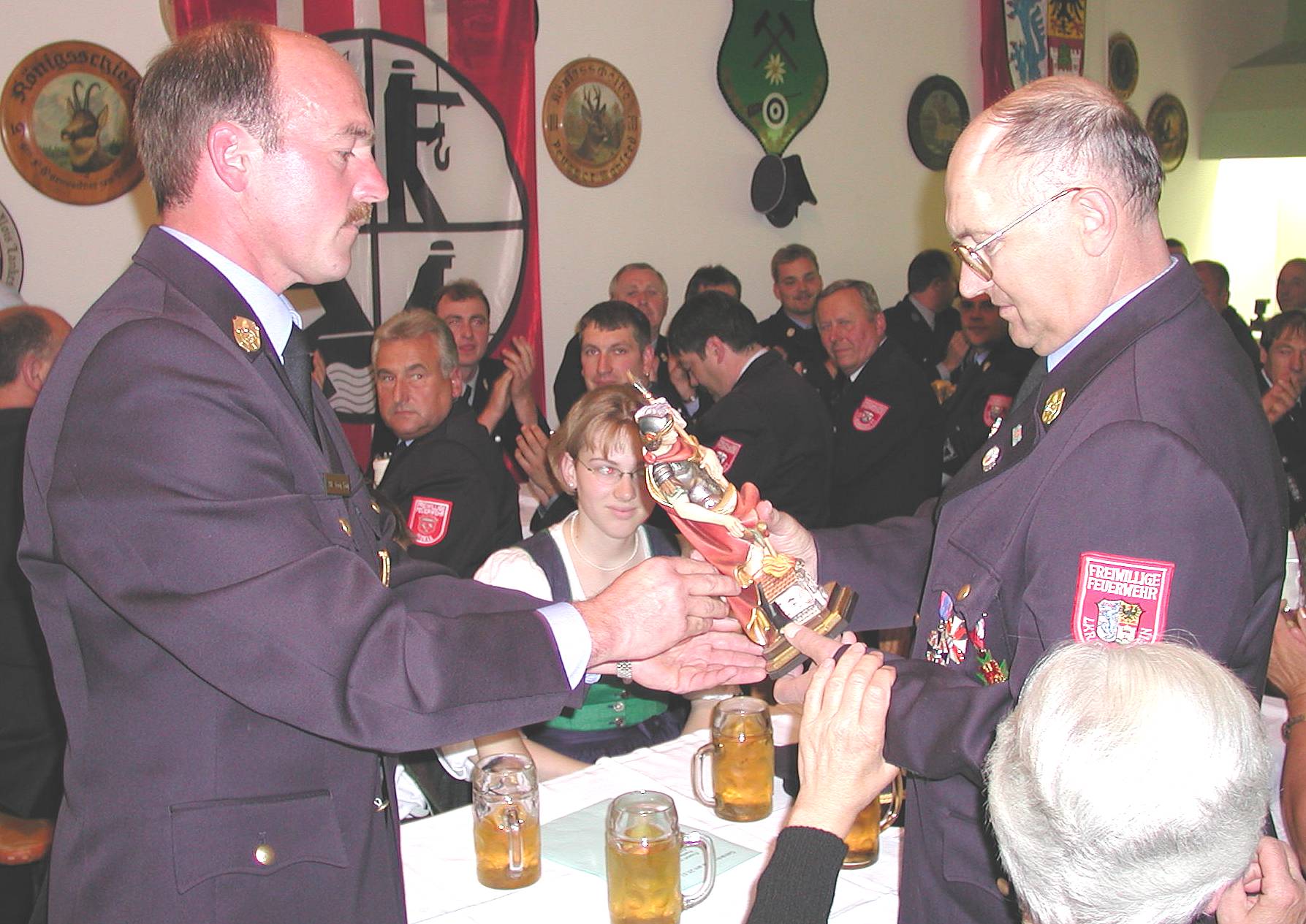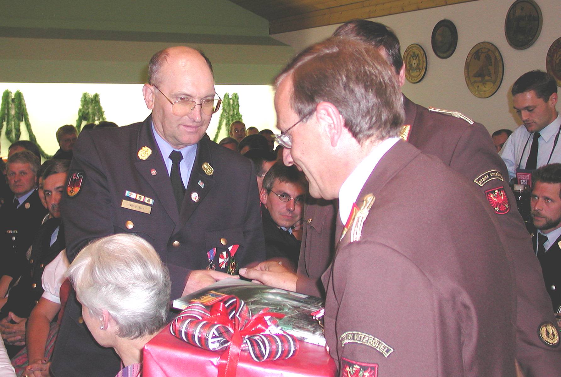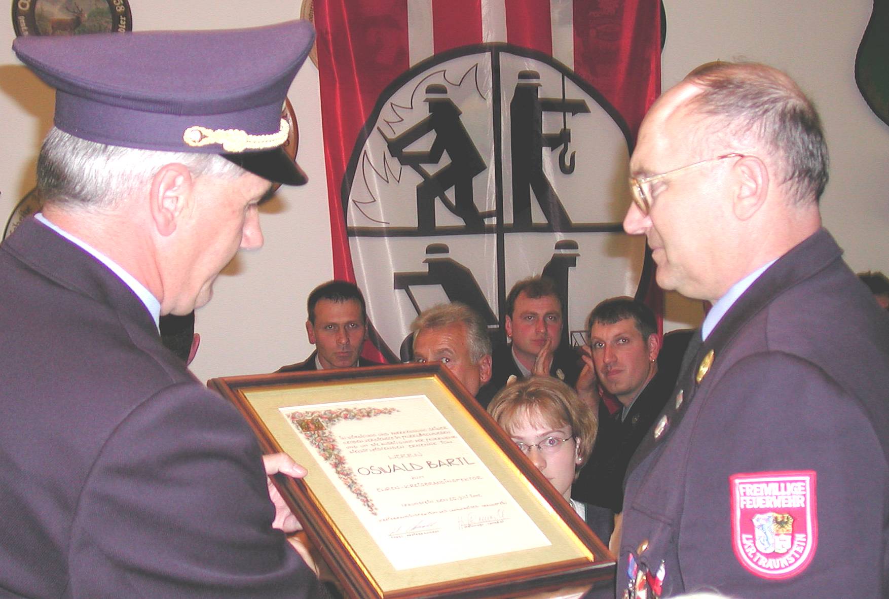 Zu den Bildern: Im Juli 2002 wurde Oswald Bartl bei einer Feier in Eisenärzt aus dem aktiven Feuerwehrdienst verabschiedend und zum Ehrenkreisbrandinspektor ernannt. (Fotos: Volk)