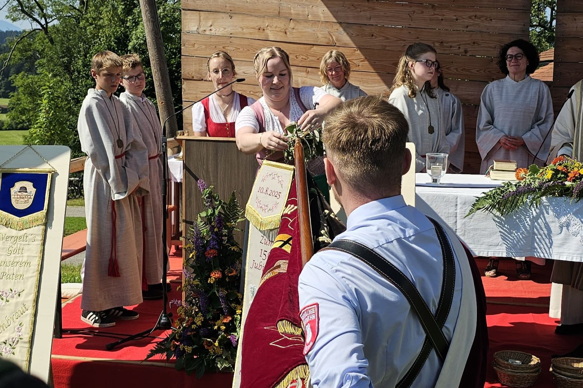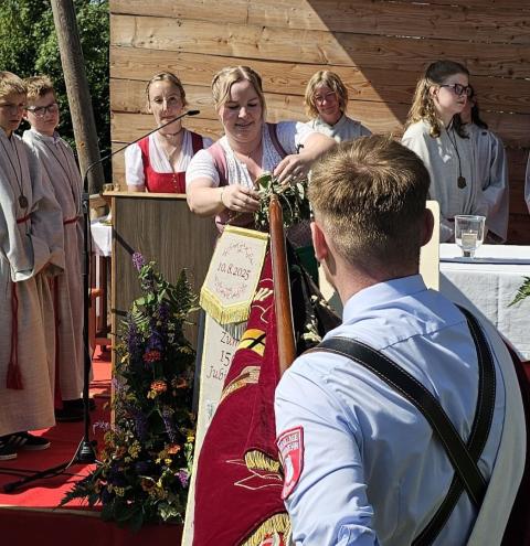 Im Anschluss an den Gottesdienst wurden die Fahnenbänder aus Otting sowie von der Patenfeuerwehr aus Nirnharting durch die Geistlichen gesegnet und als Zeichen der Verbundenheit gegenseitig durch die Fest- beziehungsweise Patenbraut an die jeweilige Vereinsfahne geheftet.