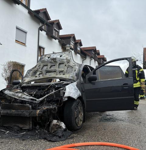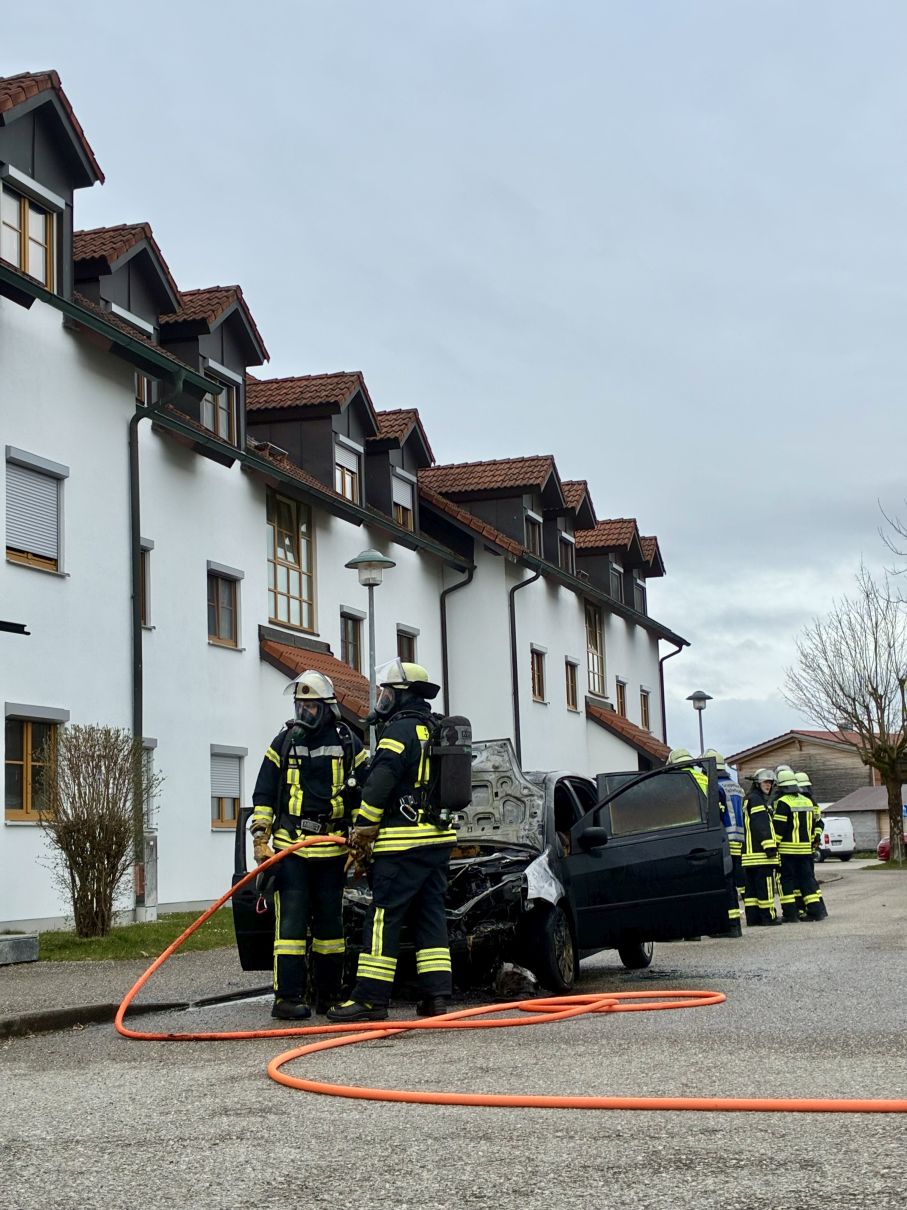 Die Feuerwehr Tacherting wurde zu einem Brand eines Pkw an einem Gebäude in der Tagahartstraße in Tacherting alarmiert. Das Fahrzeug befand sich etwa zwei Meter vom Hauseingang entfernt. Die Fahrzeughalterin war auf dem Weg zu Angehörigen in die Tagahartstraße, als sie bei ihrer Ankunft Rauch aus dem Armaturenbrett bemerkte. Sie verließ daraufhin umgehend das Fahrzeug. Beim Eintreffen der Einsatzkräfte stand der PKW bereits in Vollbrand. Der Brand wurde unter anderem mit Schaum gelöscht. Zudem wurde das Löschwasser kontrolliert zurückgehalten, um ein Eindringen in die Kanalisation zu verhindern. Ausgetretene Betriebsstoffe wie Öl und Kraftstoff mussten teilweise gebunden werden. Neben der Feuerwehr Tacherting war auch die Feuerwehr Trostberg alarmiert, deren Unterstützung jedoch nicht erforderlich war. Die Feuerwehr Tacherting rückte mit vier Fahrzeugen und rund 20 Einsatzkräften aus. Ebenfalls vor Ort waren eine Polizeistreife und der Rettungsdienst. Der Einsatz dauerte etwa eineinhalb Stunden.