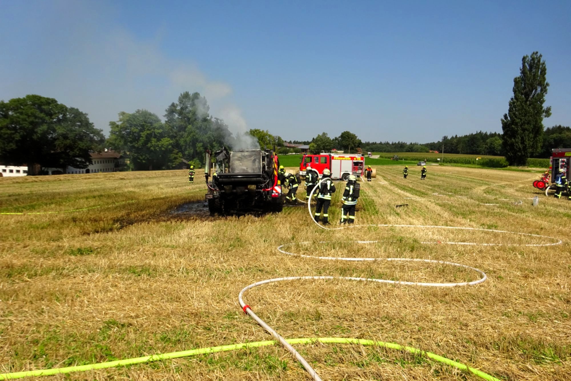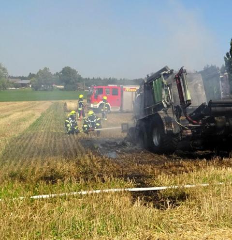 Die Feuerwehr Tacherting wurde zusammen mit den Feuerwehren Emertsham und Oberfeldkirchen mit dem Einsatzstichwort „B3 – Brand landwirtschaftliche Maschine“ auf ein Feld im Ortsteil Brandstätt alarmiert. Bei Eintreffen der Feuerwehren stand eine Ballenpresse in Vollbrand. Der dazugehörige Traktor konnte vom Landwirt rechtzeitig abgekuppelt und in Sicherheit gebracht werden. Der Sachschaden liegt nach einer ersten Schätzung der Feuerwehr deutlich im sechsstelligen Bereich. Verletzt wurde glücklicherweise niemand. Als Ursache wird derzeit von einem technischen Defekt ausgegangen.