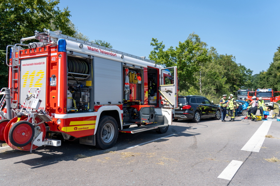 Auf der BGL 12, Höhe Holzhausen, kam es zu einem schweren Verkehrsunfall mit zwei beteiligten PKW. Der Lenker eines Seat wollte von Holzhausen kommend in Richtung Teisendorf auf die BGL 12 auffahren. Dabei übersah er einen schwarzen Mercedes. Dieser krachte frontal in die Fahrerseite des Seats. Bei dem Aufprall wurde der Lenker schwer eingeklemmt und musste durch die Feuerwehr mit schwerem hydraulischem Gerät aus seinem Fahrzeug befreit werden. Der Fahrer wurde anschließend mit dem Rettungshubschrauber Christoph 14 schwer verletzt in das Klinikum Traunstein geflogen. Die Beifahrerin des Seat sowie der Fahrer des Mercedes erlitten leichte bis mittelschwere Verletzungen und wurden mit dem Rettungswagen ins Klinikum Bad Reichenhall gebracht. Der Rettungsdienst war mit zwei Rettungswägen, einem Krankentransportwagen, einem Notarzteinsatzfahrzeug, dem Rettungshubschrauber Christoph 14 und dem Einsatzleiter Rettungsdienst vor Ort. Die Feuerwehren aus Teisendorf, Oberteisendorf und Petting waren mit fünf Fahrzeugen und 35 Einsatzkräften vor Ort. Neben der Rettung der Verletzten banden sie ausgelaufene Betriebsstoffe und sperrten den Bereich der Unfallstelle großräumig ab. Die Polizei aus Freilassing nahm den Unfall auf.
