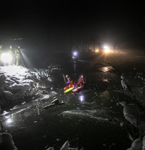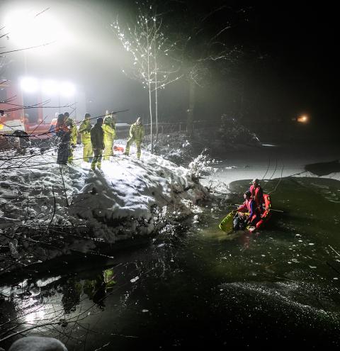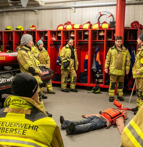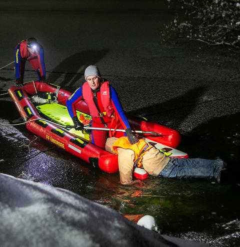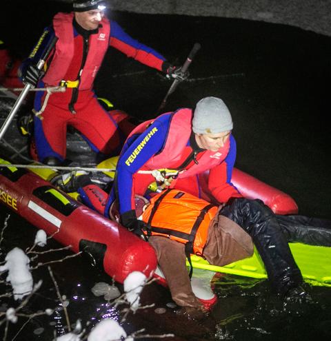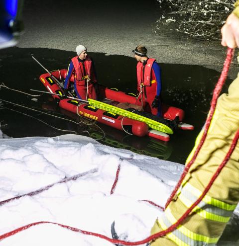 Sie nutzten den Übungsabend auch dazu, um verschiedene Techniken zur Eisrettung zu testen und sich mit den unterschiedlichen Ausrüstungsgegenständen unter „realen“ Bedingungen vertraut zu machen. Darunter fiel auch das sogenannte „Spineboard", ein Rettungsbrett aus Kunststoff, dass als Hilfsmittel zur Rettung von Personen eingesetzt werden kann. Der Neoprenanzug schützt die Einsatzkräfte vor Kälte beziehungsweise einem zu raschen Auskühlen des Körpers. Das Material wirkt wie eine Dämmschicht und bietet dennoch eine maximale Beweglichkeit für den Träger des Anzugs. Die Floriansjünger aus Übersee hoffen natürlich, dass die Technik nicht zum Einsatz kommen muss, dennoch ist es aus ihrer Sicht wichtig, auf mögliche Ernstfälle bestmöglich vorbereitet zu sein.