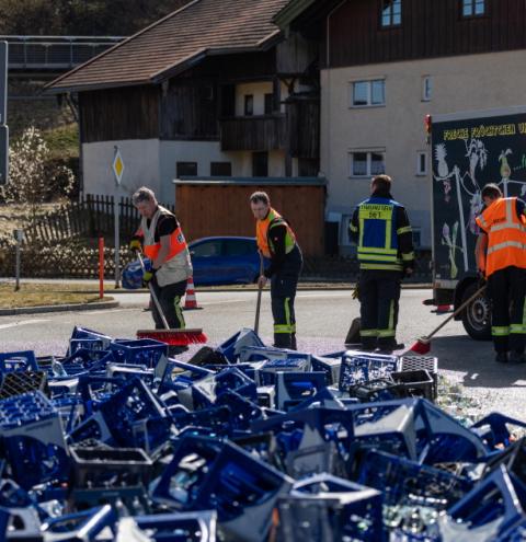 Am Kreisverkehr des Ettendorfer Tunnels in Traunstein ereignete sich ein Verkehrsunfall, der den Verkehr rund um Traunstein massiv behinderte. Ein mit Getränkekisten beladener LKW, der unterwegs aus Traunstein kommend in Richtung Altötting war, verlor aufgrund nicht angepasster Geschwindigkeit im Kreisverkehr einen Teil seiner Ladung. Diese stürzte auf die Straße und in den Grünstreifen neben dem Kreisverkehr. Verletzt wurde bei dem Unfall niemand. Zunächst war die Feuerwehr aus Traunstein mit 20 Einsatzkräften zur Verkehrsregelung und Säuberung der Unfallstelle vor Ort. Da der LKW umgeladen werden musste, wurden die Wehren aus Teisendorf, Surberg und Haslach sowie das THW nachalarmiert. Während der Aufräumarbeiten wird der Kreisverkehr vermutlich komplett gesperrt werden müssen. Die Polizei aus Traunstein hat den Unfall aufgenommen.