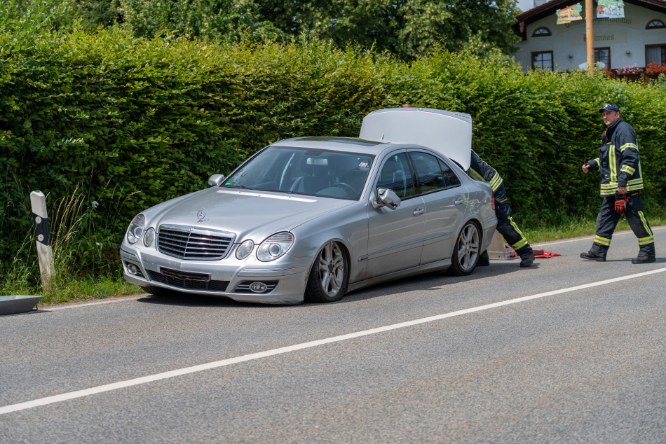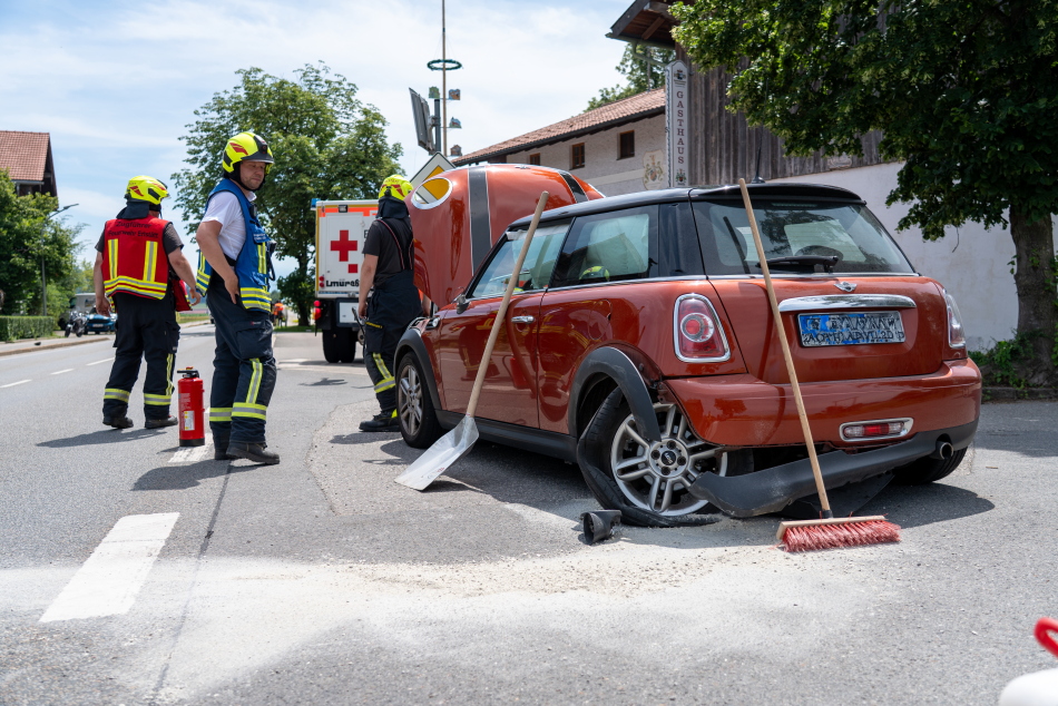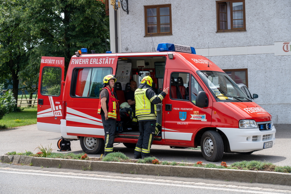 Zu einem Verkehrsunfall kam es auf der ST 2095 bei Kraimoos. Laut Informationen von vor Ort fuhr ein männlicher Fahrer mit seinem Mercedes von Chieming kommend in Richtung Erlstätt. Die Lenkerin des Minis fuhr in die entgegengesetzte Fahrtrichtung. Auf Höhe Kraimoos geriet der Fahrer des Mercedes in den Gegenverkehr und prallte seitlich gegen den Mini. Durch den Aufprall drehte sich der Mini um 180 Grad und kam in Fahrtrichtung Erlstätt zum Stehen. Der Mercedes fuhr anschließend gegen den Bordstein und kam erst etwa 100 Meter nach der Kollision auf seiner Fahrbahnseite zum Stillstand. Der Fahrer des Mercedes wurde zur Abklärung in ein Krankenhaus umliegendes Krankenhaus gebracht. Die Fahrerin des Minis erlitt lediglich einen Schock. Aktuell wird davon ausgegangen, dass der Fahrer des Mercedes während der Fahrt einschlief. Die Feuerwehr Erlstätt war mit vier Fahrzeugen und 22 Einsatzkräften vor Ort. Die Einsatzkräfte sperrten die ST 2095 während der Unfallaufnahme komplett und reinigten ausgelaufene Betriebsstoffe. Der Rettungsdienst war mit einem Krankentransportwagen und einem Rettungswagen im Einsatz. Beide Fahrzeuge waren nicht mehr fahrbereit und mussten abgeschleppt werden. Die Polizei Traunstein nahm den Unfall auf.