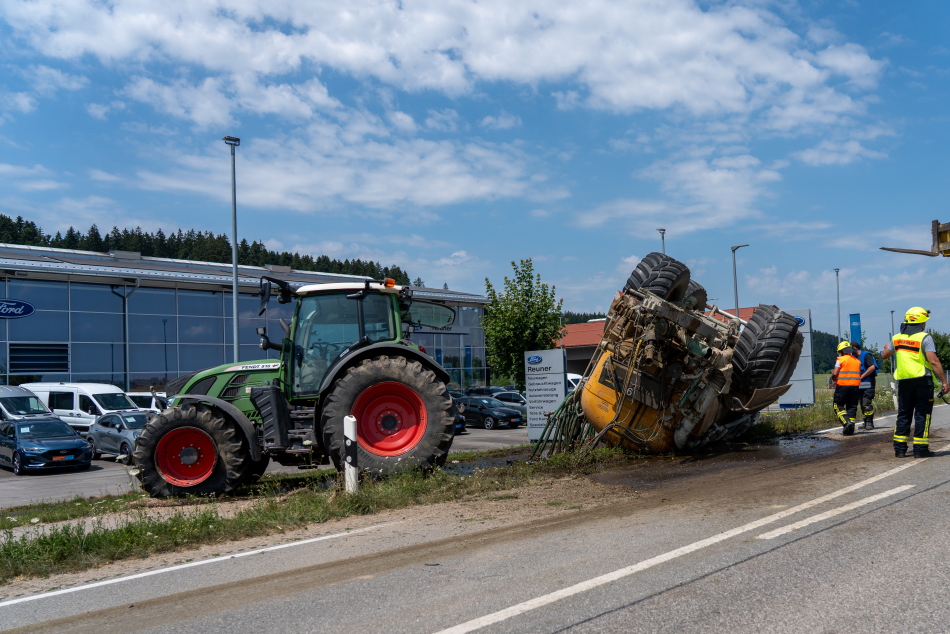 Zu einem Verkehrsunfall mit einem Traktorgespann kam es auf der TS 42 in Palling. Ein Landwirt fuhr mit seinem Traktor und seinem voll beladenen Güllefass auf der TS 42 in Richtung Palling. Am Ortseingang auf Höhe des Gewerbegebiets wurde dieser dann von einem bislang unbekannten PKW-Lenker überholt. Der PKW schnitt das Traktorgespann, dass dieser bremsen musste und ins Schaukeln geriet. Dabei kippte sein Güllefass um und 14.000 Liter Gülle liefen über den Radweg ins Bankett. Der Fahrer blieb unverletzt. Die daraufhin alarmierte Feuerwehr Palling war mit 3 Fahrzeugen und 18 Einsatzkräfte vor Ort. Die Einsatzkräfte sperrten die TS 42, während der Bergungs- und Reinigungsarbeiten komplett und halfen bei der Bergung. Die restliche Gülle aus dem Fass und aus der Böschung wurde durch eine Fachfirma abgepumpt und ordnungsgemäß entsorgt. Der Schaden wird aktuell auf circa 200.000 Euro beziffert. Ein Vertreter des Landratsamtes Traunstein war ebenfalls vor Ort. Aufgenommen wurde der Unfall durch die Polizei Traunreut.