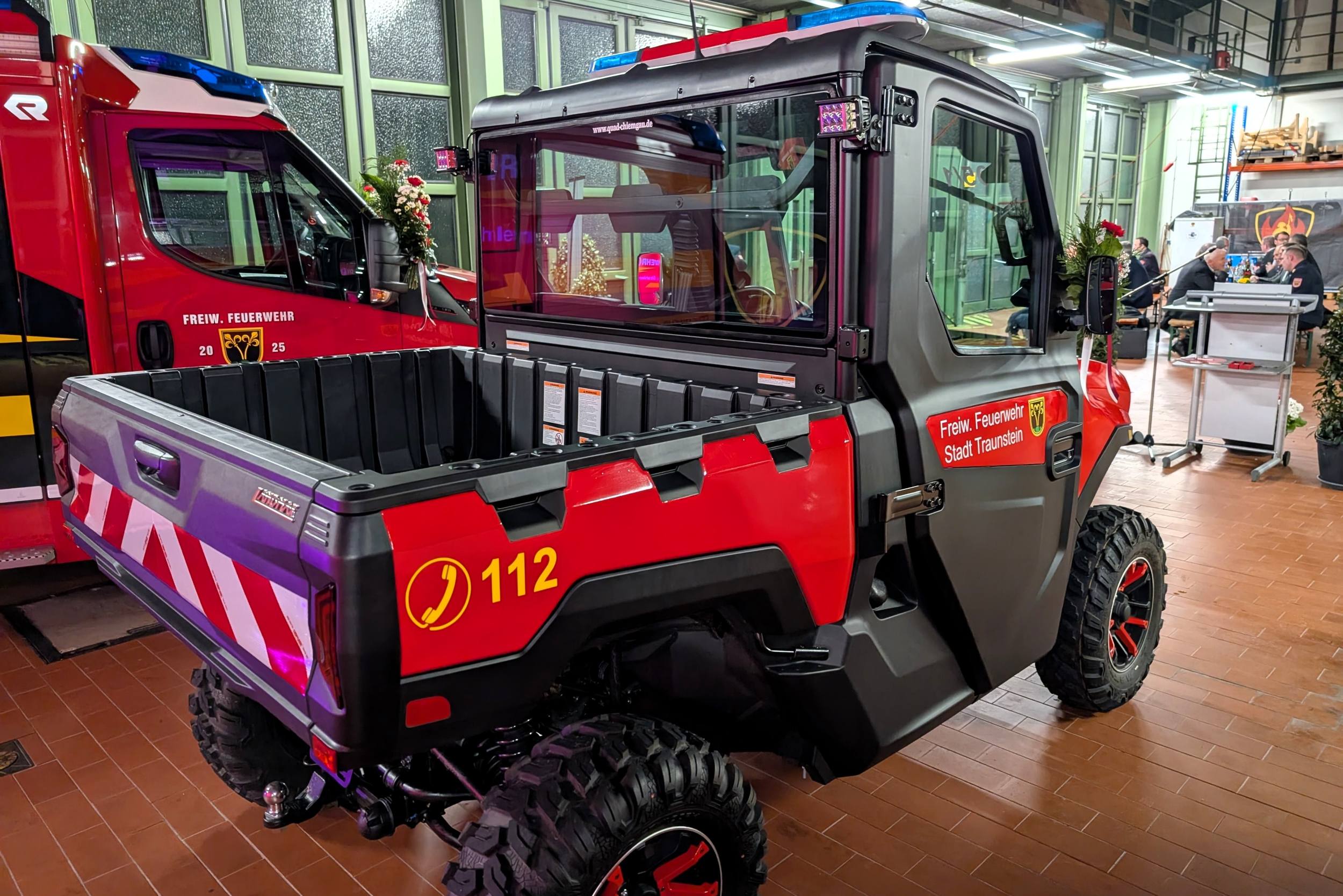 Die offene Ladefläche gewährleistet eine sichere Schwarz-Weiß-Trennung kontaminierter Einsatzmittel und verbessert damit die Einsatzhygiene. Vorgesehen ist der Einsatz bei Veranstaltungen im Stadtgebiet sowie auf Wander- und Radwegen entlang der Traun, wo die geringe Breite und hohe Geländegängigkeit klare Vorteile bieten. Finanziert wurde das ATV vollständig aus Spendenmitteln durch den Feuerwehrverein.