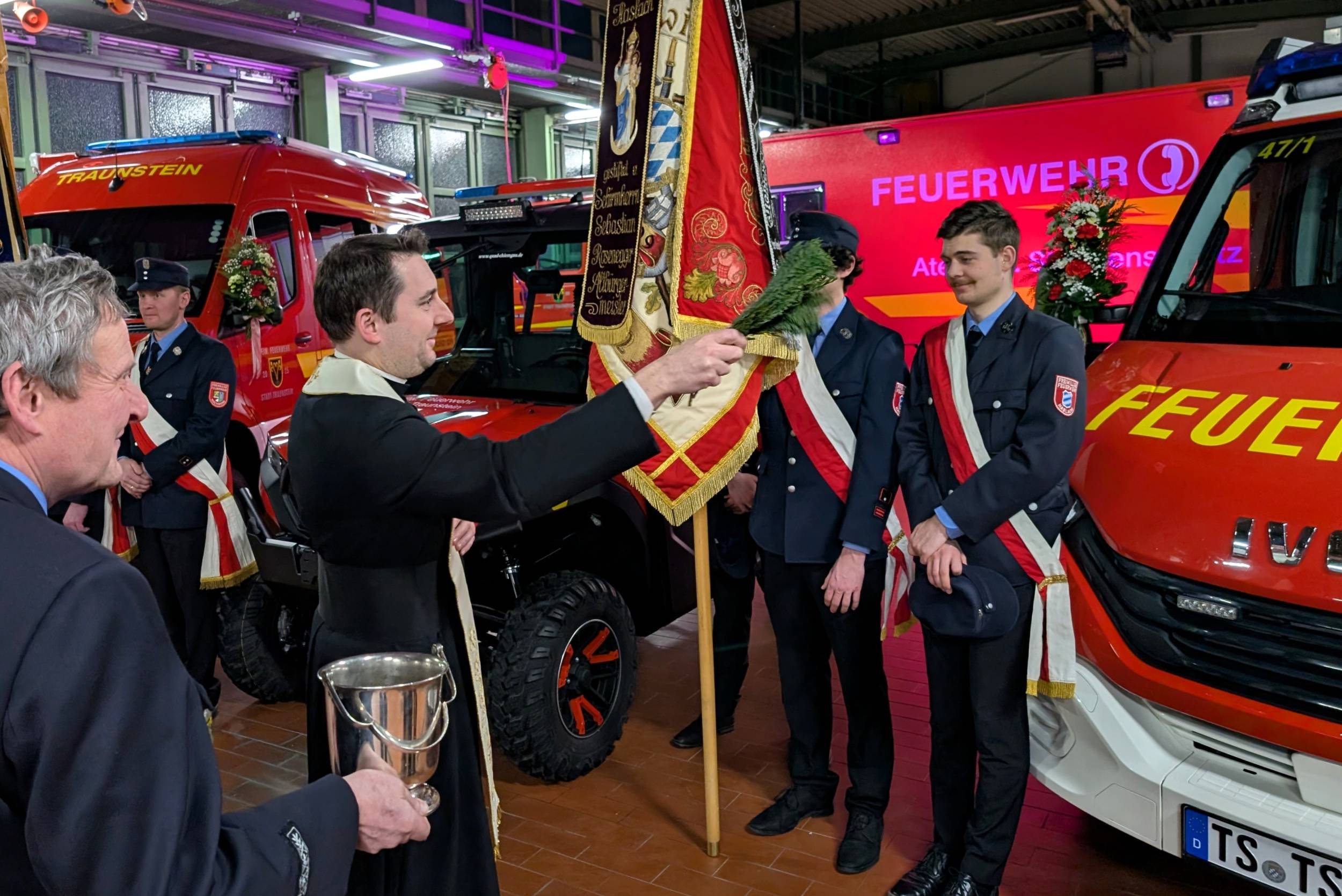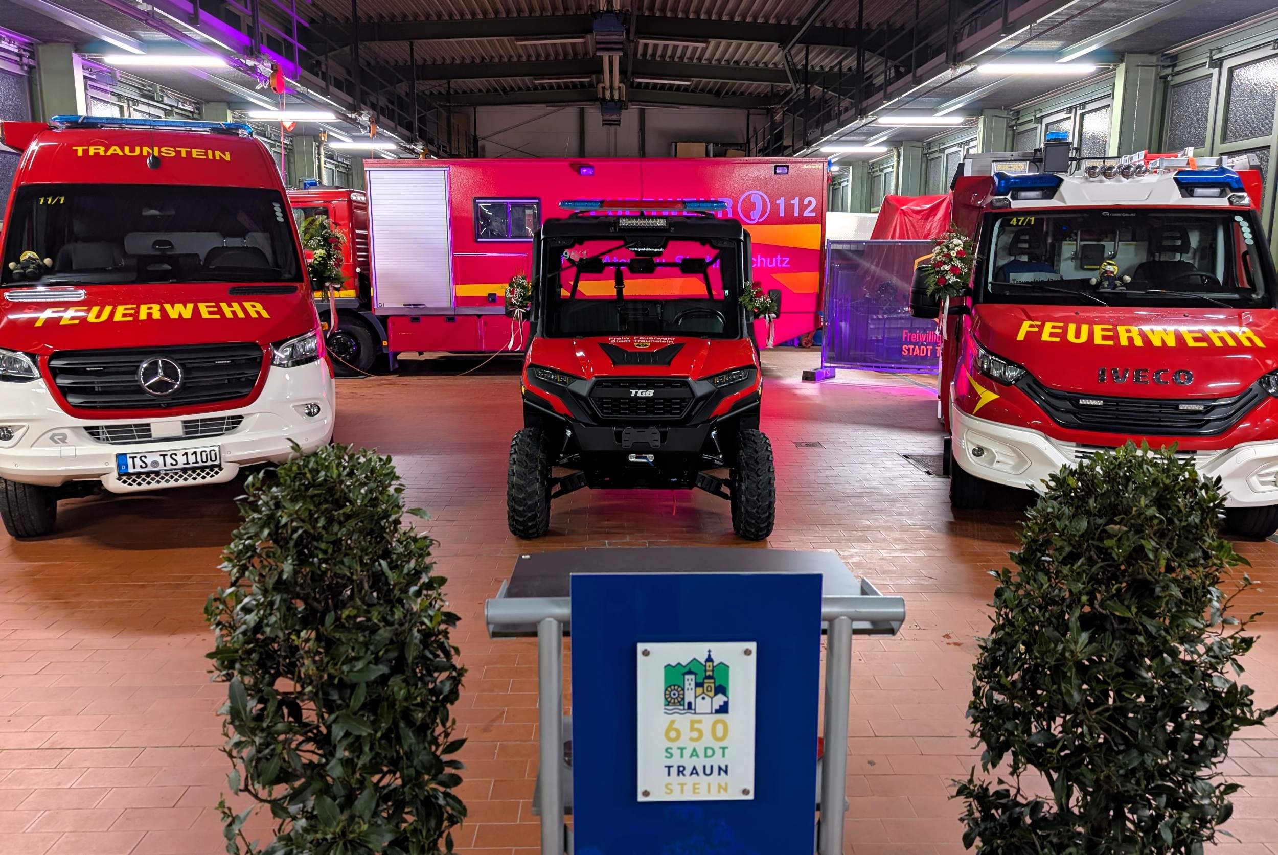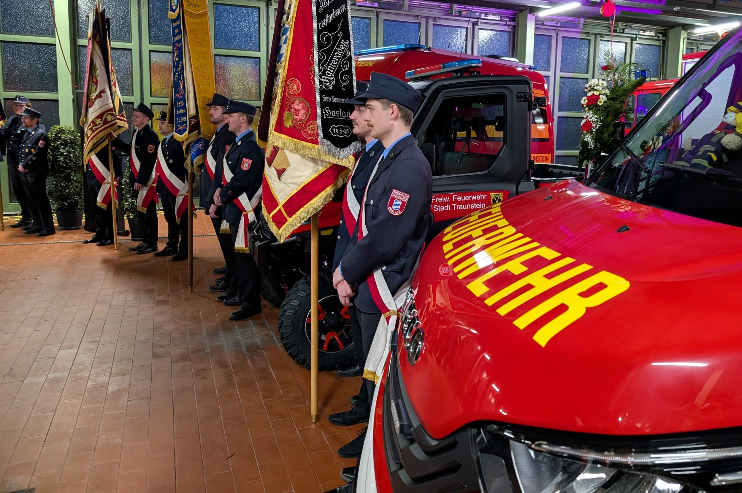 Sauber herausgeputzt und mit Blumenschmuck versehen standen die drei Fahrzeuge in der Fahrzeughalle bereit für ihren „ersten großen Auftritt“. Kommandant Christian Schulz sprach von einem in seiner Laufbahn wohl einmaligen Ereignis: „Dass wir gleich drei neue Fahrzeuge gleichzeitig in Dienst stellen dürfen, ist etwas ganz Besonderes.“ Sein Dank galt insbesondere der aktiven Mannschaft, die die Technik künftig bedienen und zum Schutz der Stadt Traunstein einsetzen wird.