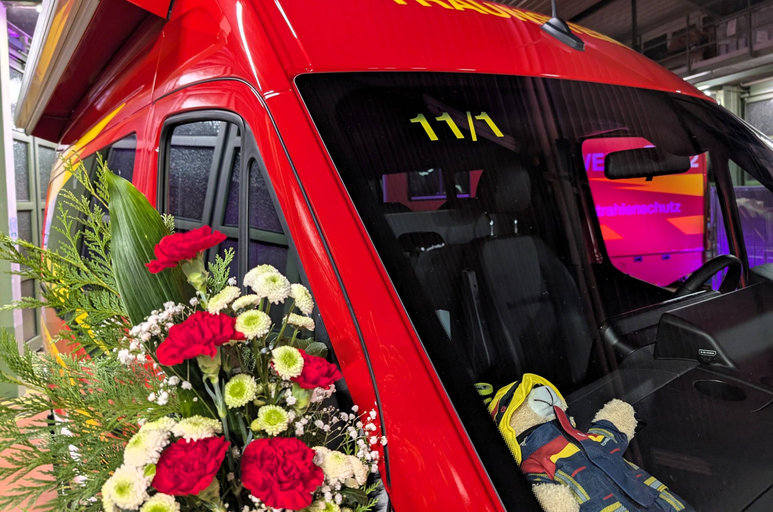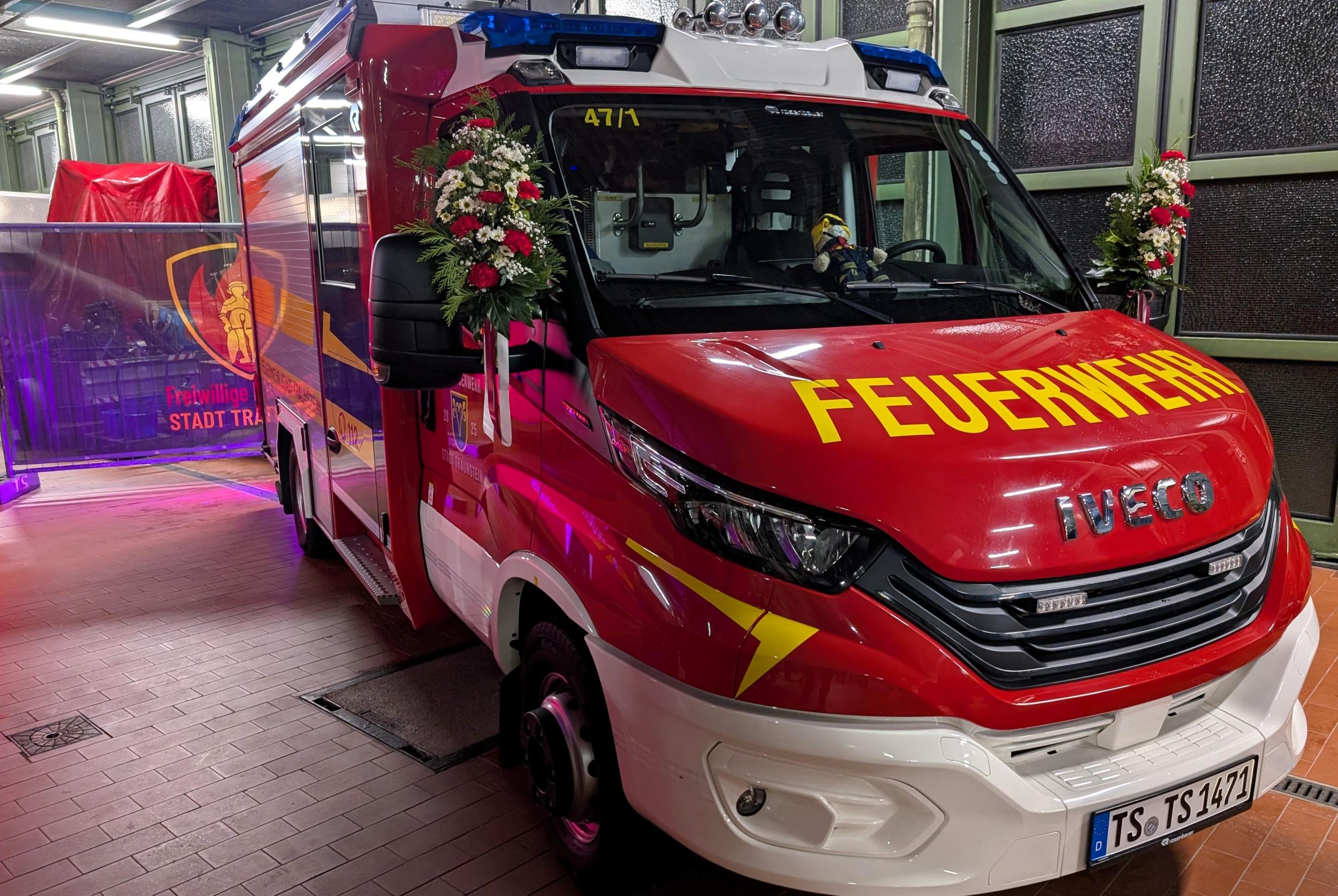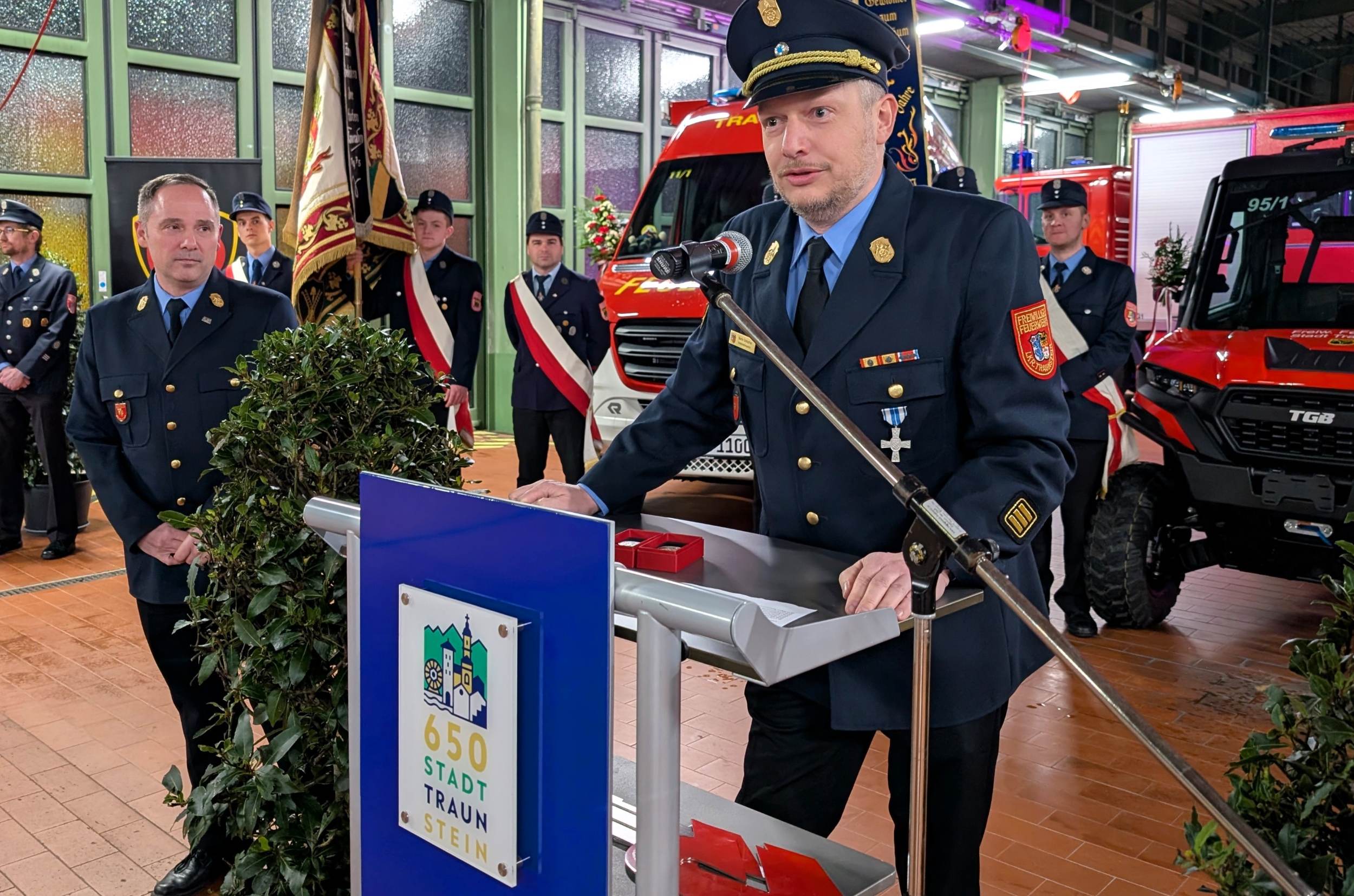 Sauber herausgeputzt und mit Blumenschmuck versehen standen die drei Fahrzeuge in der Fahrzeughalle bereit für ihren „ersten großen Auftritt“. Kommandant Christian Schulz sprach von einem in seiner Laufbahn wohl einmaligen Ereignis: „Dass wir gleich drei neue Fahrzeuge gleichzeitig in Dienst stellen dürfen, ist etwas ganz Besonderes.“ Sein Dank galt insbesondere der aktiven Mannschaft, die die Technik künftig bedienen und zum Schutz der Stadt Traunstein einsetzen wird.
