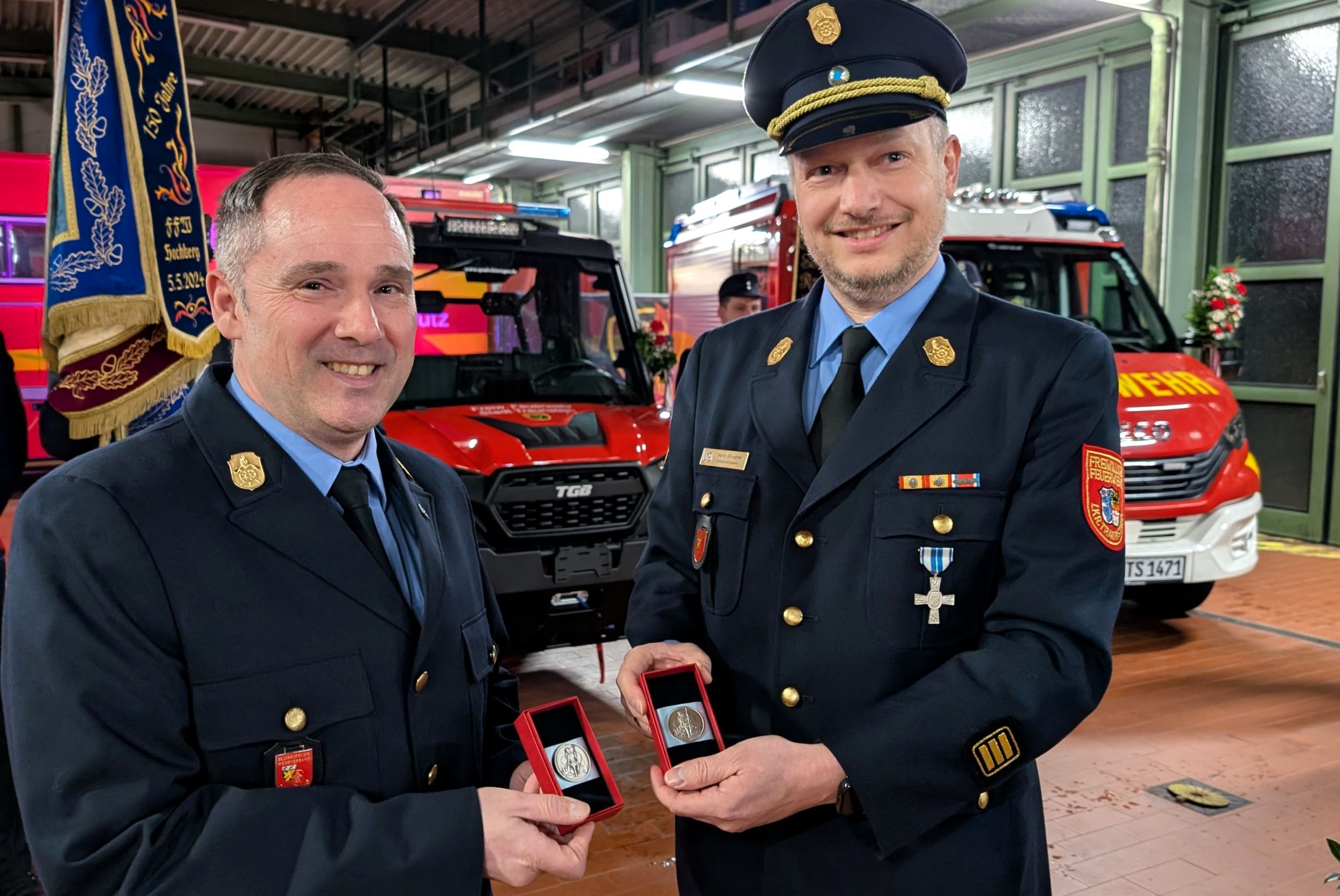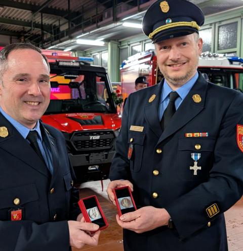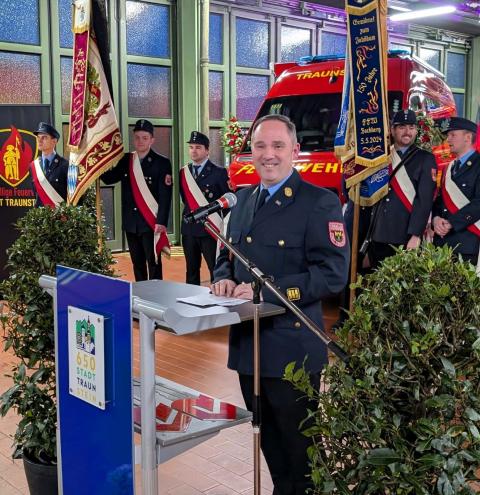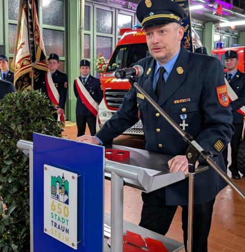 Stellvertretend für den Kreisfeuerwehrverband überbrachte die Glückwünsche der Feuerwehren des Landkreises Traunstein Kreisbrandinspektor Martin Schupfner, der gemeinsam mit Kreisbrandmeister Albert Rieder an der Feierstunde teilnahm. Er dankte den Städten und Gemeinden für die Ausstattung und den Unterhalt der Feuerwehren und wünschte den Aktiven stets eine gesunde Rückkehr von Einsätzen und Übungen. Als kleines Zeichen der Wertschätzung überreichte er „Floriansmedaillen“ als Glücksbringer für die neuen Fahrzeuge.
