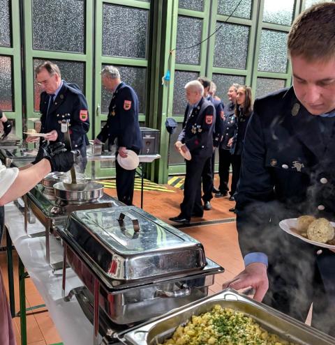 Im Anschluss an den offiziellen Teil kamen die Gäste zu einem gemeinsamen Abendessen zusammen. Neben den Aktiven der Feuerwehr Traunstein nahmen Abordnungen der Feuerwehren Haslach, Hochberg, Kammer und Wolkersdorf sowie der Patenfeuerwehr aus Siegsdorf teil. Viele Gäste nutzten die Gelegenheit, die neuen Fahrzeuge aus nächster Nähe zu besichtigen und einen Blick hinter die Rollläden zu werfen. Hob