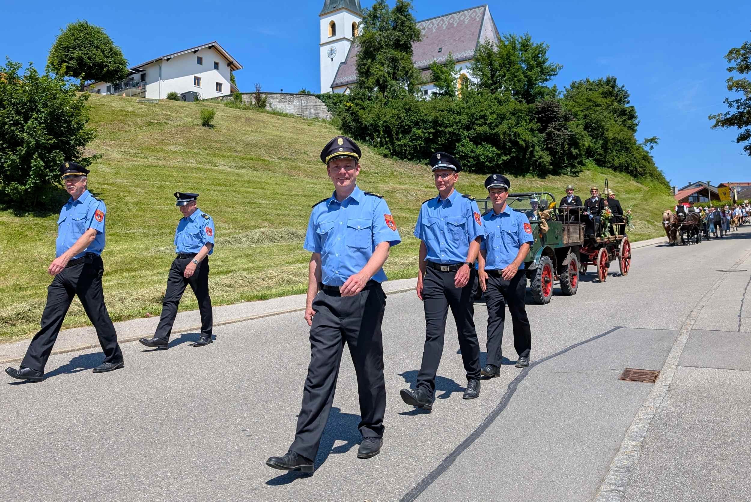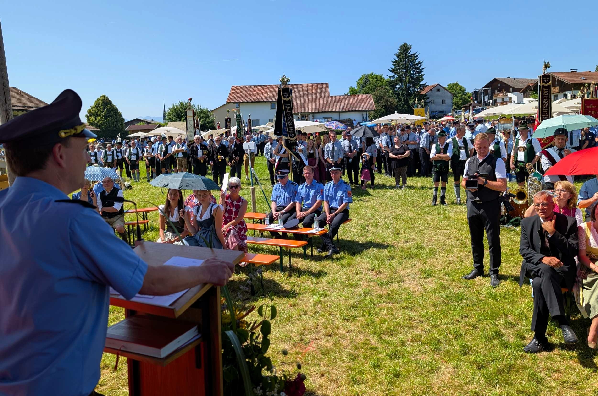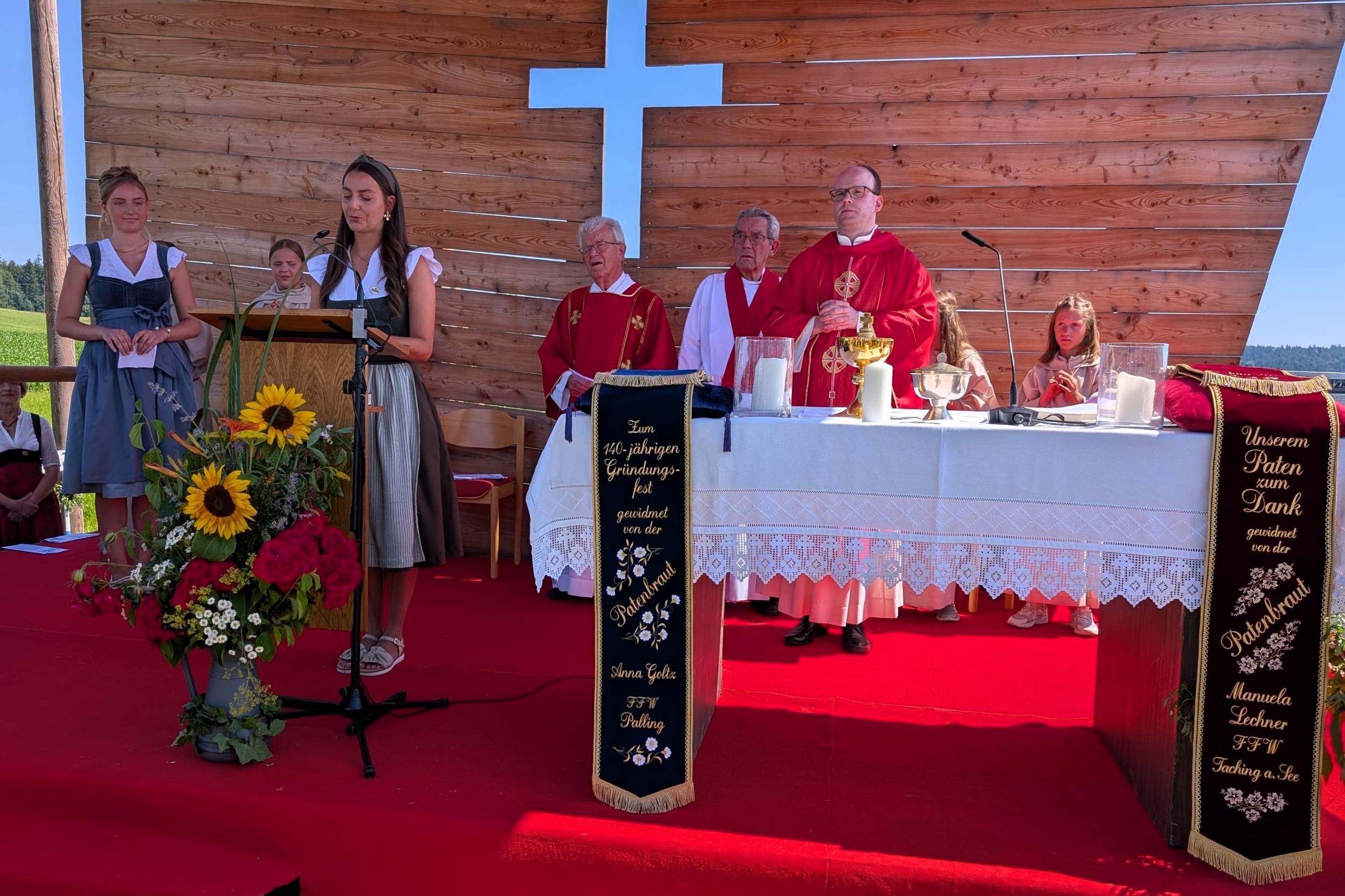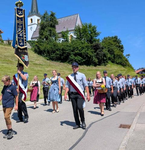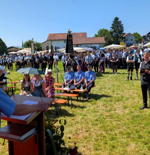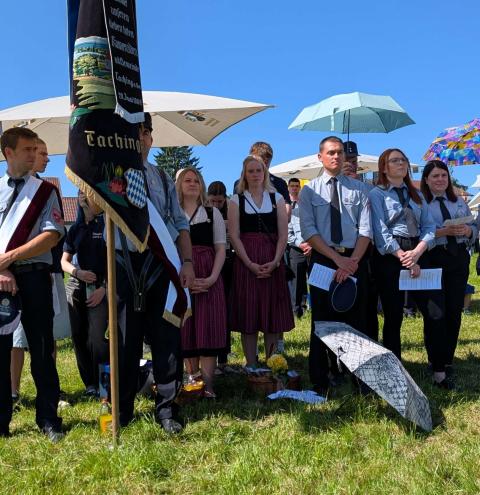 Schöner kann ein Fest nicht enden, bei strahlendem Sonnenschein führte am Sonntag ein von etwa 60 Gastvereinen begleiteter Zug auf die Wiese hinter dem Feuerwehrhaus. Dort feierte man zusammen Gottesdienst. Die heilige Messe zelebrierten gemeinsam Pfarrer Markus Nappert, Diakon Anton Lörzel, Pfarrer in Ruhestand Walter Laakmann. Für den musikalischen Rahmen sorgten der Kirchenchor unter der Leitung von Barbara Danninger und die Musikkapelle Tengling.