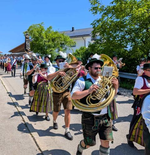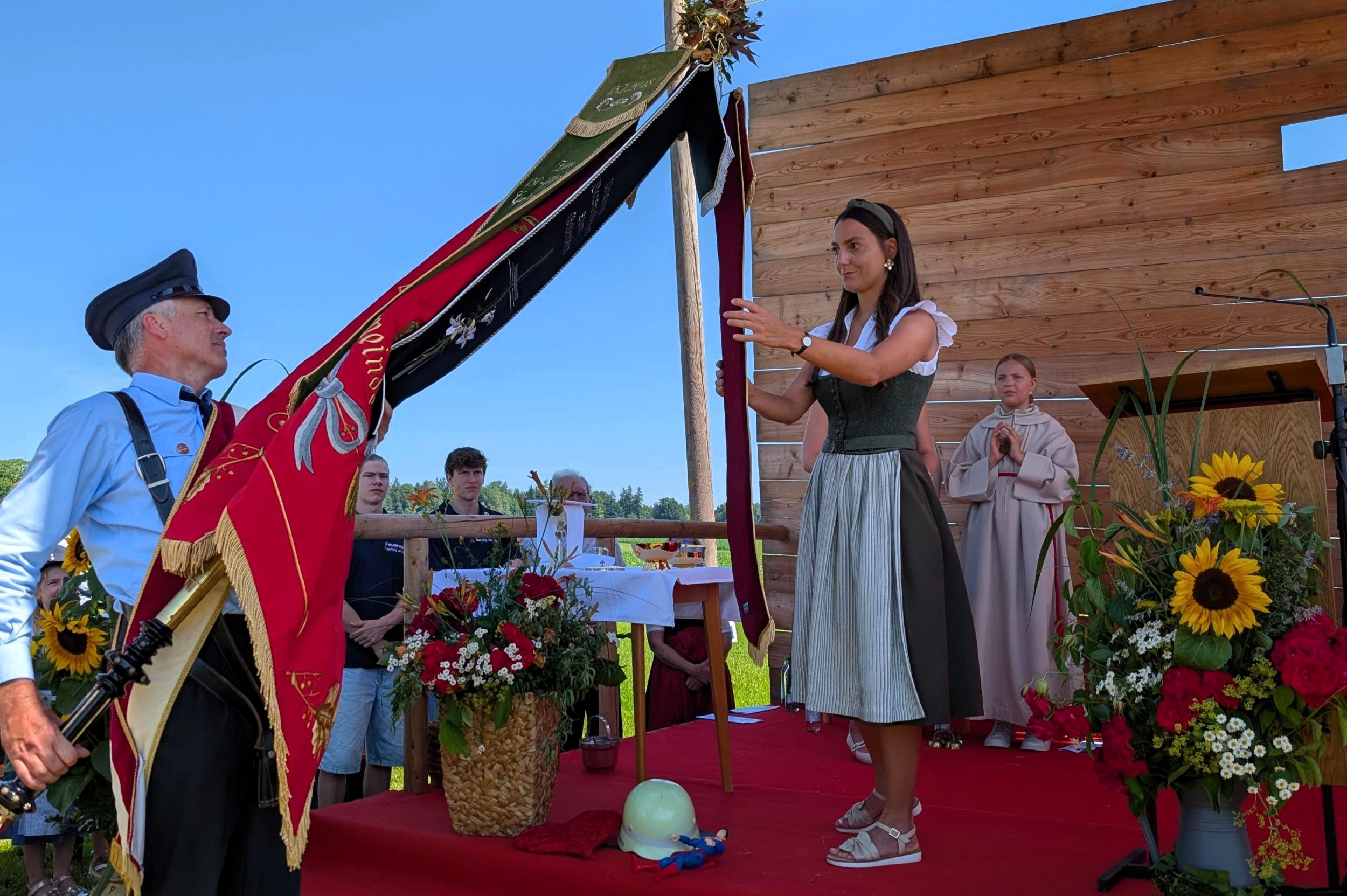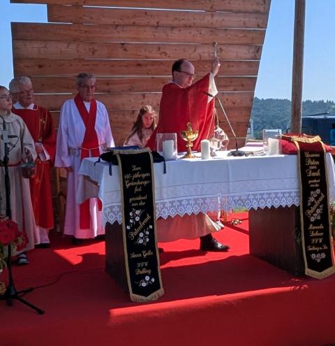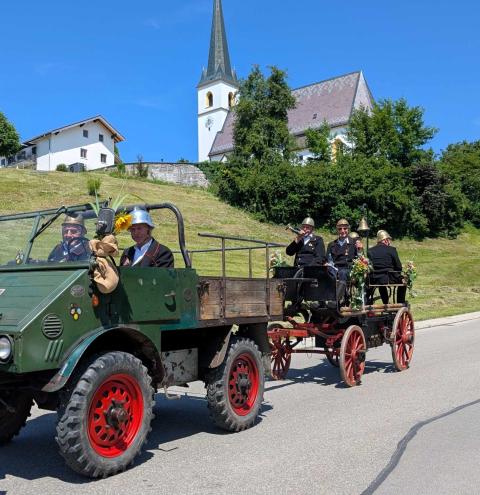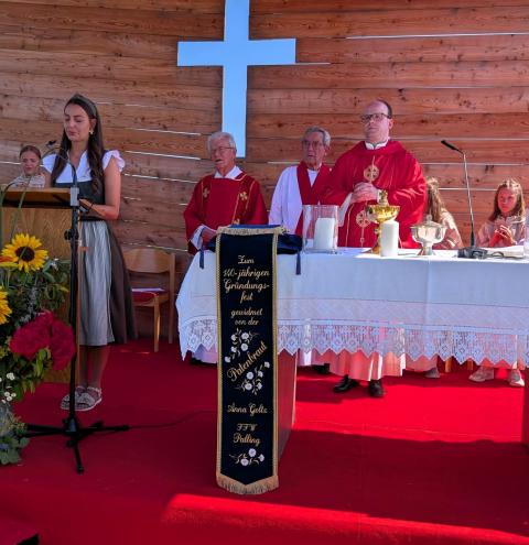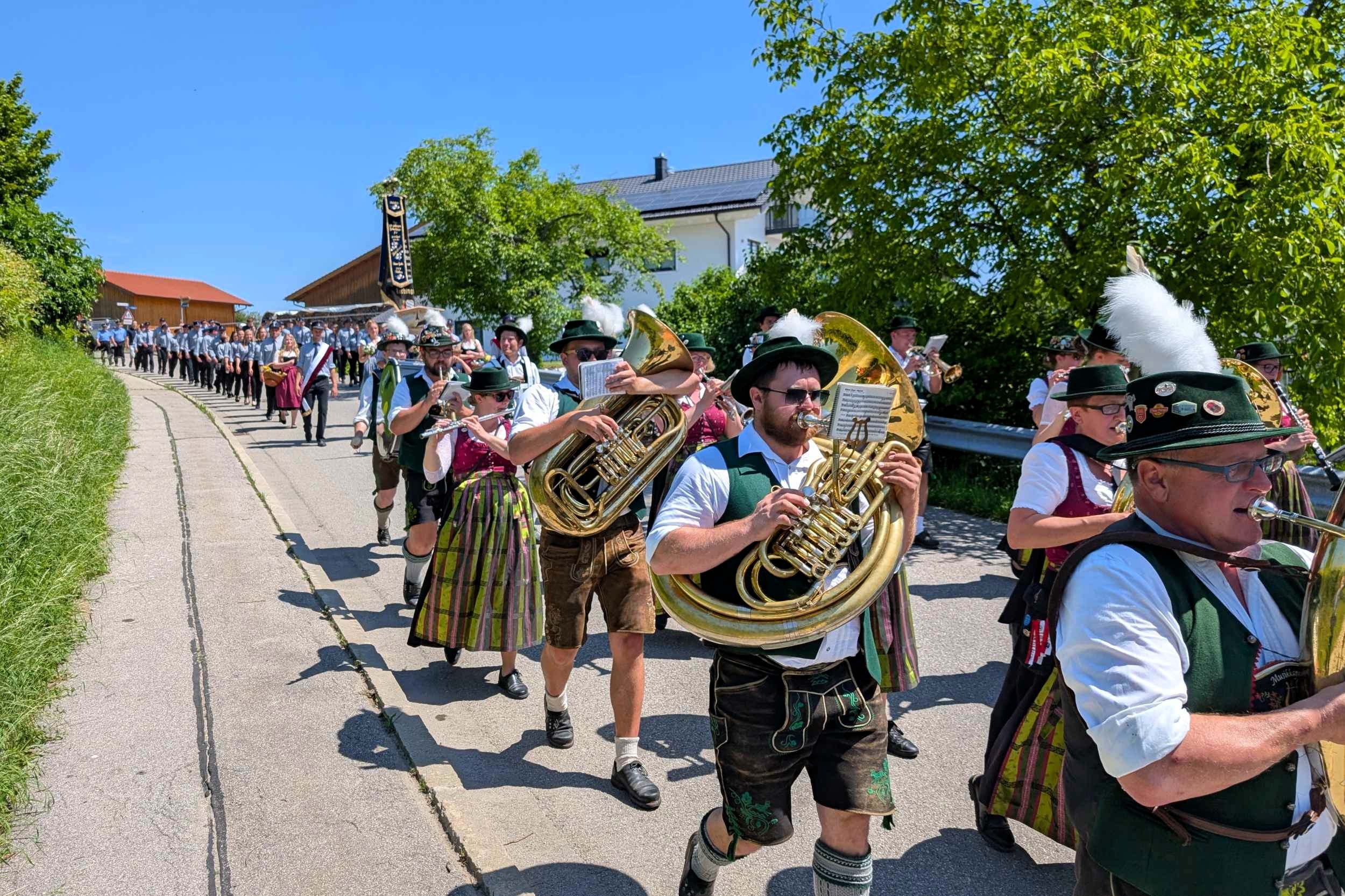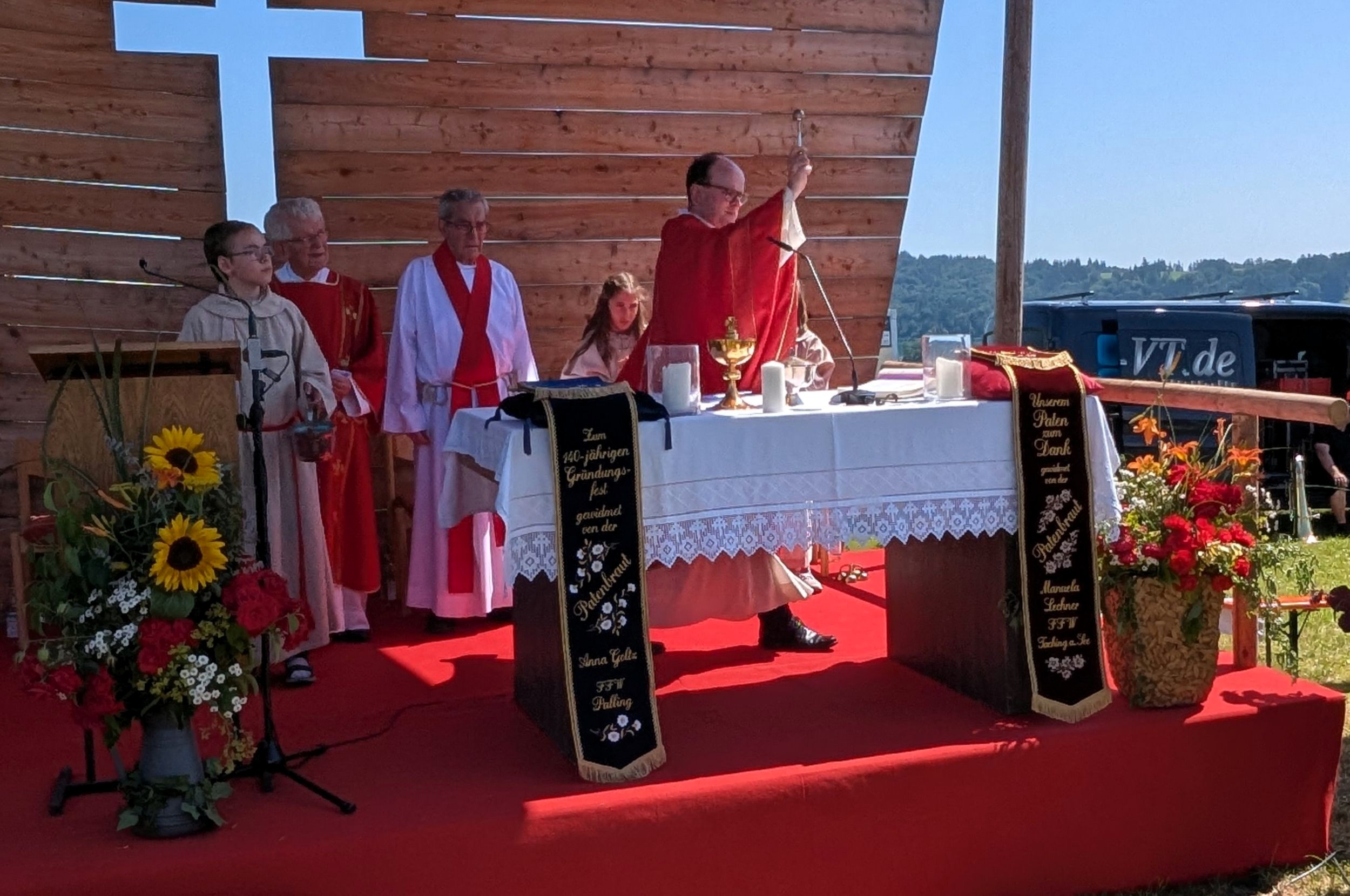 Schöner kann ein Fest nicht enden, bei strahlendem Sonnenschein führte am Sonntag ein von etwa 60 Gastvereinen begleiteter Zug auf die Wiese hinter dem Feuerwehrhaus. Dort feierte man zusammen Gottesdienst. Die heilige Messe zelebrierten gemeinsam Pfarrer Markus Nappert, Diakon Anton Lörzel, Pfarrer in Ruhestand Walter Laakmann. Für den musikalischen Rahmen sorgten der Kirchenchor unter der Leitung von Barbara Danninger und die Musikkapelle Tengling.