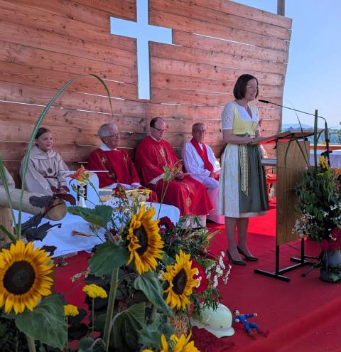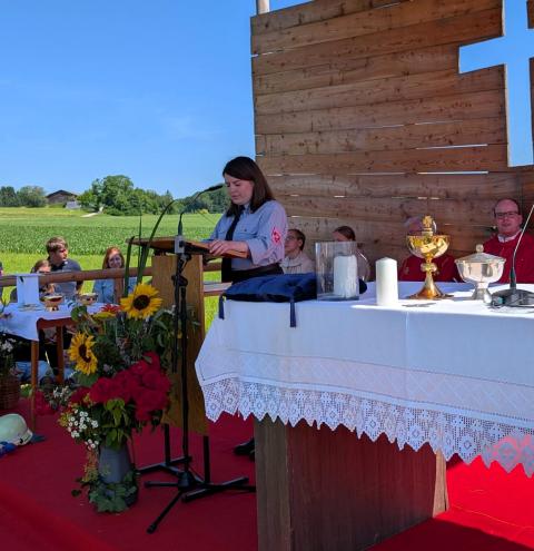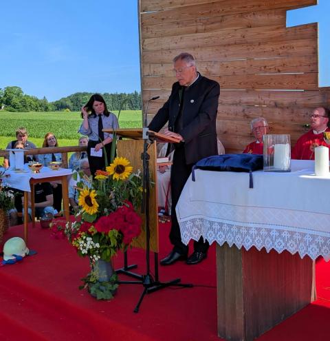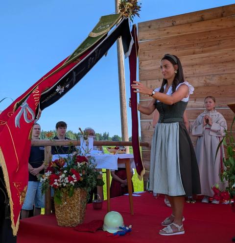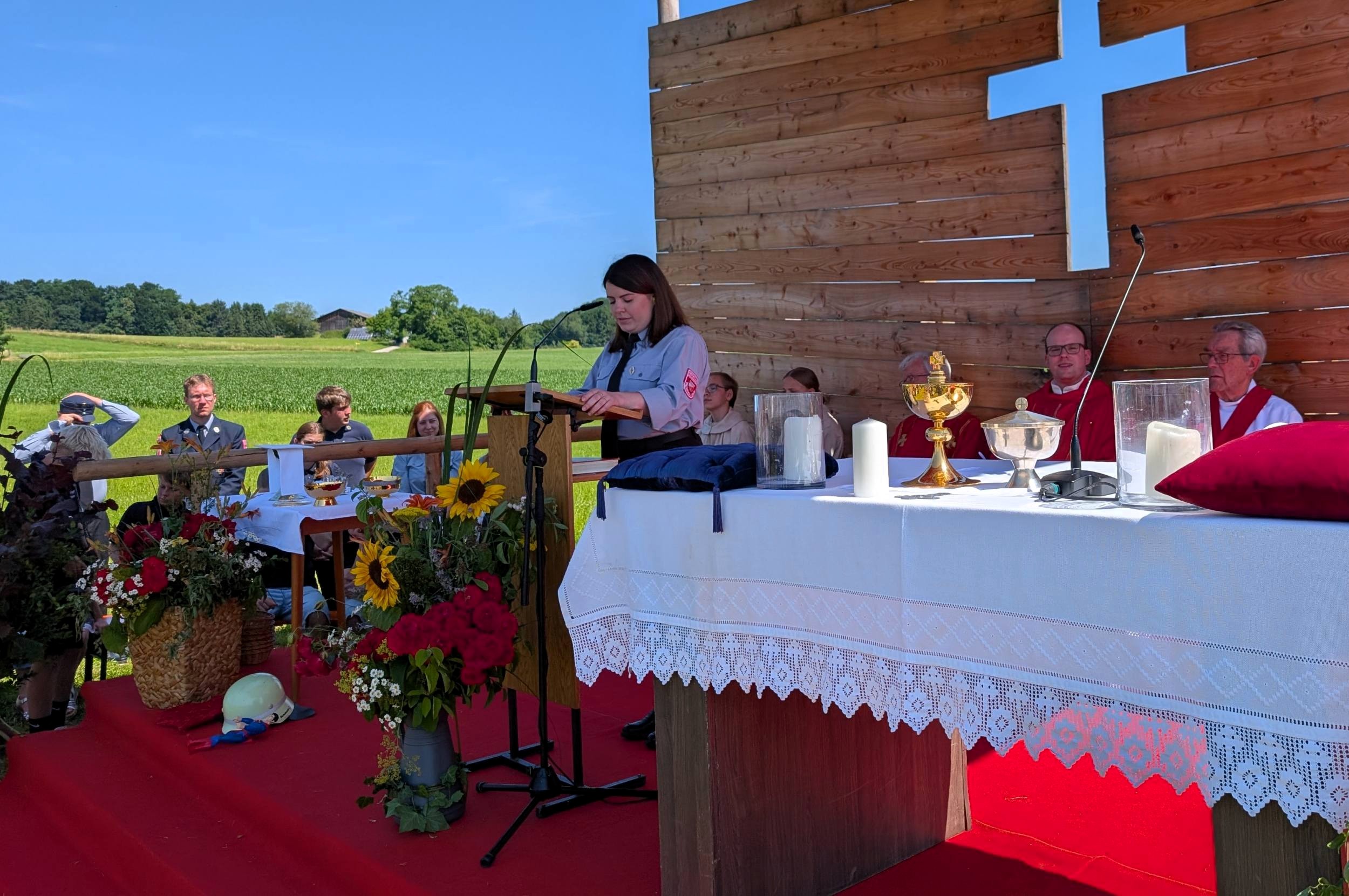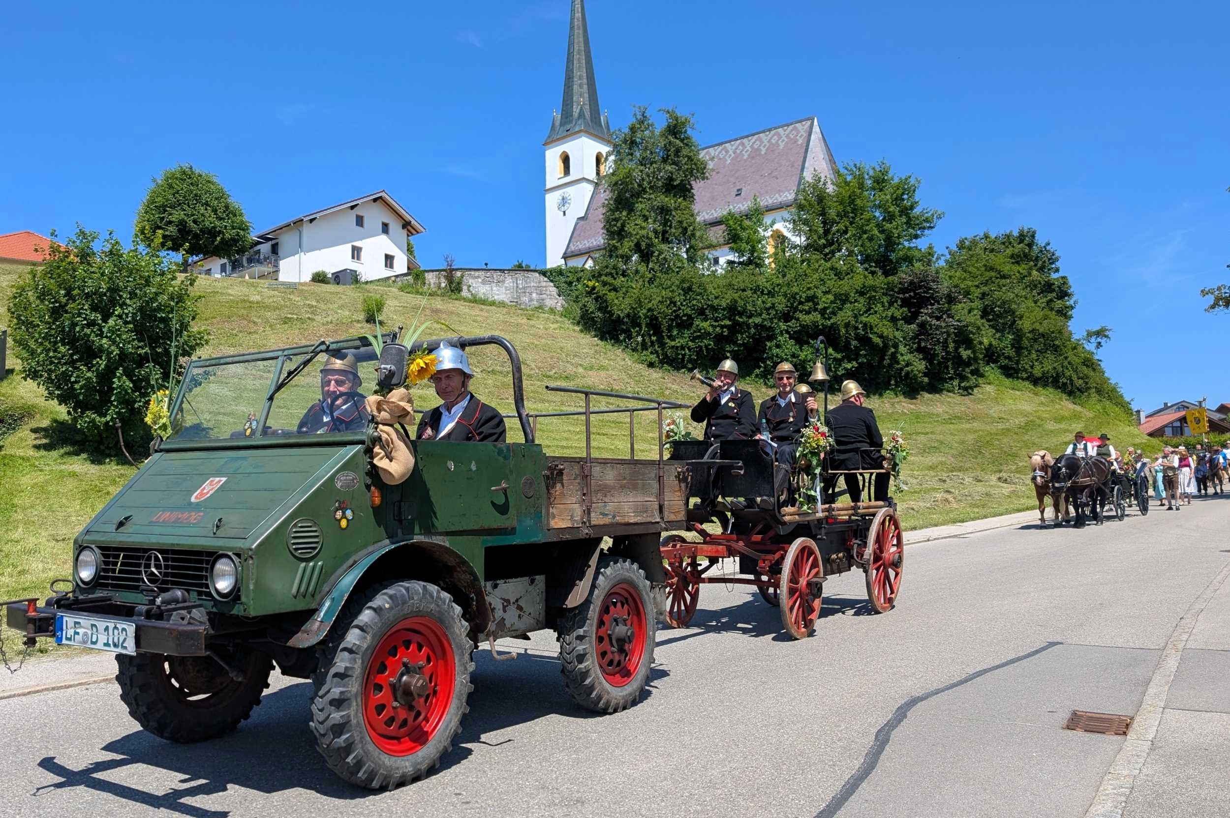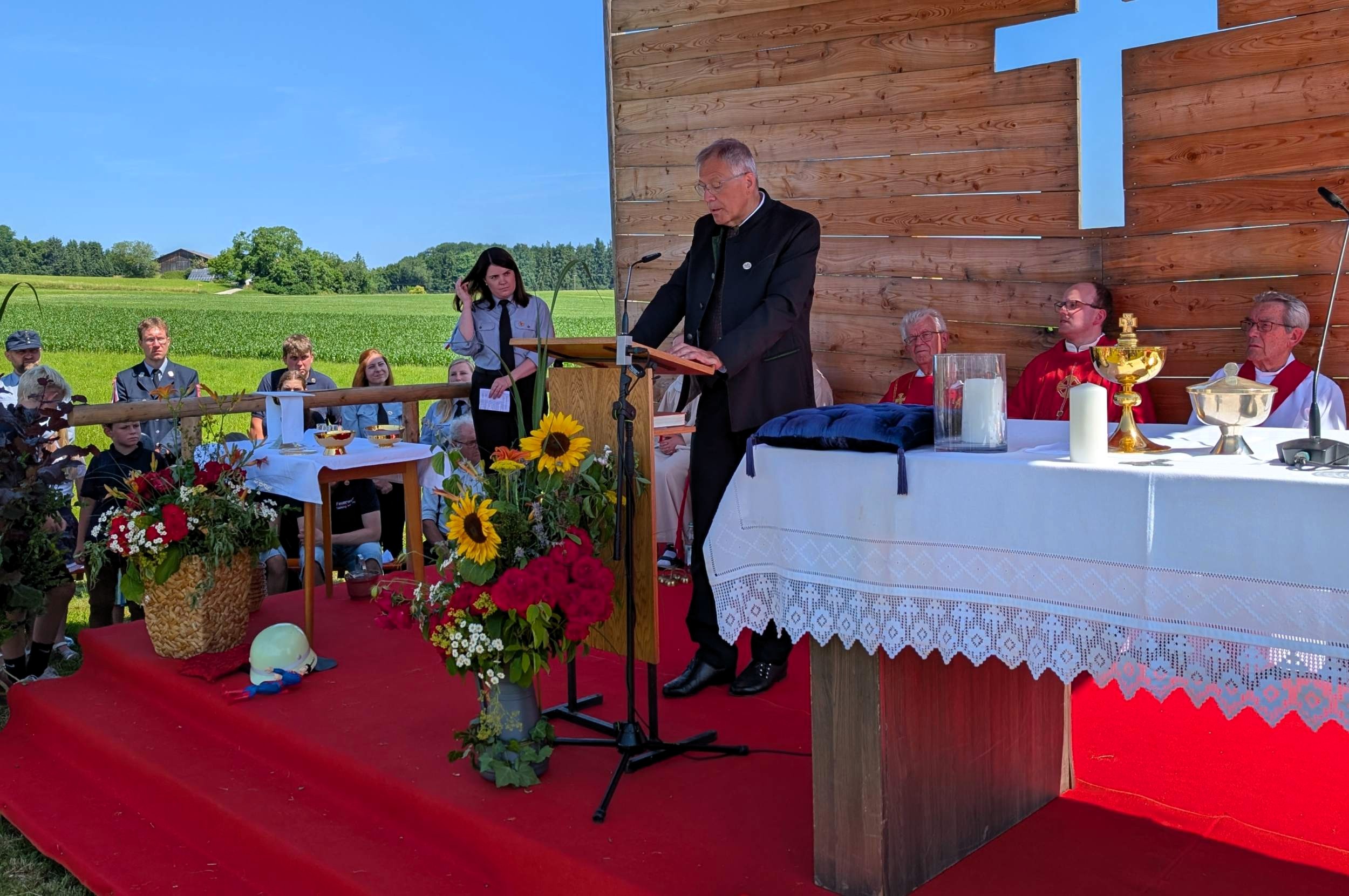 Schöner kann ein Fest nicht enden, bei strahlendem Sonnenschein führte am Sonntag ein von etwa 60 Gastvereinen begleiteter Zug auf die Wiese hinter dem Feuerwehrhaus. Dort feierte man zusammen Gottesdienst. Die heilige Messe zelebrierten gemeinsam Pfarrer Markus Nappert, Diakon Anton Lörzel, Pfarrer in Ruhestand Walter Laakmann. Für den musikalischen Rahmen sorgten der Kirchenchor unter der Leitung von Barbara Danninger und die Musikkapelle Tengling.