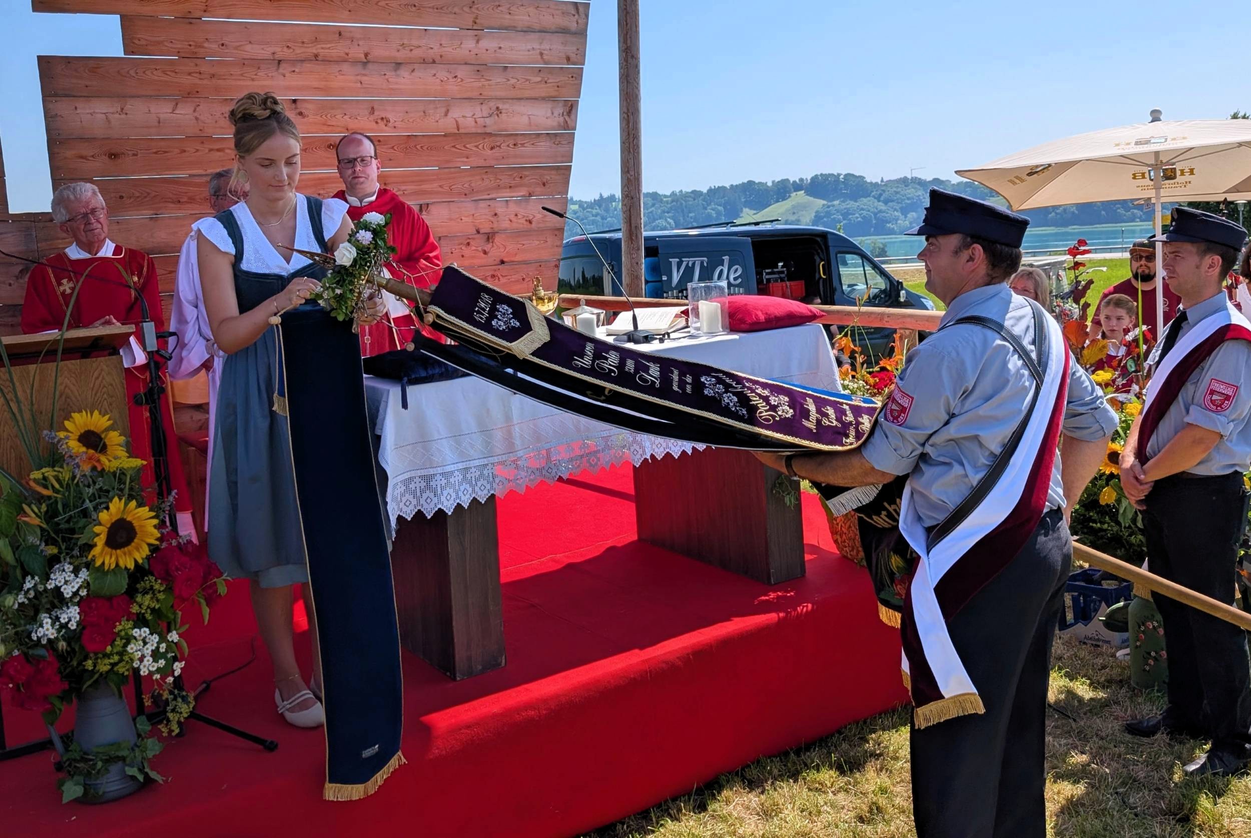 Nach erfolgter Segnung der Fahnenbänder hefteten die beiden Patenbräute Manuela Lechner aus Taching und Anna Goltz aus Palling die Bänder an die Fahnen des Fest- beziehungsweise Patenvereins. Die Glückwünsche des Landkreises Traunstein und der Feuerwehren im Landkreis Traunstein überbrachten der stellvertretende Landrat Karl Schleid und Kreisbrandrat Christof Grundner in ihren Grußworten.