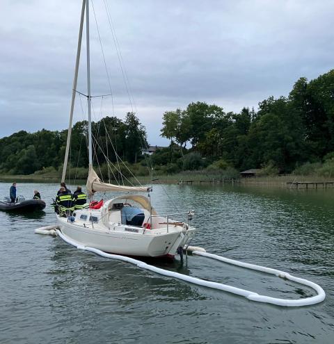 Die Feuerwehren Gstadt/Gollenshausen, Seebruck und Chieming wurden mit dem Einsatzstichwort „Öl auf Gewässer“ in den Hafenbereich bei Gollenshausen alarmiert. Vor Ort bestätigte sich ein leichter Treibstofffilm, der nach derzeitigen Erkenntnissen auf Grund eines Defekts am Zusatzmotor eines Segelbootes entstanden ist. Mit Ölsperren konnte der Bereich rasch eingegrenzt werden. Beteiligt waren Feuerwehren und Behördenvertreter aus den Landkreisen Rosenheim und Traunstein.