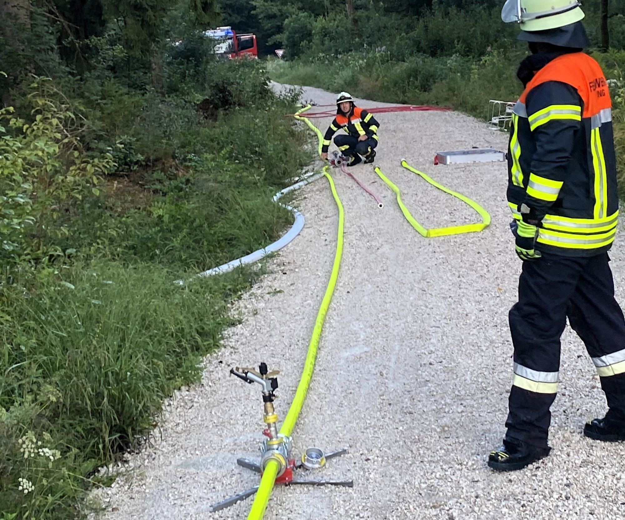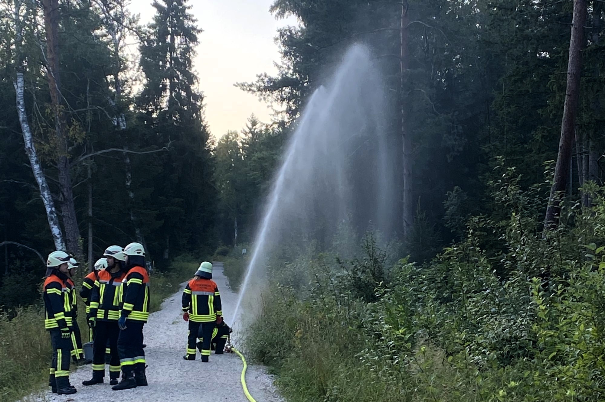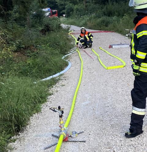 An der ersten Station wurde das herbeigeführte Löschwasser zur Errichtung einer sogenannten Riegelstellung genutzt. Mittels Strahlrohre und sogenannter Kreisregner wurde eine Feuerbarriere aufgebaut und damit die Ausbreitung des Brandes verhindert. Geleitet wurde diese Ausbildungsstation vom Pettinger Zugführer Josef Mayer, der die Inhalte ausgearbeitet und die Aktiven angeleitet hat.
