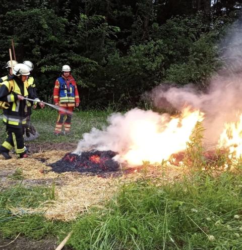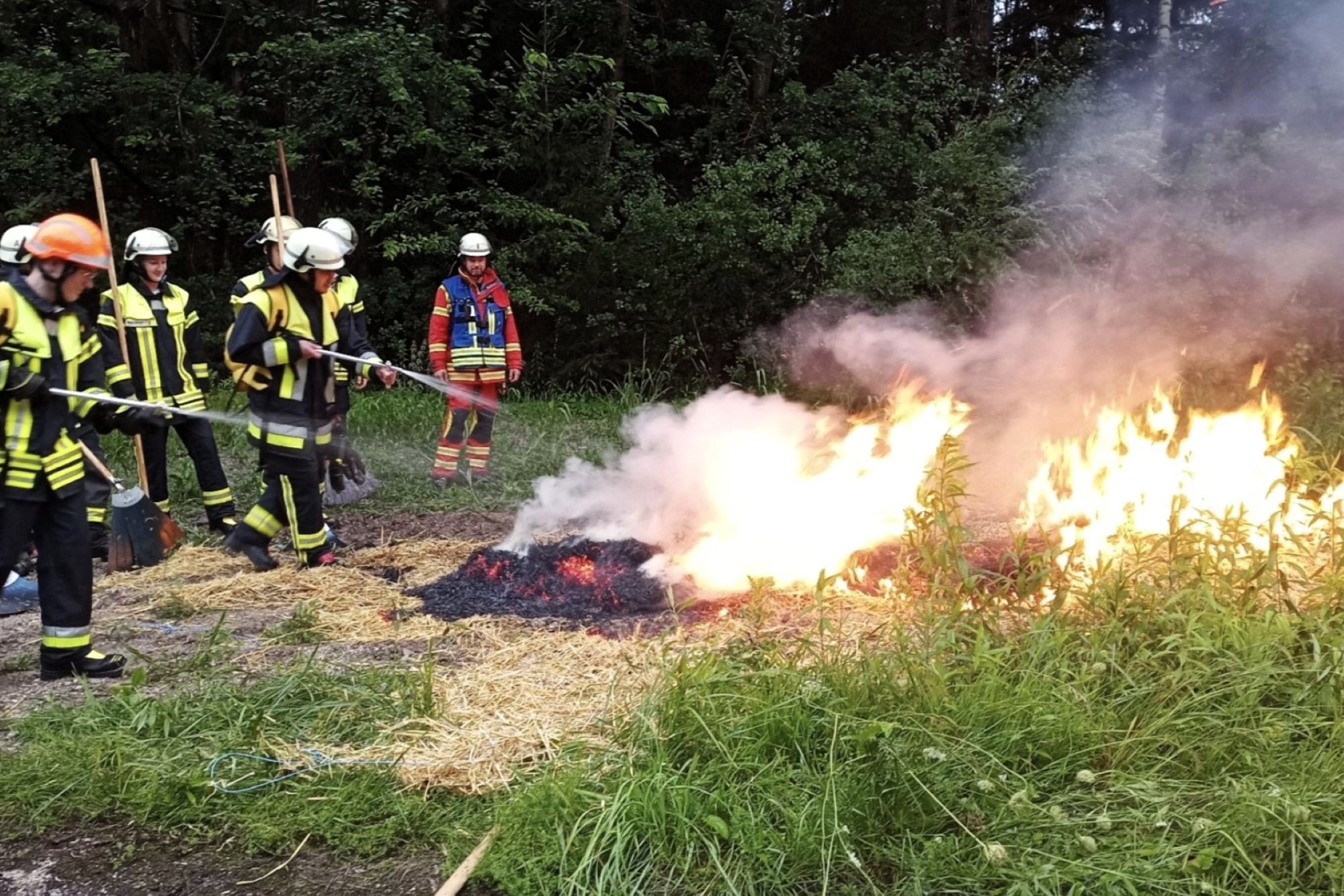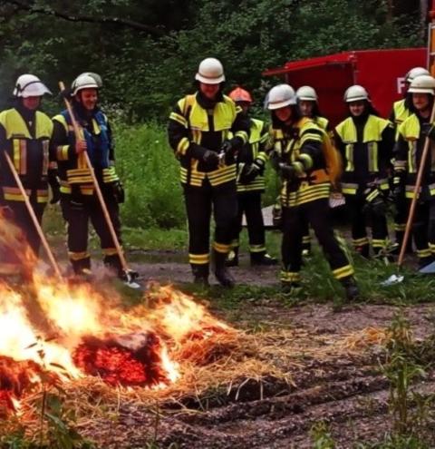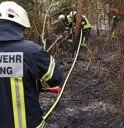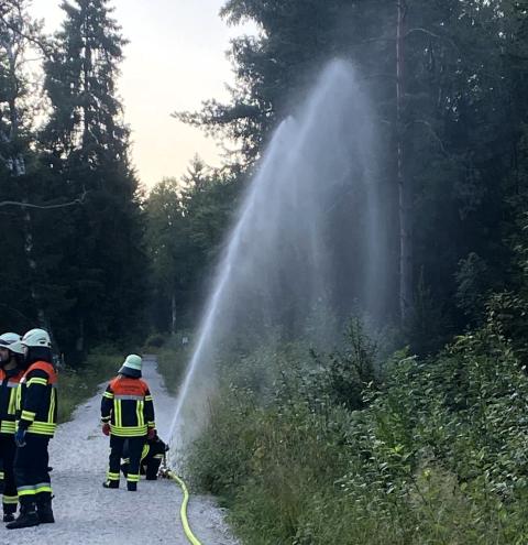 An der dritten Station trainierten die Übenden den Umgang mit Feuerpatschen sowie den Einsatz von Waldbrandrucksäcken zur Brandbekämpfung. Gleichzeitig befassten sich dort die Teilnehmer mit dem Anlegen und der Verteidigung von sogenannten „Wundstreifen“, also einem vegetationsfreien Abschnitt. Diese Schneisen sollen bei echten Bränden einen Feuerüberschlag auf weitere Waldbereiche verhindern. Diesen Ausbildungsabschnitt betreuten die Kommandanten Wolfang Sedlmayer aus Nirnharting und Michael Schramke von der Feuerwehr Waging am See.