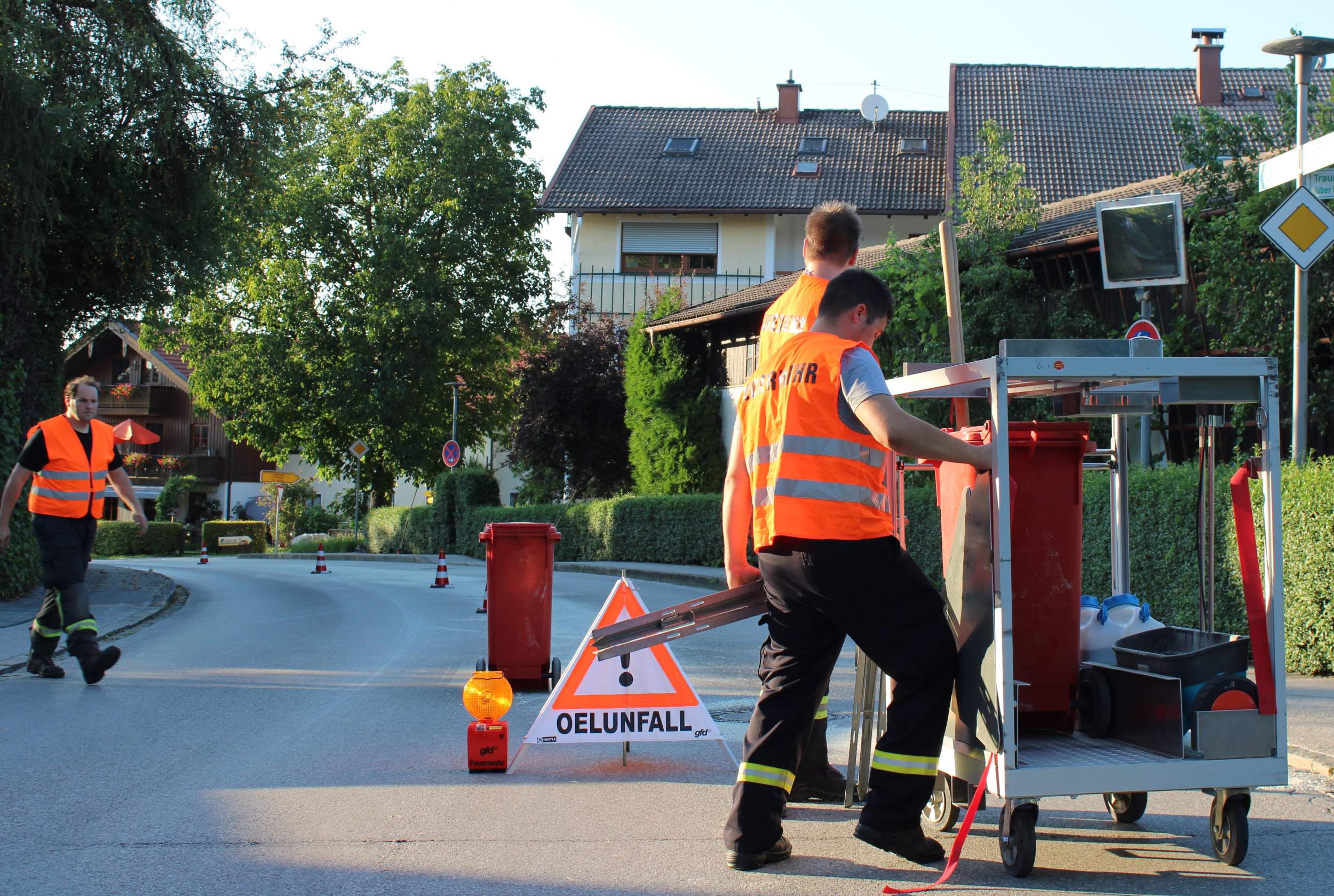 Traunstein, Kammer. Die Feuerwehr Kammer wurde am Montagabend (15.7.) gegen 18:45 Uhr zu einer Ölspur im Ortsteil Rettenbach gerufen. Die Spur zog sich über einige hundert Meter von der Buchleite über die Kreisstraße TS 1 bis in die Reichsberger Straße. Dort konnte ein Mähdrescher als Ursache ausgemacht werden. Bei dem Öl handelte es sich um Hydrauliköl, dass nicht ohne weiteres gebunden werden konnte. Insbesondere im Kurvenbereich der Kreisstraße war die Fahrbahn sehr rutschig. Daher hat sich der Vertreter des Kreisbauhofes entschieden, eine Spezialkehrmaschine aus dem Landkreis Rosenheim anzufordern, um die Fahrbahn reinigen zu lassen und die Rutschgefahr zu beseitigen. Nach etwa drei Stunden konnte halbseitige Sperre der TS 1 aufgehoben werden. Neben 16 Einsatzkräften der Feuerwehr war zwei Vertreter Straßenmeisterei des Landkreises sowie eine Polizeistreife vor Ort. Hob
