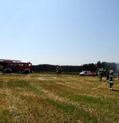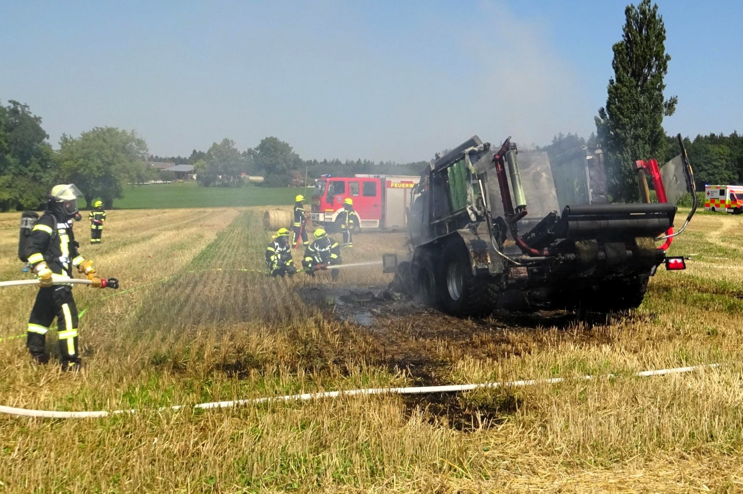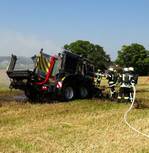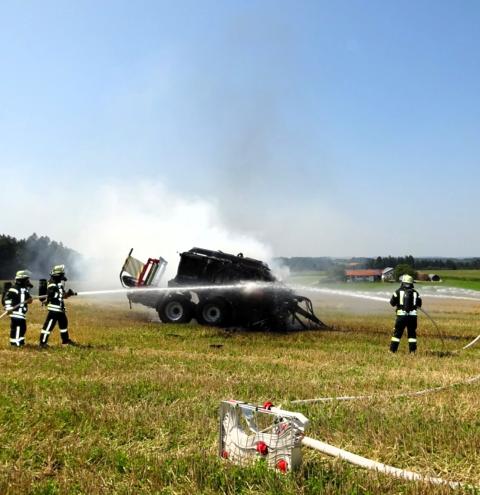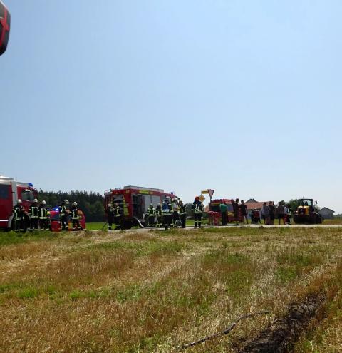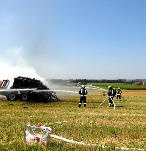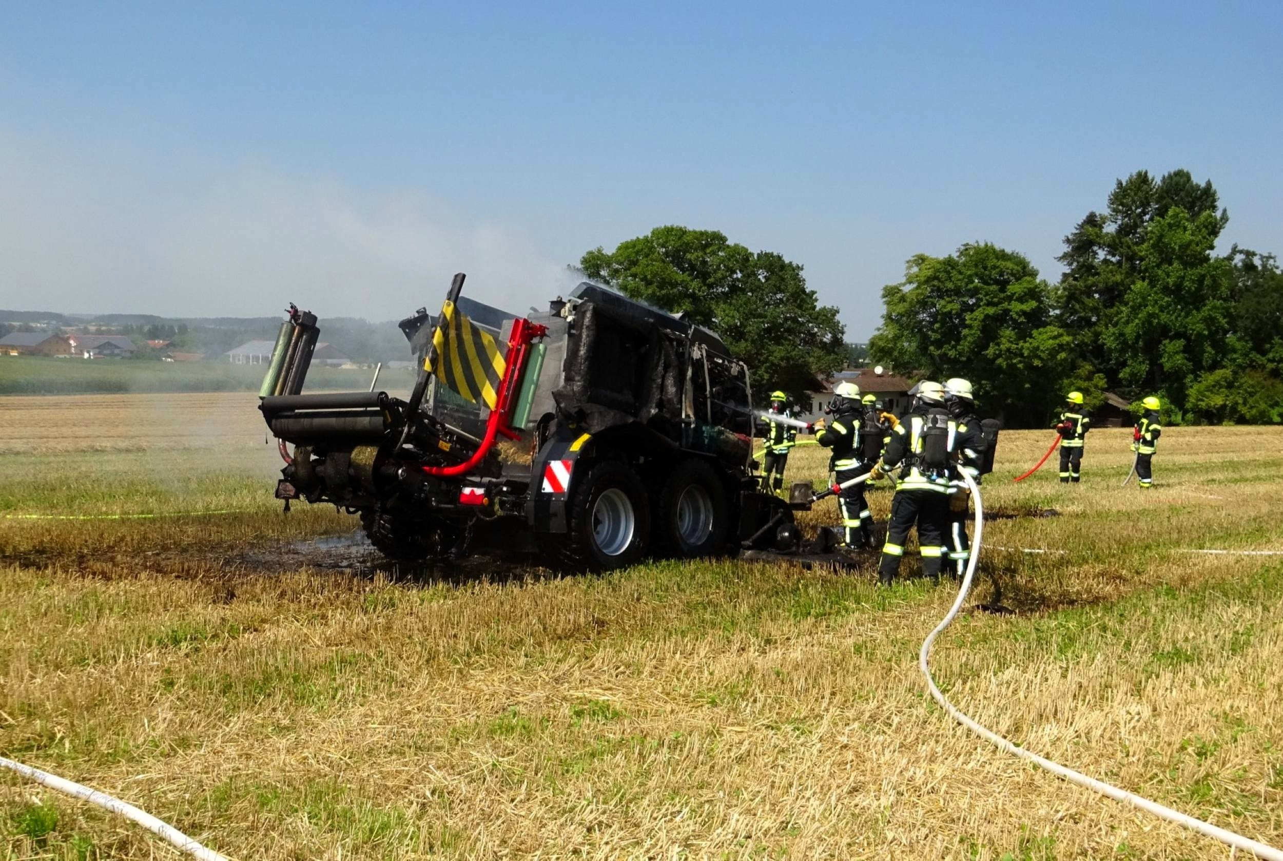 Tacherting. Die Feuerwehr Tacherting wurde am Montagmittag gegen 13 Uhr zusammen mit mehreren Nachbarfeuerwehren mit dem Einsatzstichwort „B3 – Brand landwirtschaftliche Maschine“ auf ein Feld im Ortsteil Brandstätt alarmiert. Bei Eintreffen der Feuerwehren stand eine Ballenpresse in Vollbrand. Der dazugehörige Traktor konnte vom Landwirt rechtzeitig abgekuppelt und in Sicherheit gebracht werden. Der Sachschaden liegt nach einer ersten Schätzung der Feuerwehr deutlich im sechsstelligen Bereich. Verletzt wurde glücklicherweise niemand. Als Ursache wird derzeit von einem technischen Defekt ausgegangen.