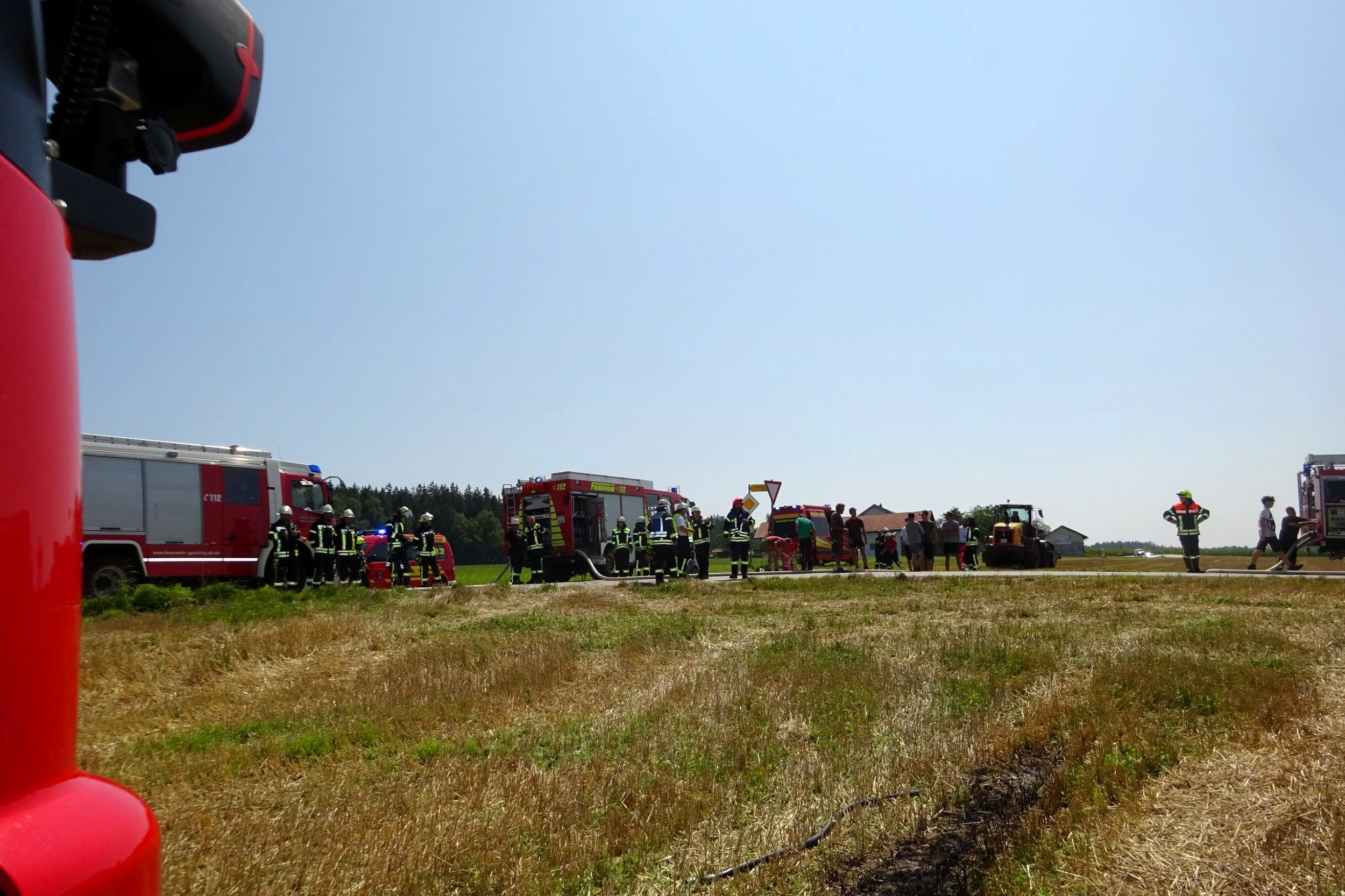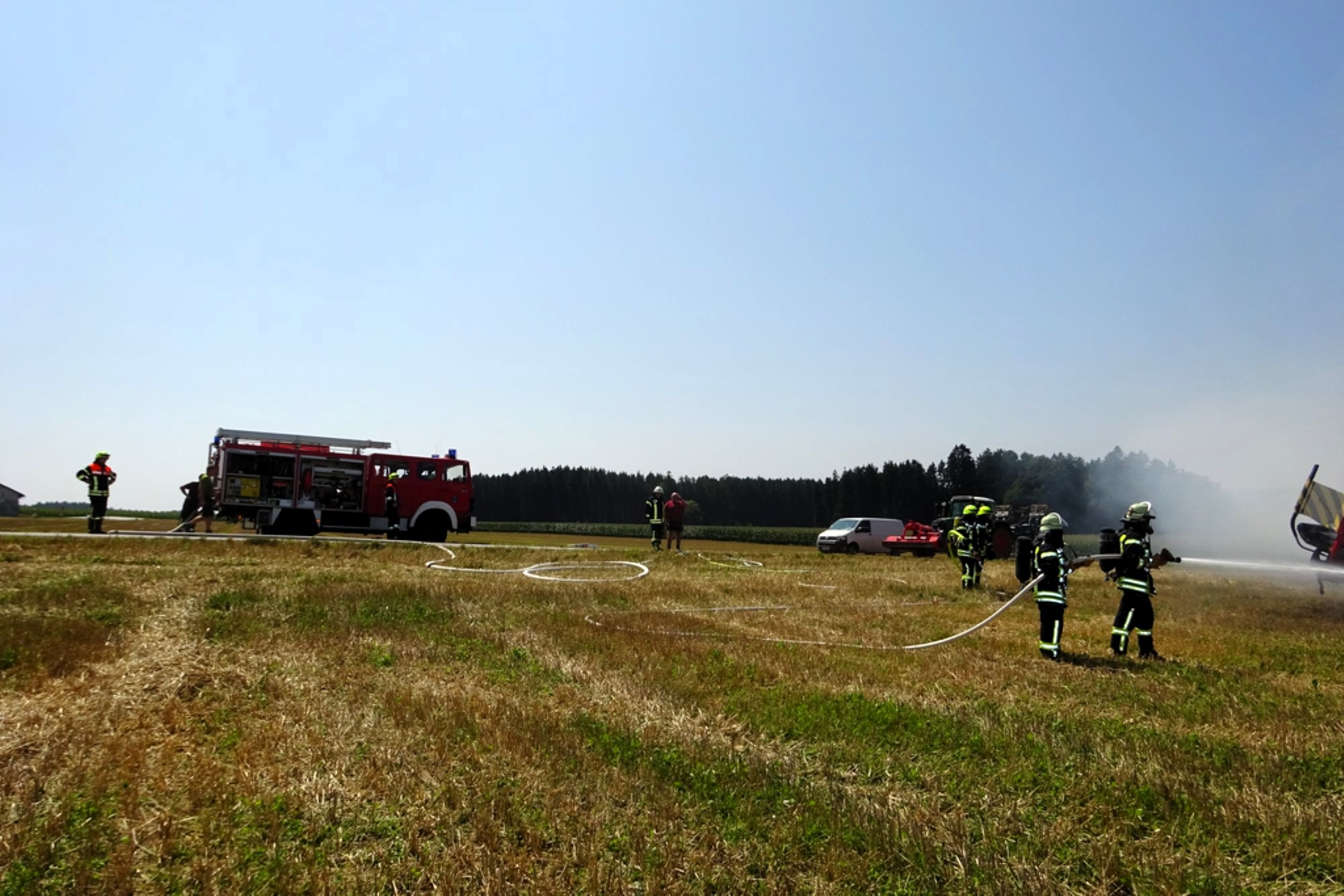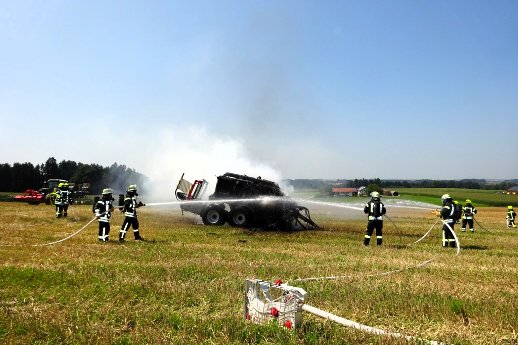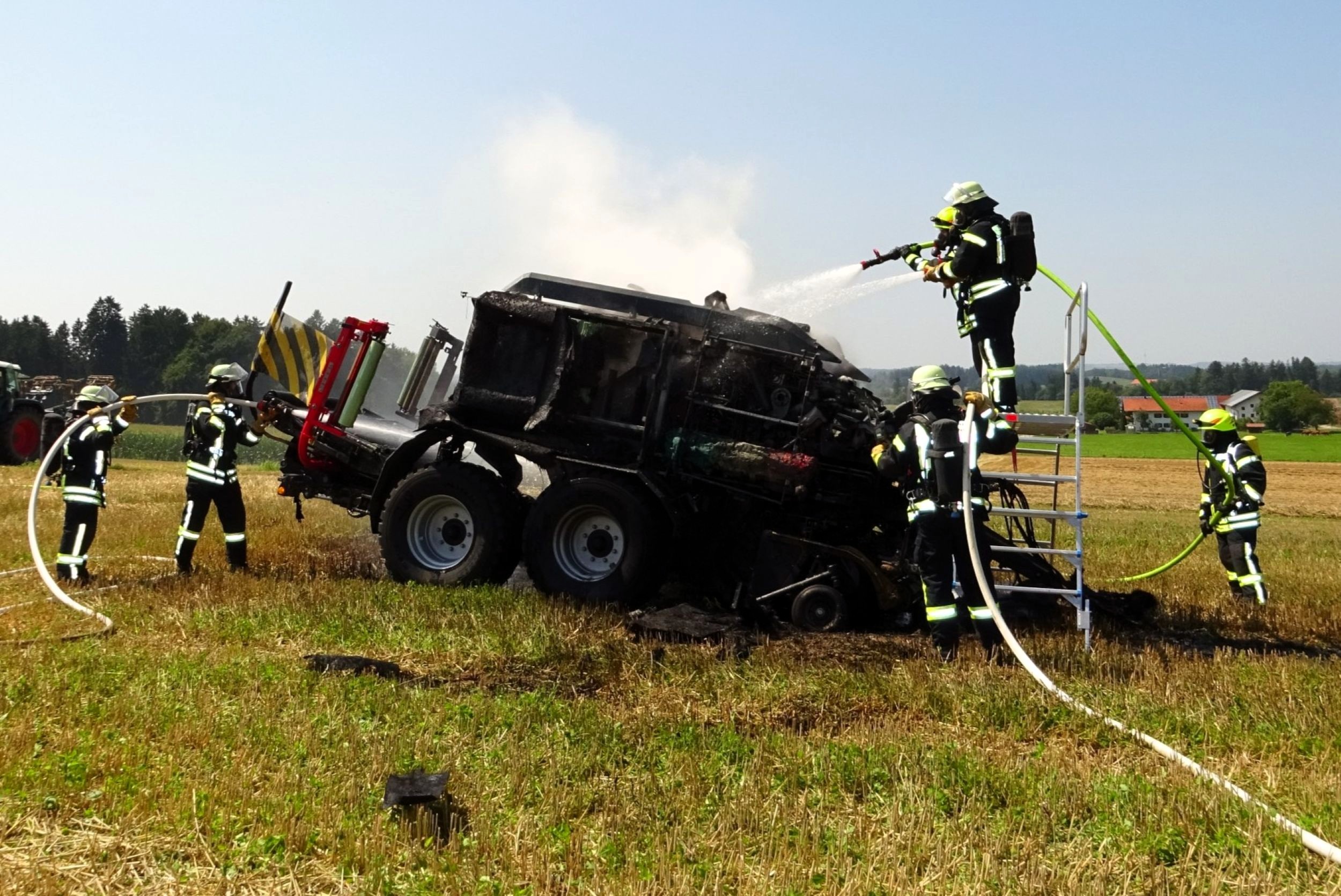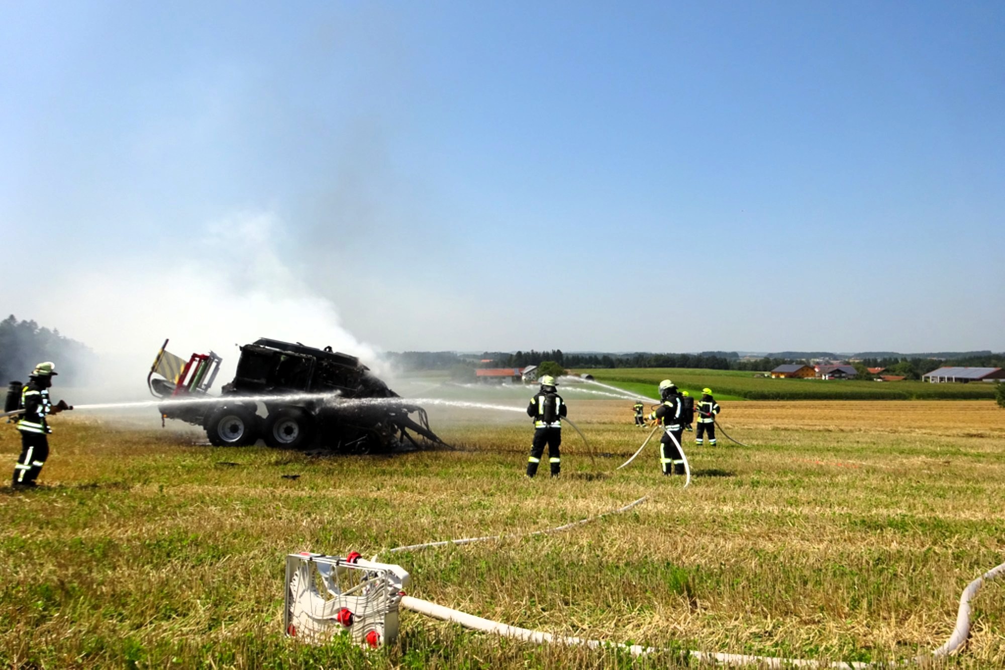 „Bei unserem Eintreffen stand schnell fest, dass ein Totalschaden an der Erntemaschine nicht mehr zu verhindern ist“, informiert der Einsatzleiter und stellvertretende Kommandant Oliver Brandl von der Feuerwehr Tacherting und ergänzt, „deshalb hab wir uns bei der Brandbekämpfung auf das Ablöschen der Maschine und die Verhinderung der Ausbreitung konzentriert“. Rund 20 Minuten nach Einsatzbeginn hatten die Feuerwehren die Lage unter Kontrolle und konnten zu Nachlöscharbeiten übergehen.