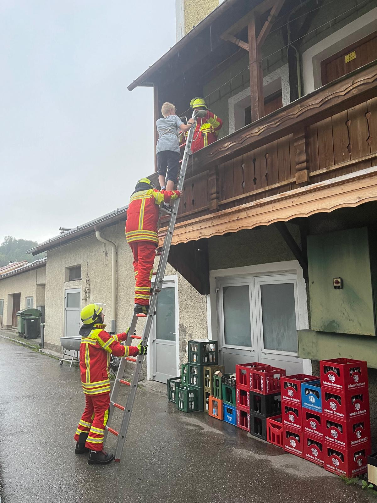 Der Hilfesuchende auf dem Balkon war Christoph Groschack, der Sohn von Anton Groschack, der begeistert und äußerst realistisch seine Rolle spielte. Die erste Aufgabe war dann auch die Personenrettung vom Balkon über eine Steckleiter. Dabei war auch schauspielerisches Talent gefragt, denn ganz so einfach wollte die Übungsleitung es den Einsatzkräften dann auch nicht machen – es solle ja schließlich wie bei einem „echten“ Brand sein.