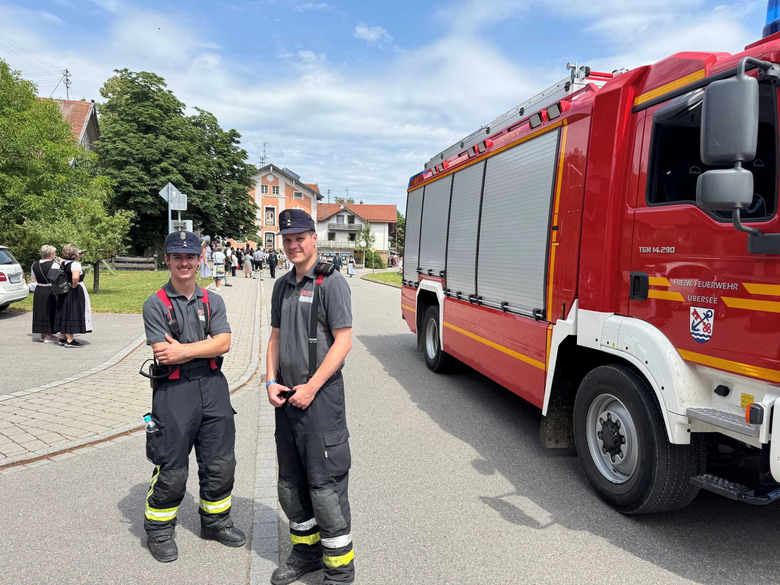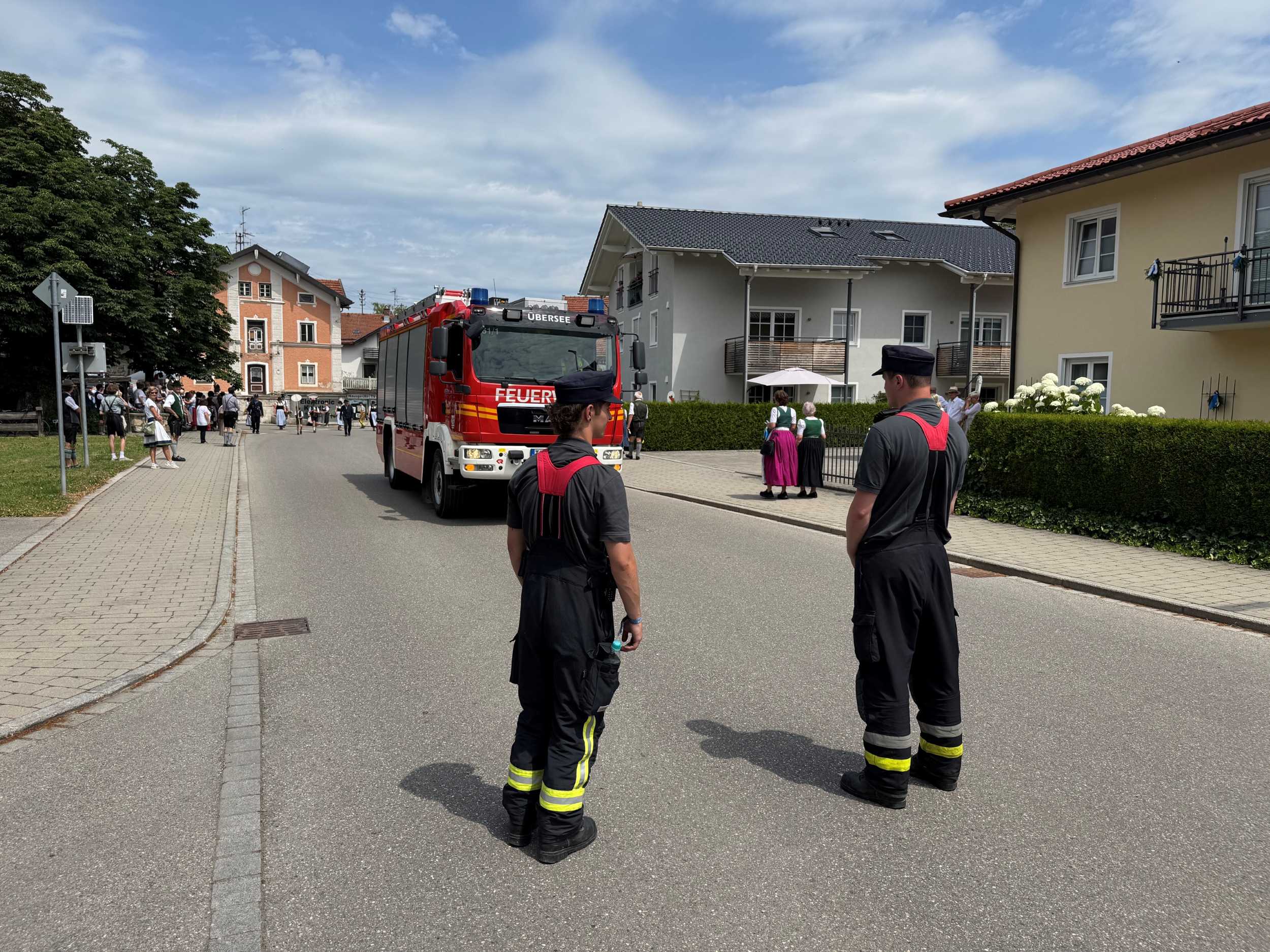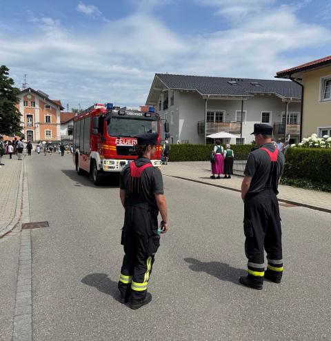 „Die Zusammenarbeit zwischen Feuerwehr, Polizei und Rettungsdienst hat einwandfrei funktioniert“, freut sich Lucas Geppert und ergänzt, „dadurch konnte ein störungsfreier und reibungsloser Festverlauf gewährleistet werden“. Eine Fahrzeugbesatzung der Feuerwehr Übersee war eigens dafür abgestellt, den sogenannten Grundschutz für die Gemeinde sicherzustellen. Damit wurde gewährleistet, dass im Falle weiterer Einsätze eine schnelle Hilfe durch die Feuerwehr möglich war. „Die Löschfahrzeugbesatzung musste jedoch glücklicherweise nicht ausrücken“, informiert der Einsatzleiter.